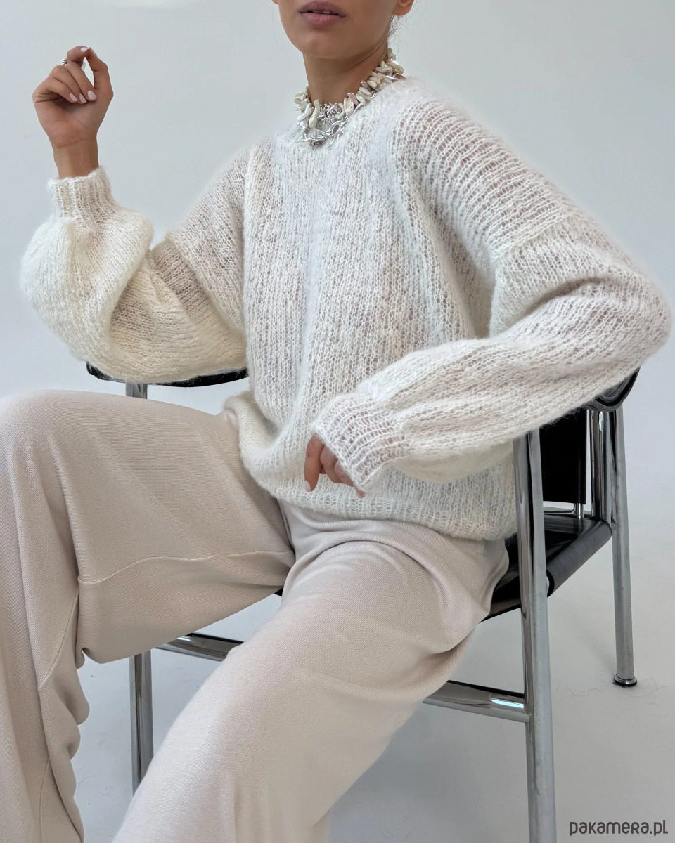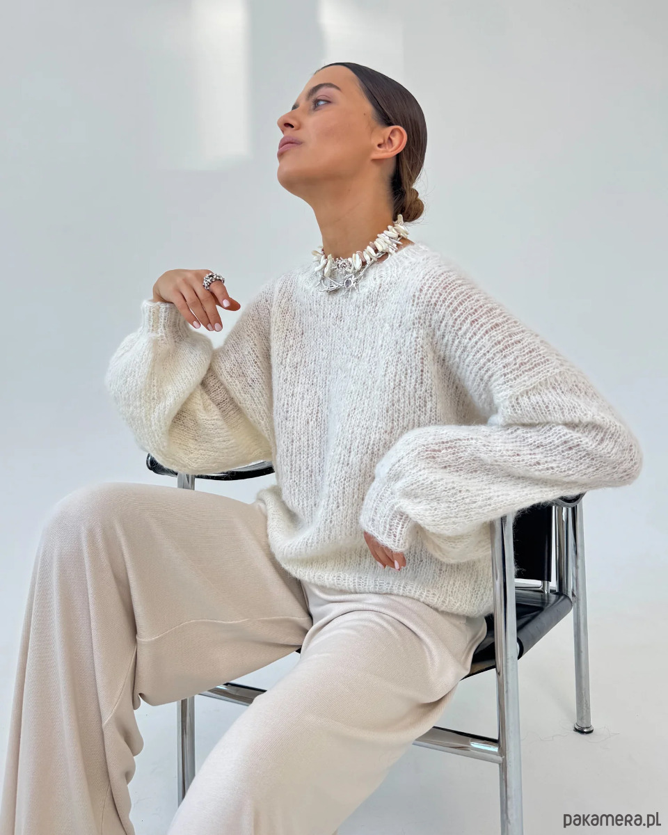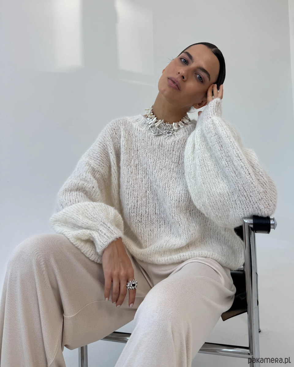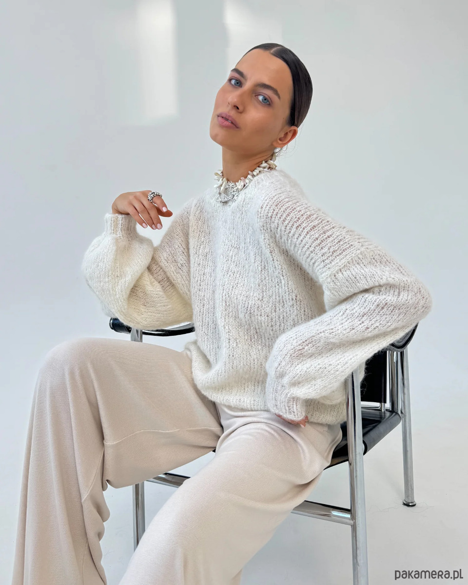 Sweter powstał z najlepszej jakości jedwabnej przędzy z dodatkiem alpaki, co sprawia, że jest przewiewny, lekki i ażurowy, a jednocześnie otula ciepłem w chłodniejsze dni. To luksusowa propozycja, która sprawdza się przez cały rok – wiosną i latem wygląda lekko i elegancko, a jesienią i zimą grzeje i dodaje stylizacji wyjątkowej głębi.