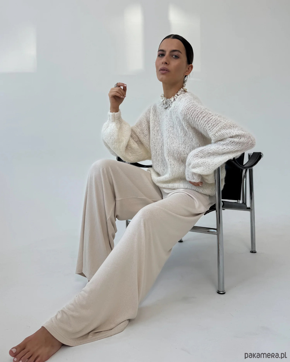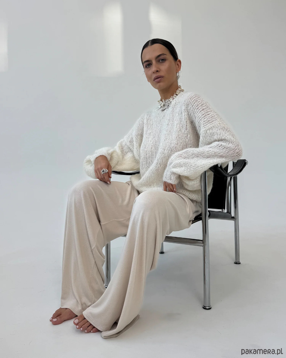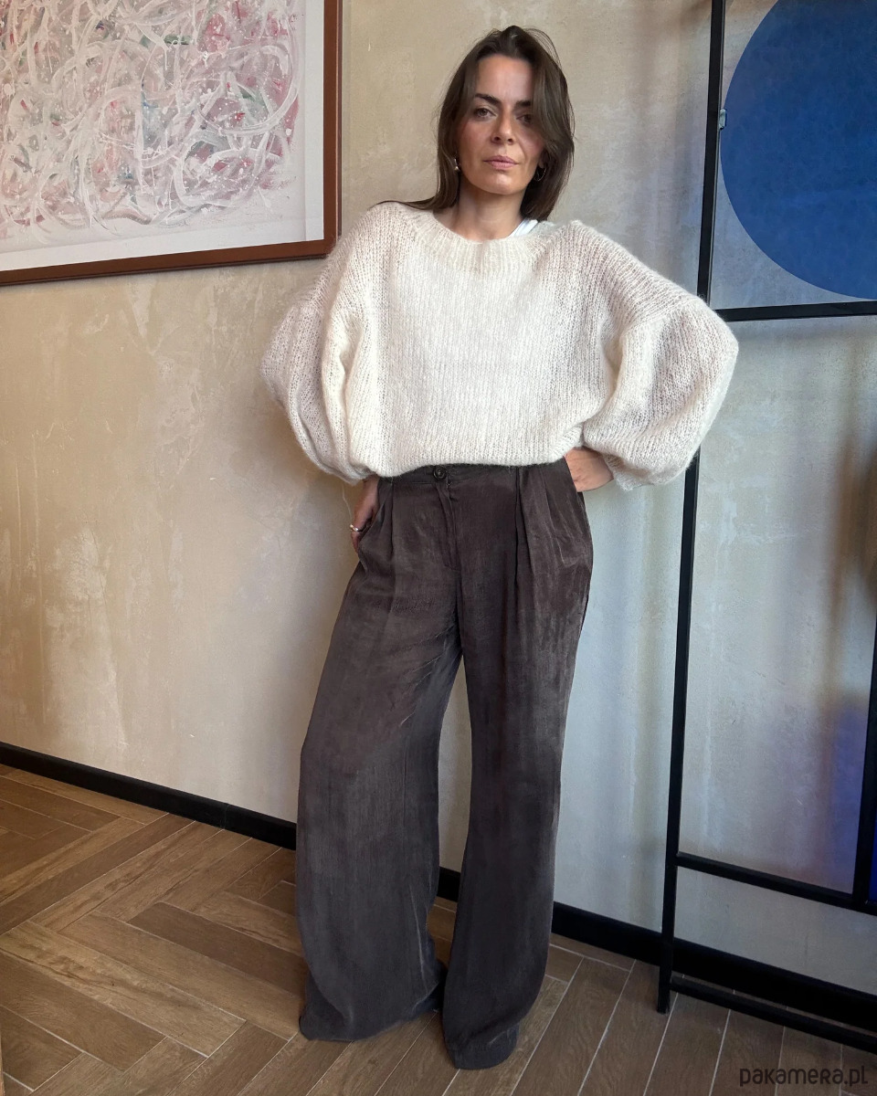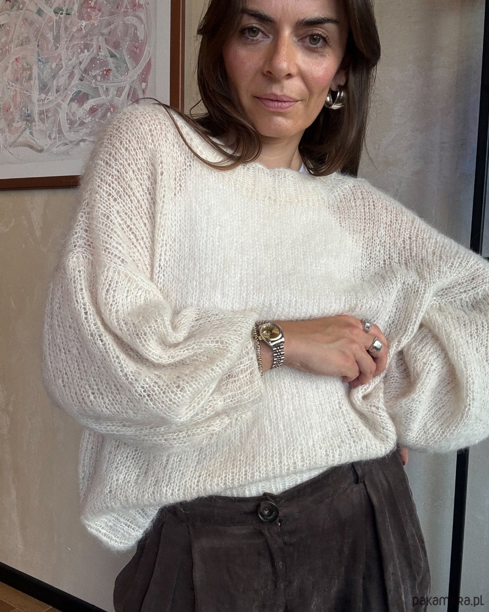 Sweter powstał z najlepszej jakości jedwabnej przędzy z dodatkiem alpaki, co sprawia, że jest przewiewny, lekki i ażurowy, a jednocześnie otula ciepłem w chłodniejsze dni. To luksusowa propozycja, która sprawdza się przez cały rok – wiosną i latem wygląda lekko i elegancko, a jesienią i zimą grzeje i dodaje stylizacji wyjątkowej głębi.