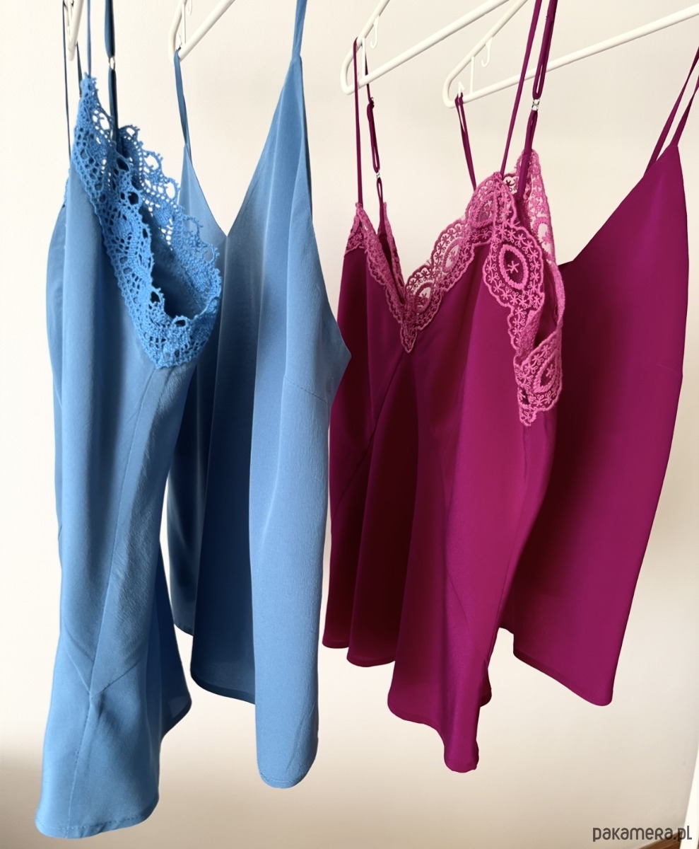 Ten model posiada cienkie, nieregulowane ramiączka, które podkreślają linię ramion i nadają całości minimalistycznego, kobiecego wyglądu.