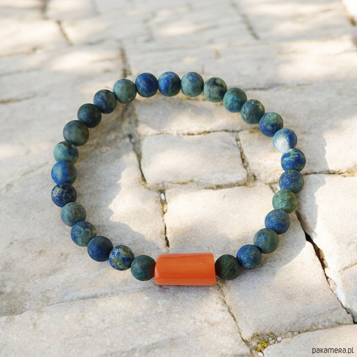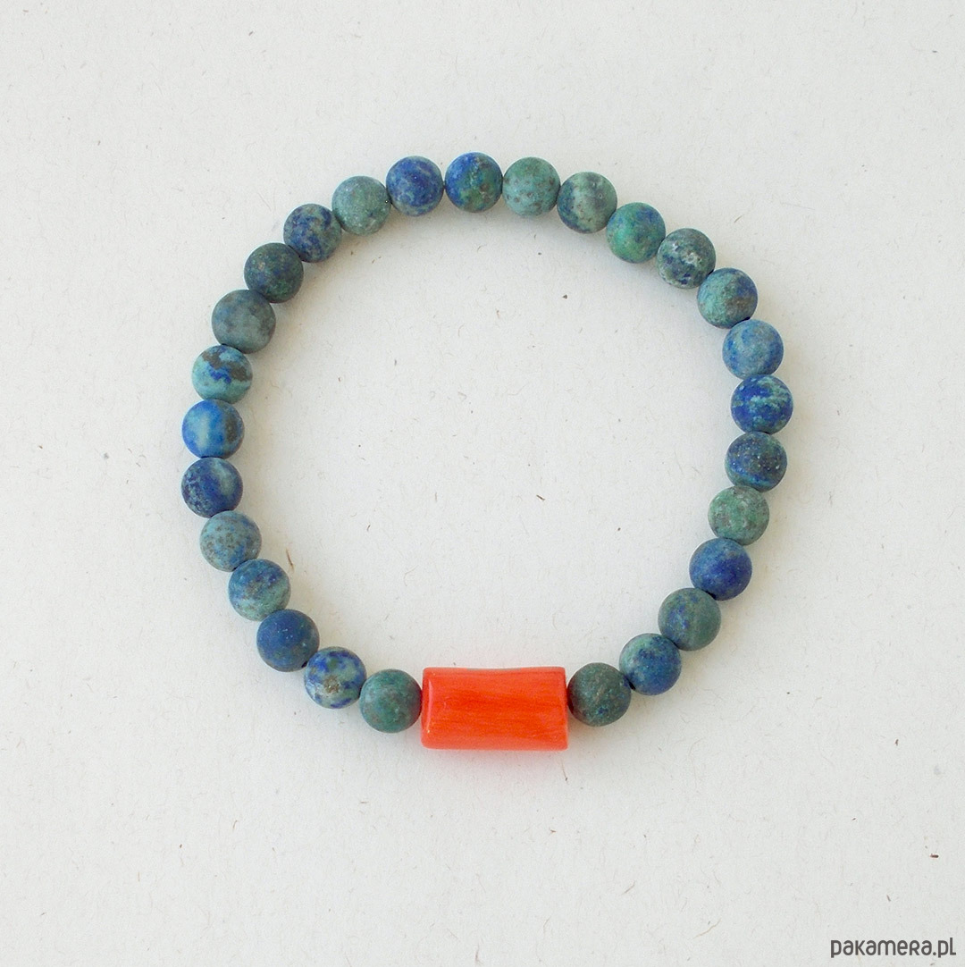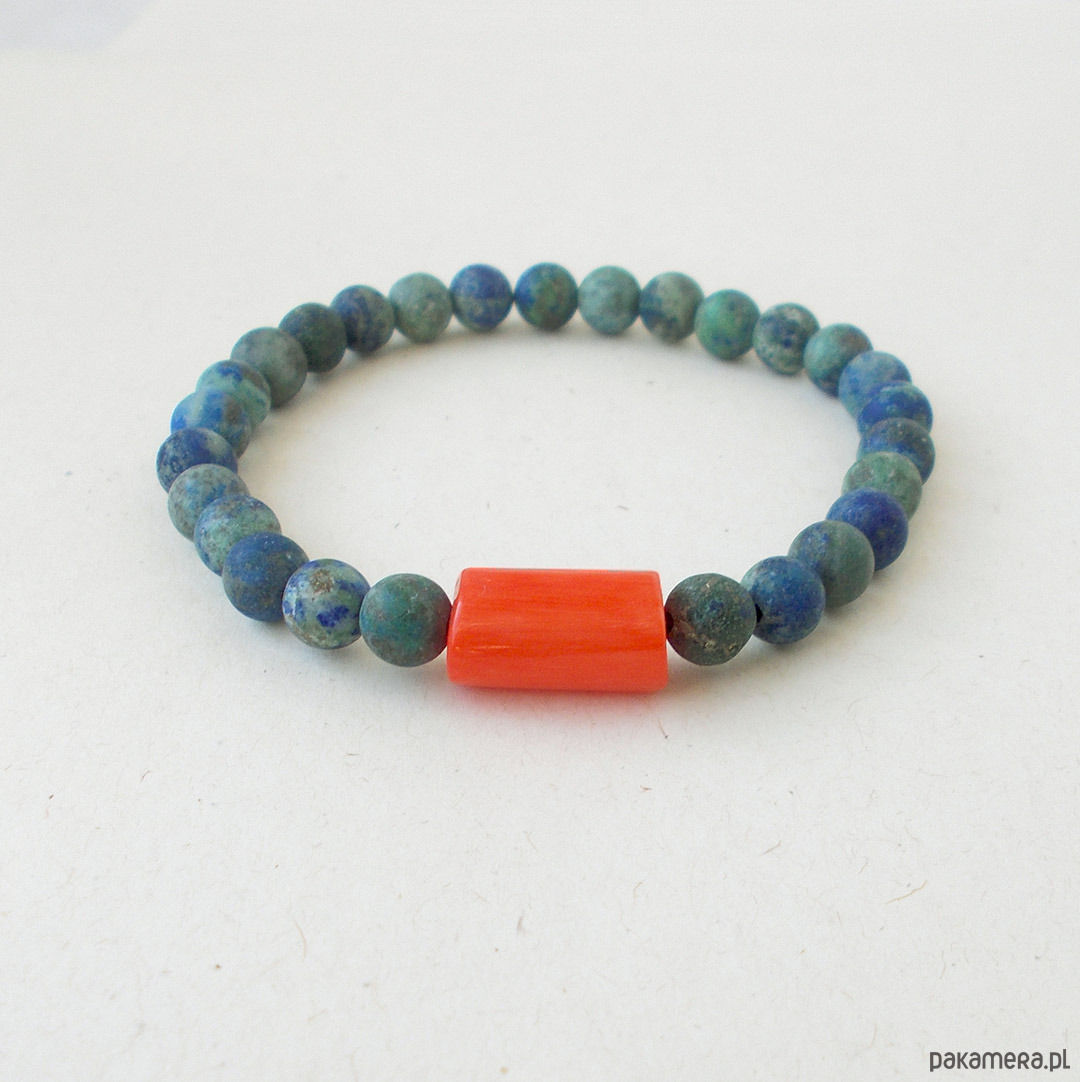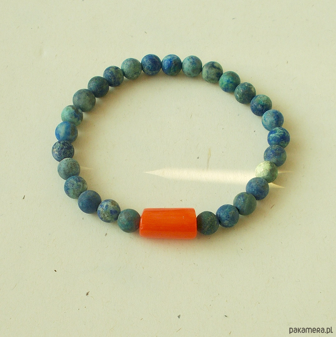 koral łososiowy 14x8 mm, chryzokola matowe kulki 6 mm, solidna gumka