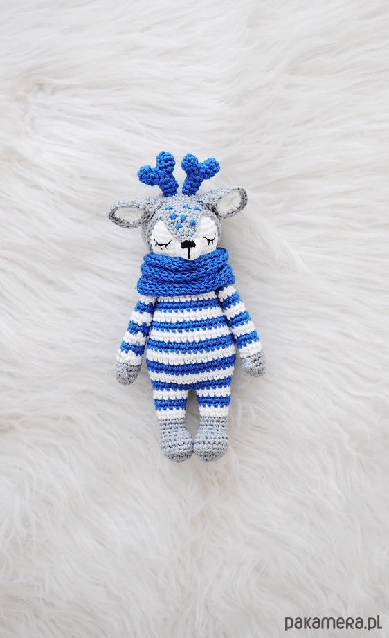 Jelonek ma ok. 20cm wzrostu i szaro-niebiesko-białe umaszczenie. Jego dodatkową ozdobą jest dziergany zawijany wokół szyi szalik. Jelonek nie stoi samodzielnie.