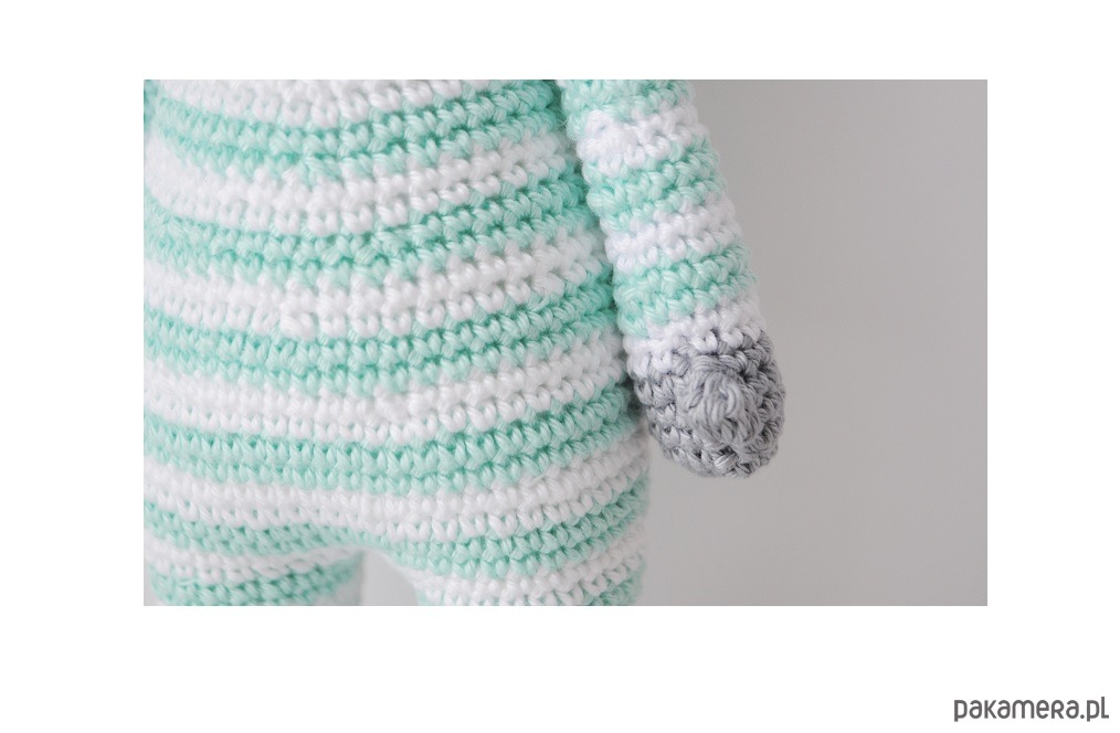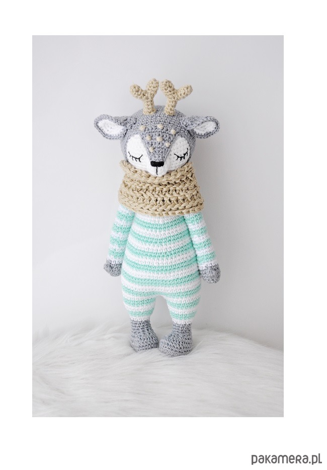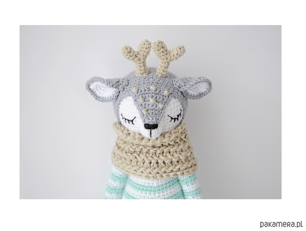 Jelonek ma ok. 28cm wzrostu i szaro-miętowo-białe umaszczenie. Dodatkową ozdobą jelonka jest dziergany komin. Jelonka wykonano z bawełny, wypełnienie to puch antyalergiczny. Całość wykonana ręcznie, jelonek nie stoi samodzielnie.