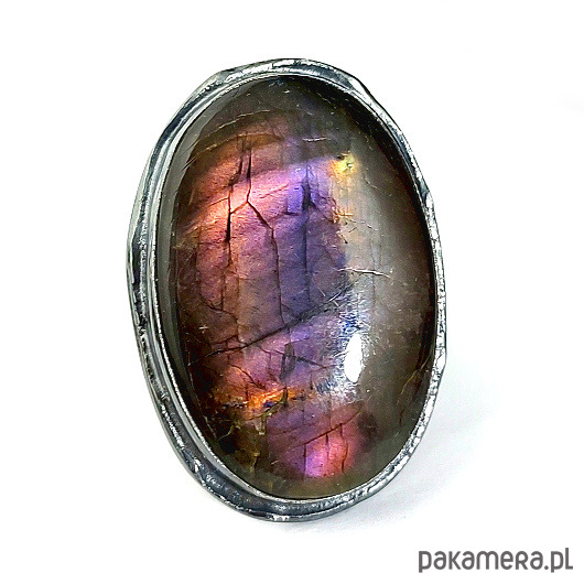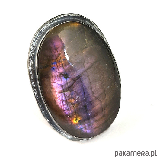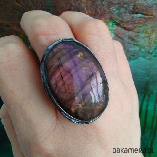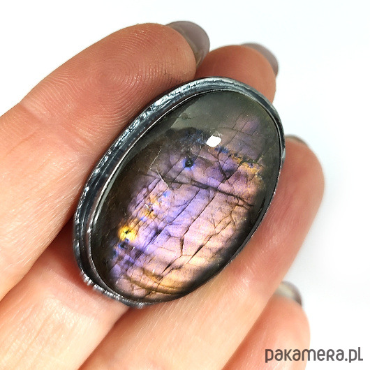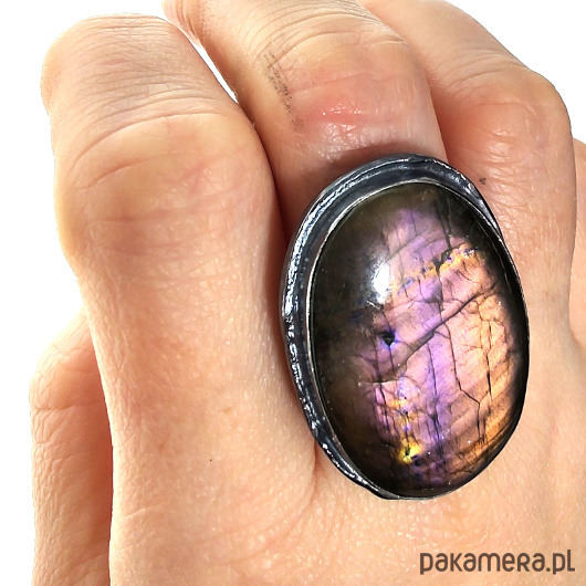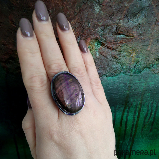 Okazały pierścień z oprawionym w oksydowane srebro próby 925 naturalnym labradorytem o zjawiskowych odcieniu intensywnego óżu i fioletu. Wymiary całej oprawy kamienia 37 x 27 mm. Waga 19 g, rozmiar jubilerski 13, mogę dopasować rozmiar tego pierścienia w zakresie 13-19. Zapakowany do wysylki w ozdobne pudełeczko.