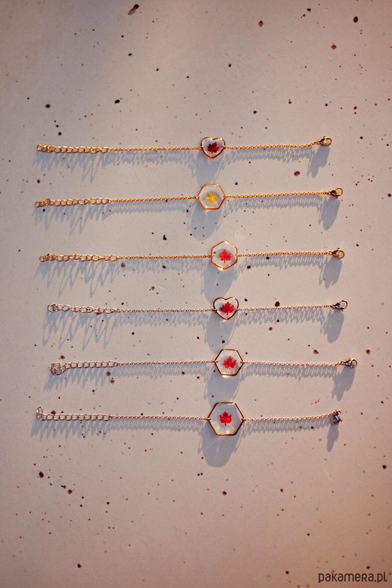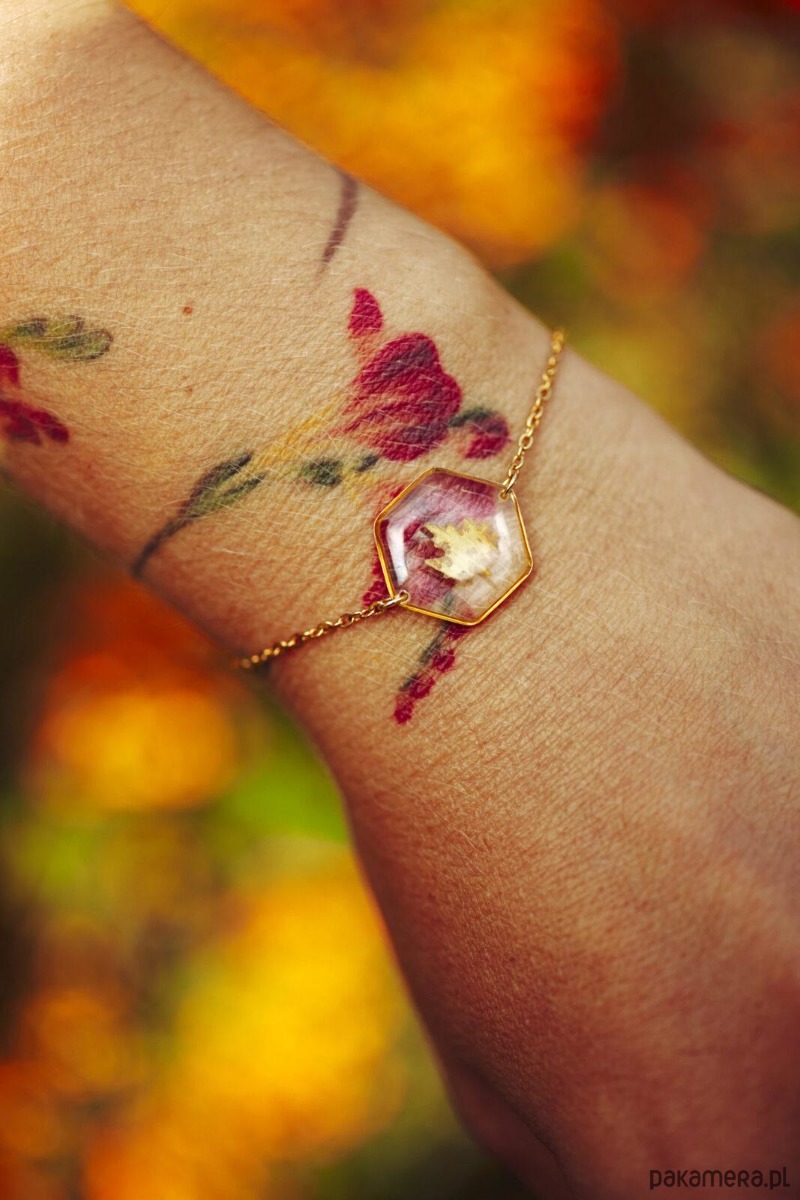 Wyjątkowa bransoletka, wypełniona delikatnymi płatkami pięknymi listkami klonu drobnolistnego, który został uchwycony w krystalicznie czystej żywicy jubilerskiej.