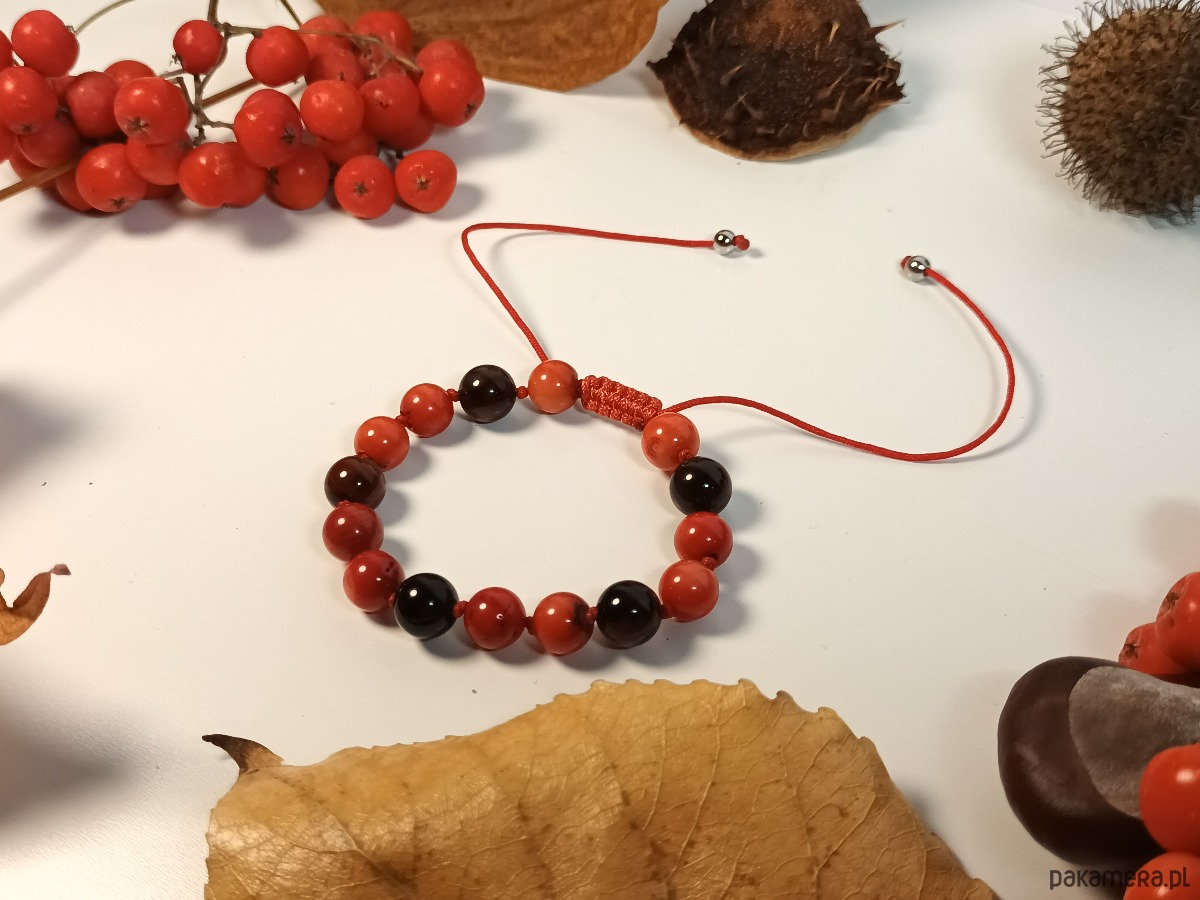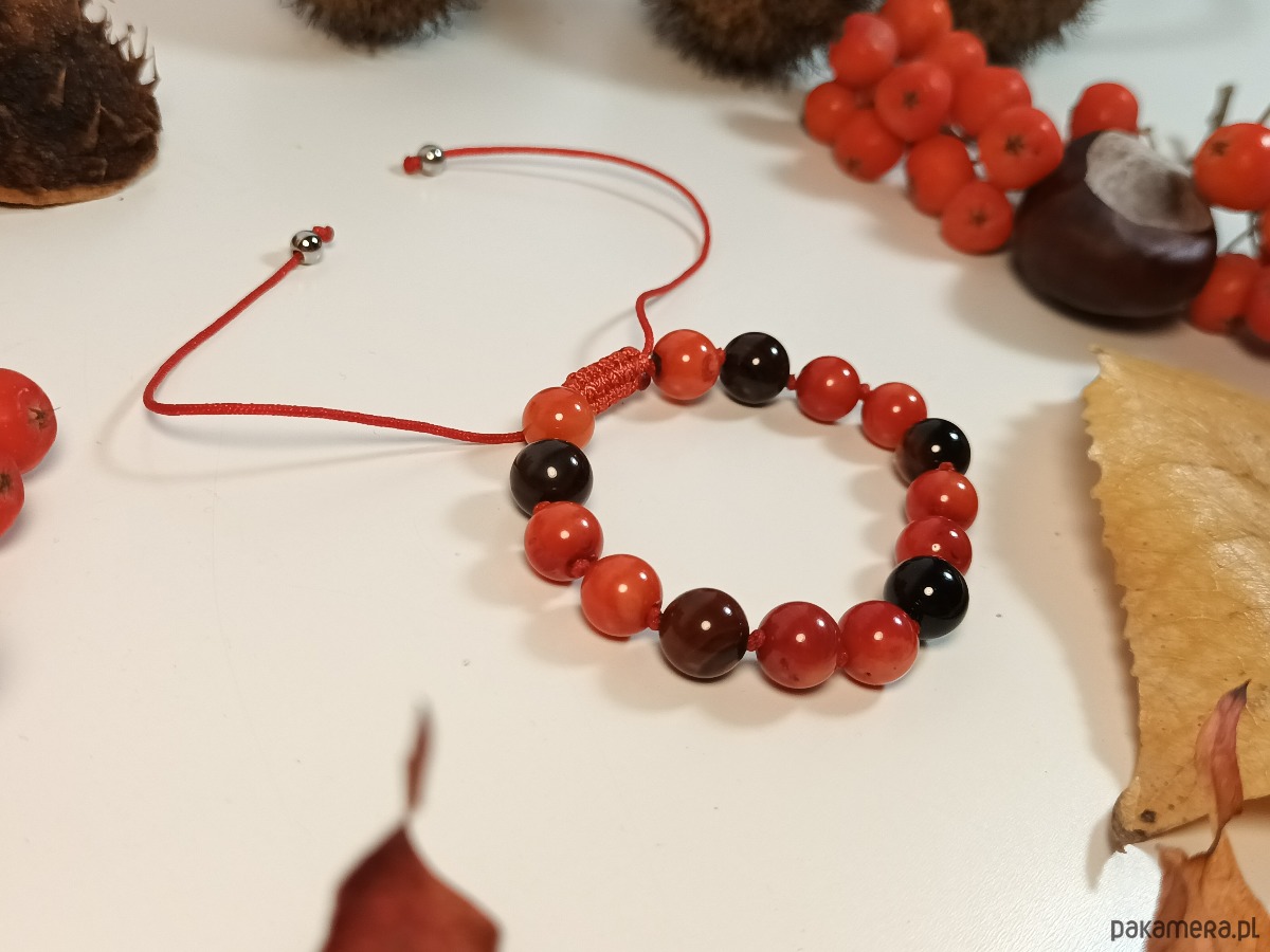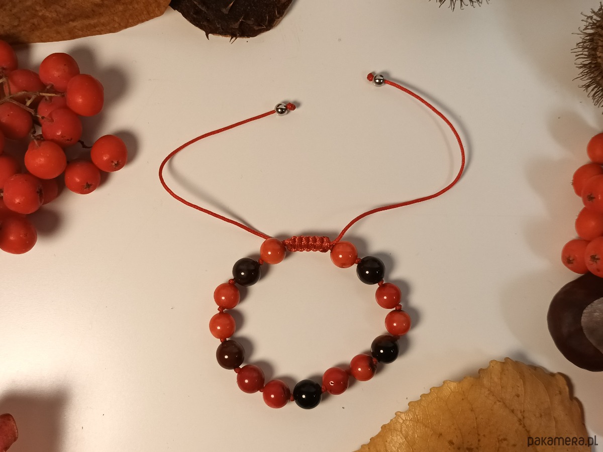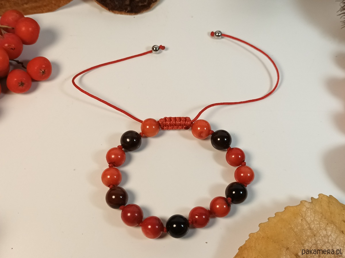 Pełna bransoletka z koralem bambusowym czerwonym ok. 7-7,5 mm i agatami ciemnymi miedzianymi 8mm na czerwonym sznureczku jubilerskim , na końcówkach koraliki ze stali szlachetnej.