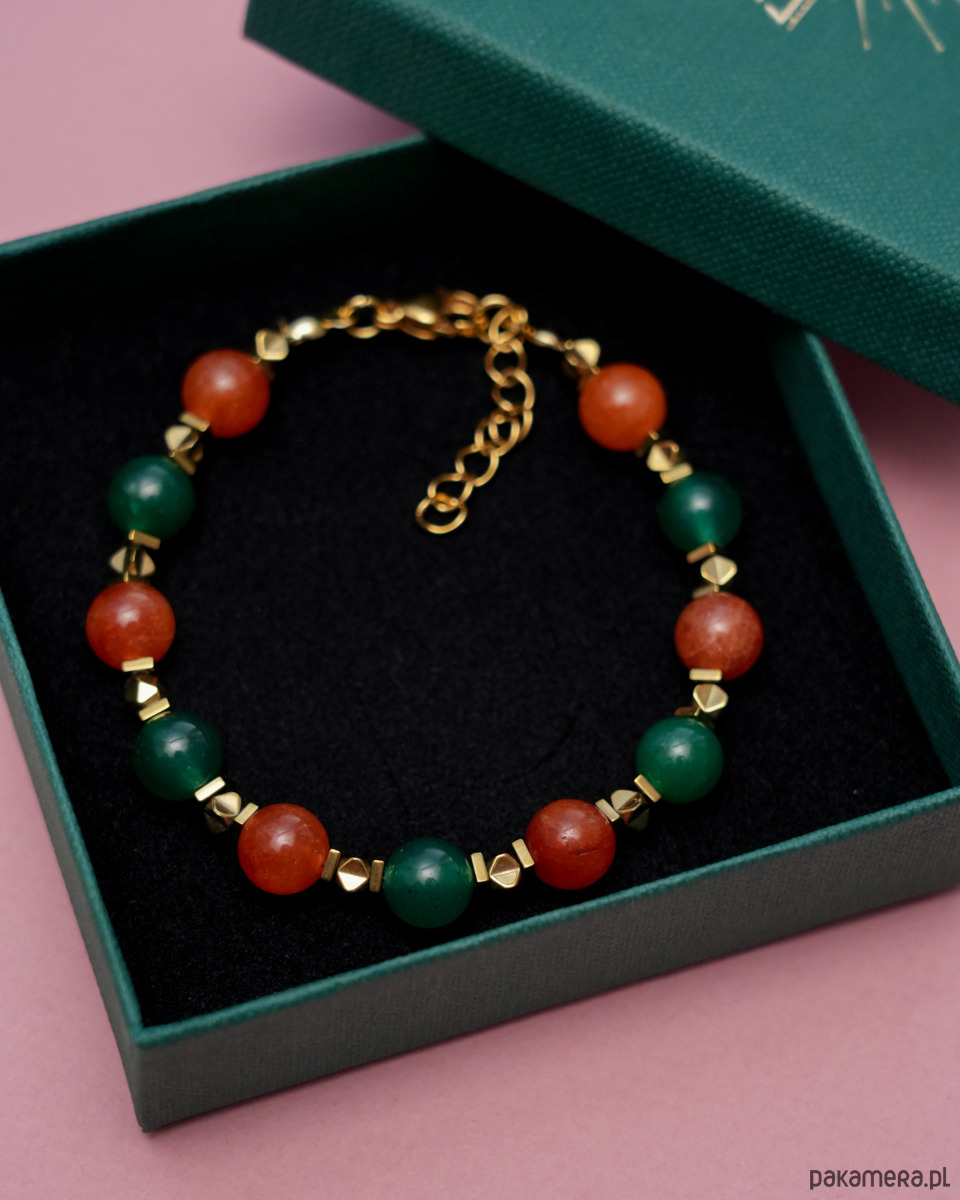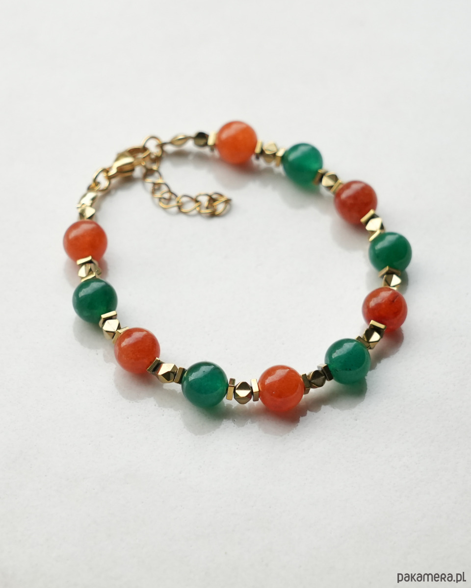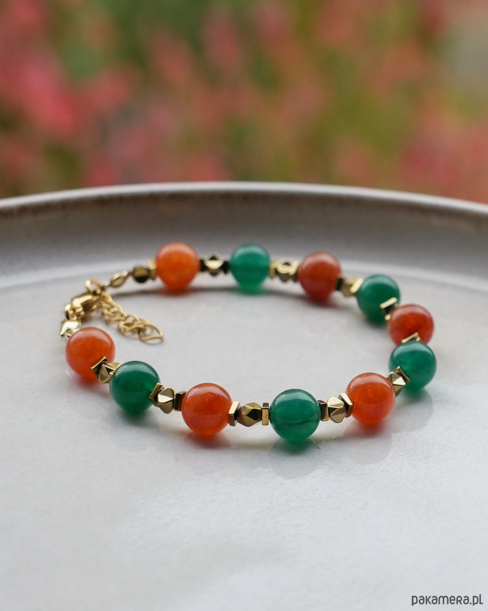 Ozdobna bransoletka w jesiennych kolorach, idealna dla jesieniary :) Wykonana z zielonych i pomarańczowych JADEITÓW oraz złotych HEMATYTÓW. Zapięcie i łańcuszek to STAL SZLACHETNA w kolorze złotym.