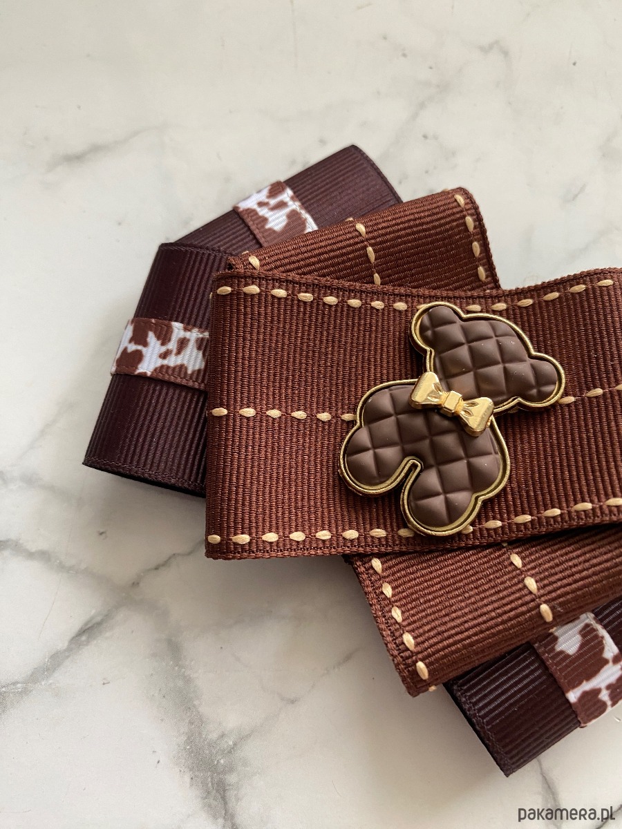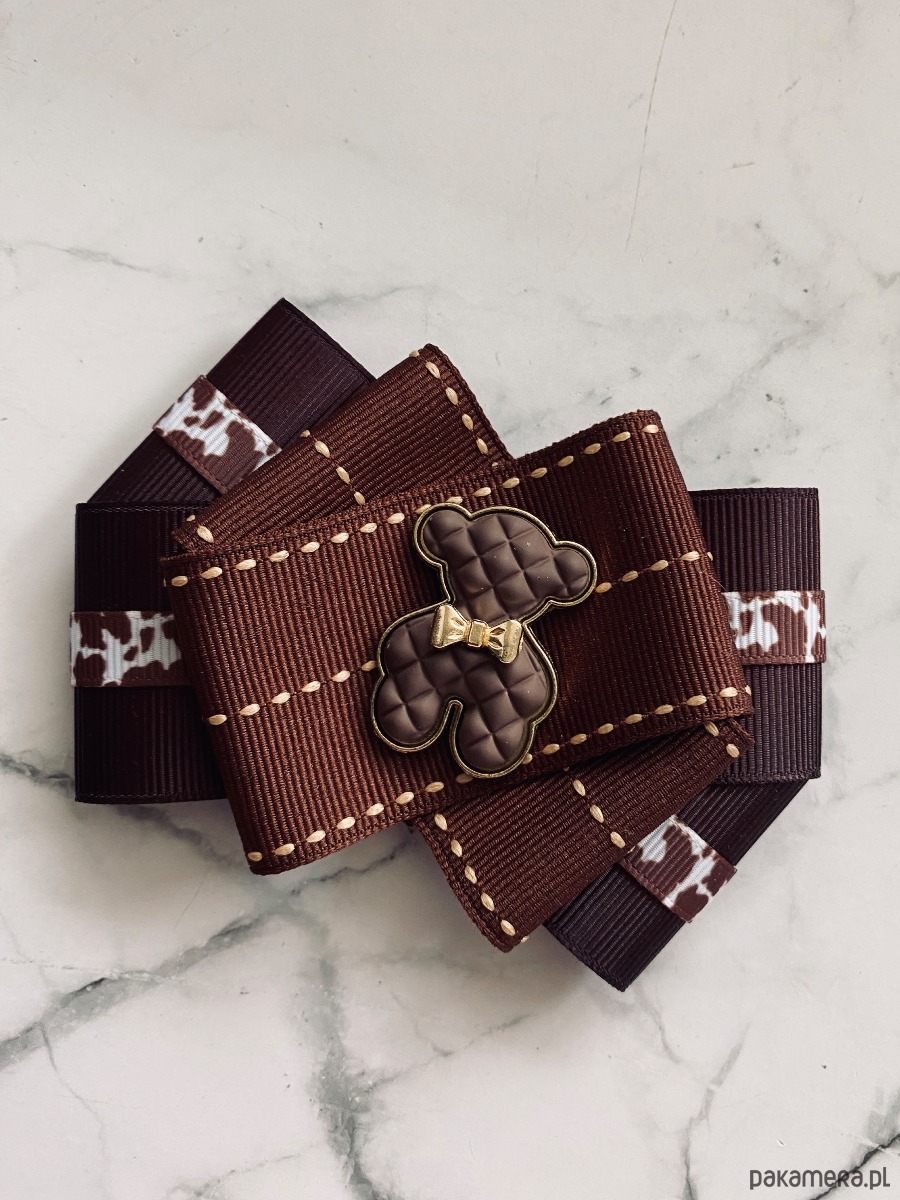 Cudowny Miś wykonany z ciekawej kratkowanej masy w kolorze czekoladowym z urocza złota kokardka.