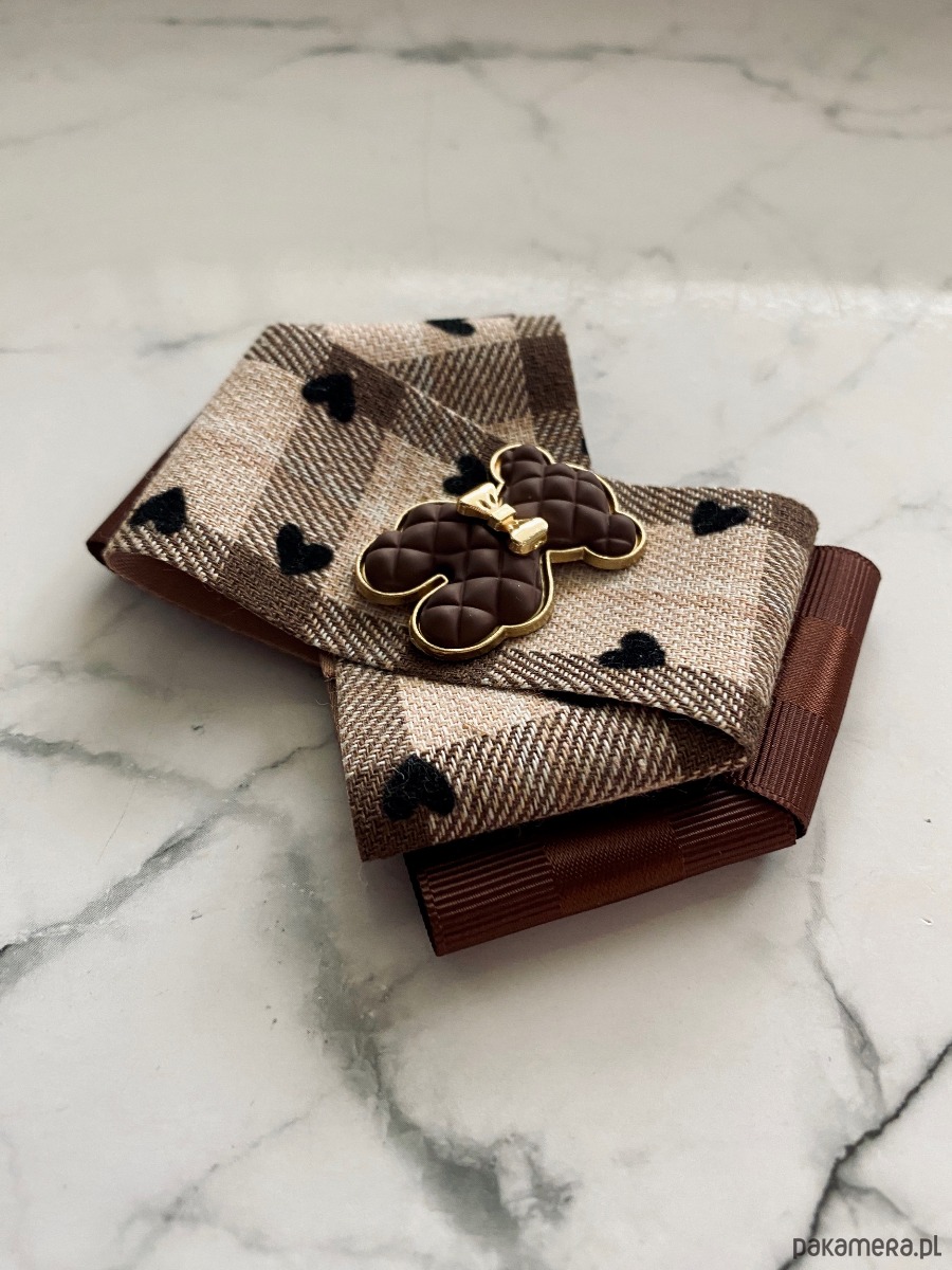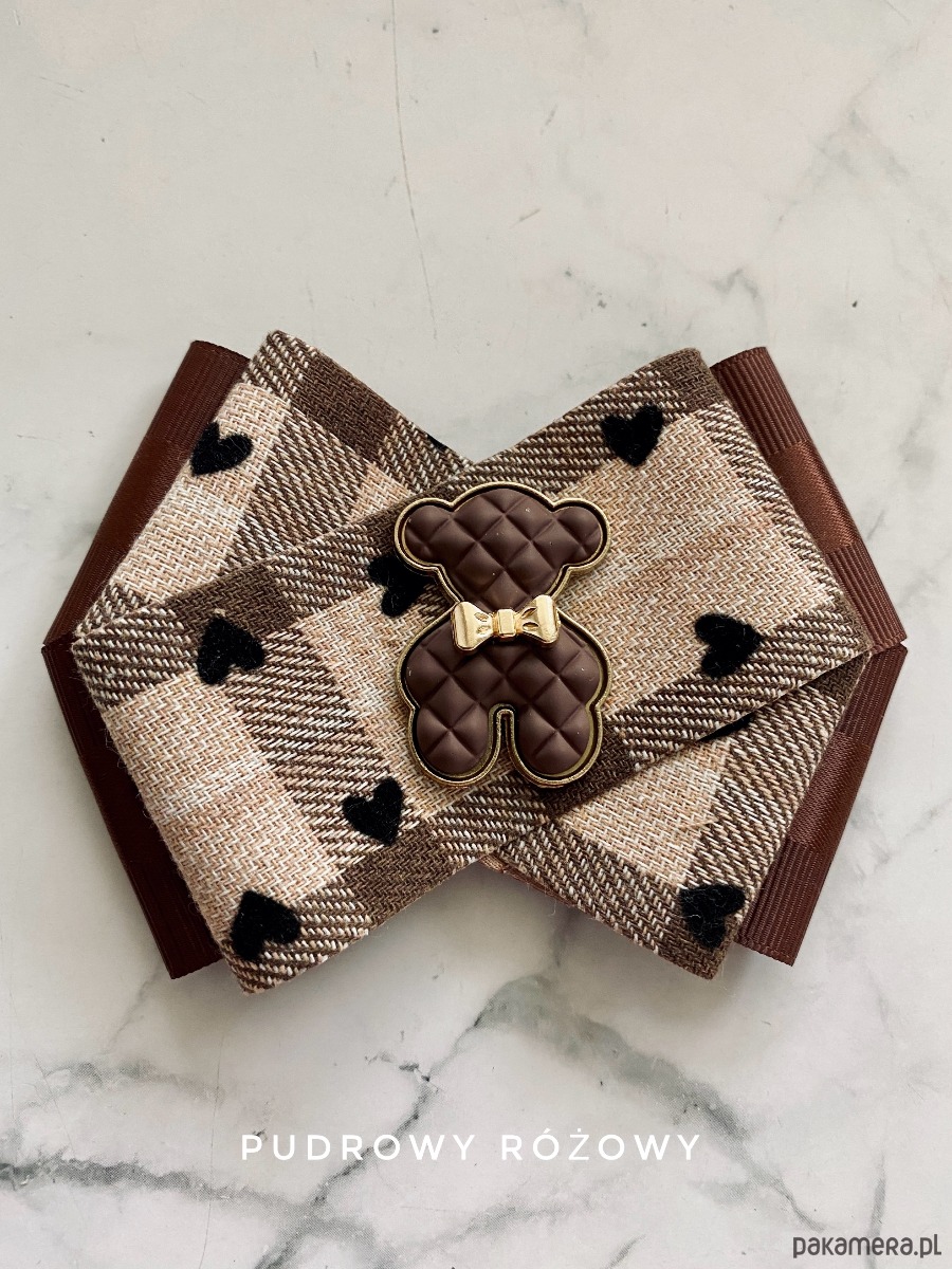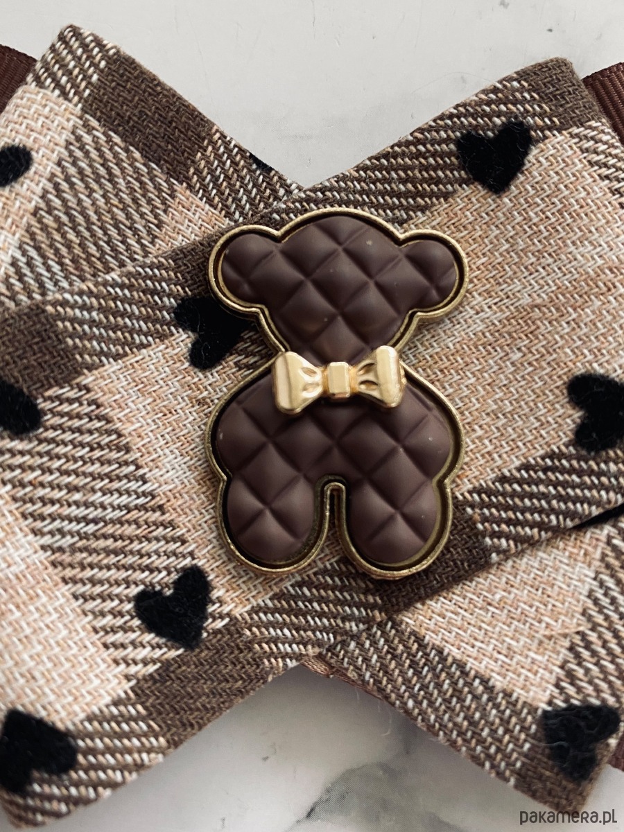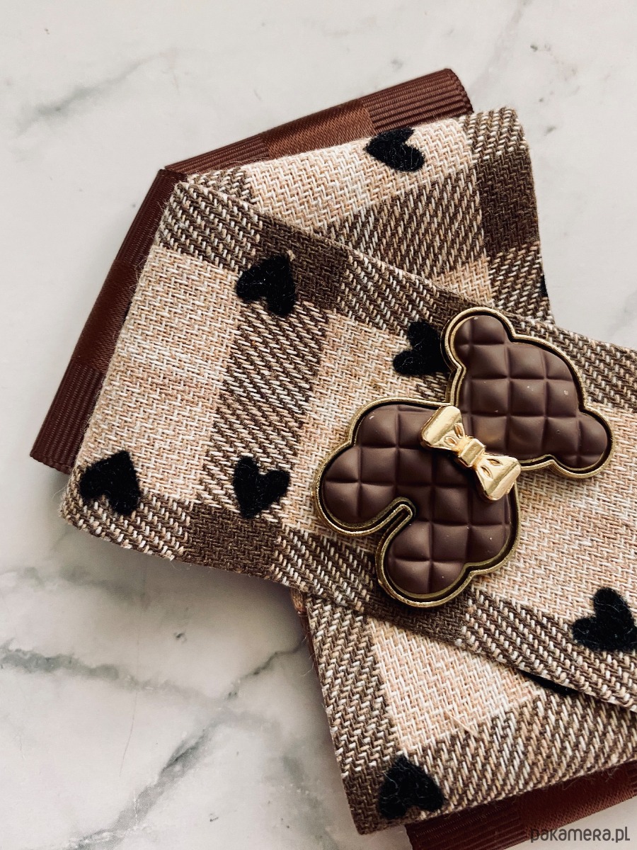 Cudowny Miś wykonany z ciekawej kratkowanej masy w kolorze czekoladowym z urocza złota kokardka.