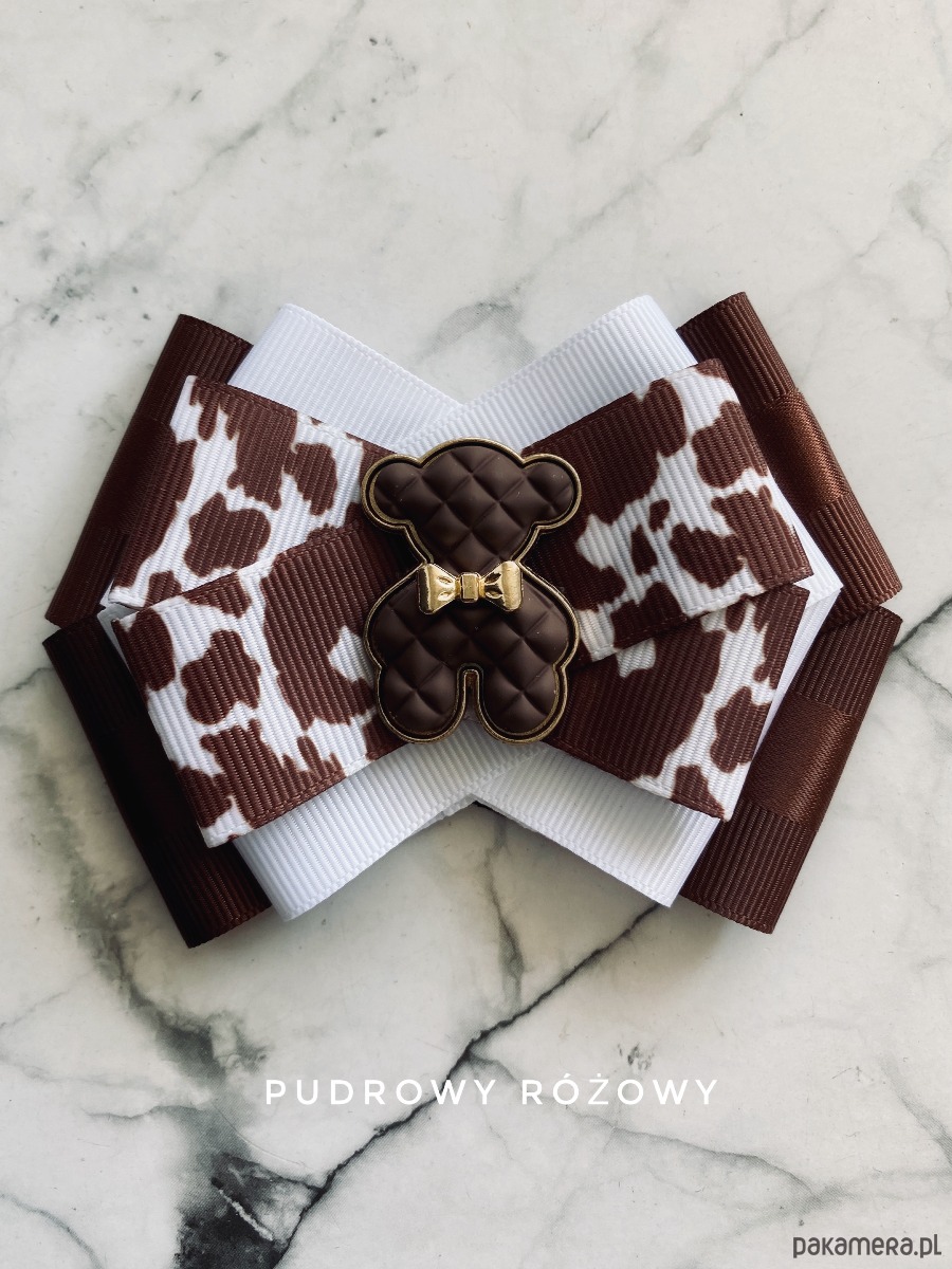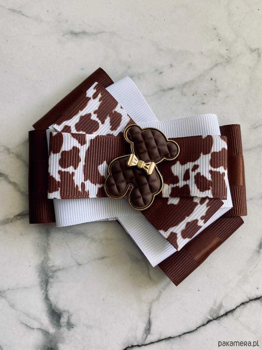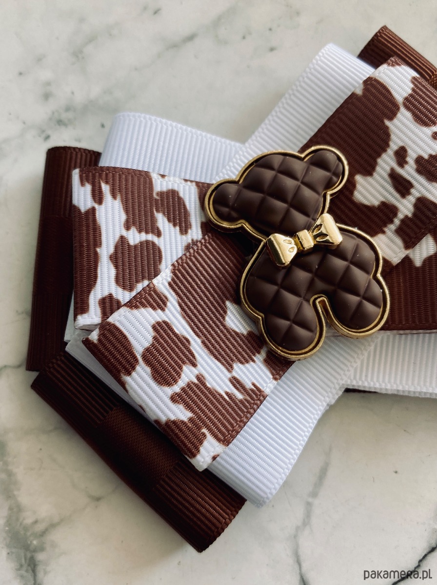 Cudowny Miś wykonany z ciekawej kratkowanej masy w kolorze czekoladowym z urocza złota kokardka.