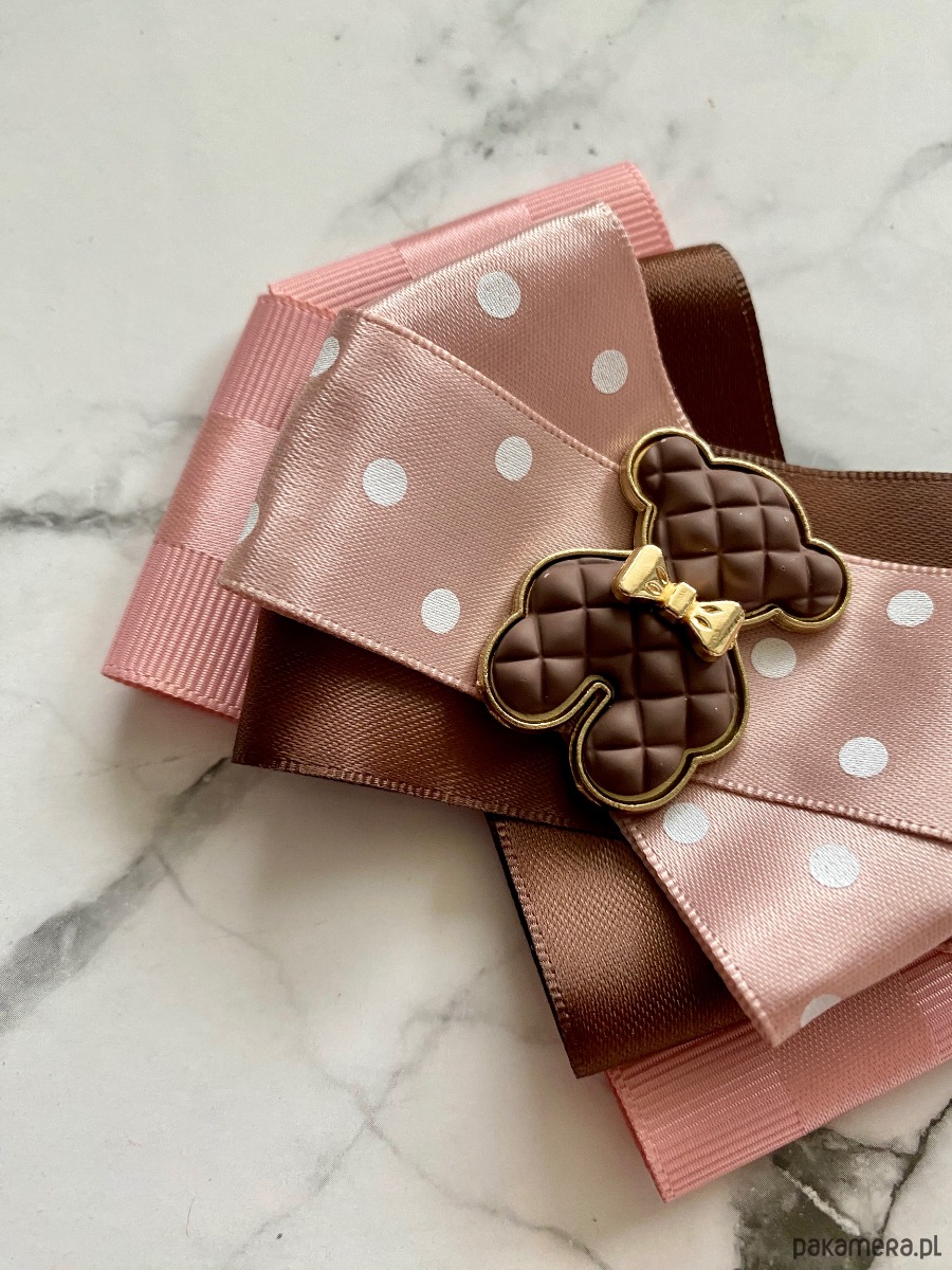 Cudowny Miś wykonany z ciekawej kratkowanej masy w kolorze czekoladowym z urocza złota kokardka.