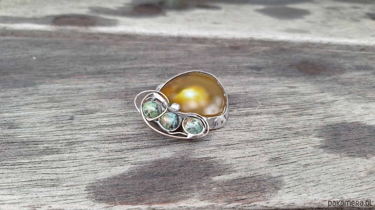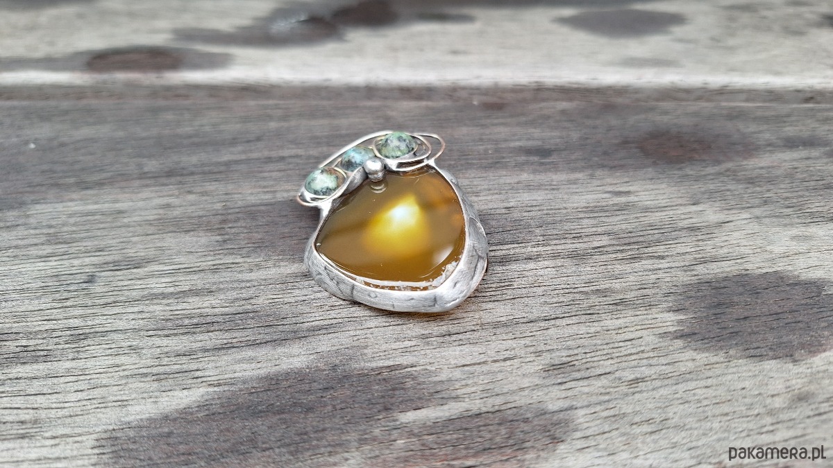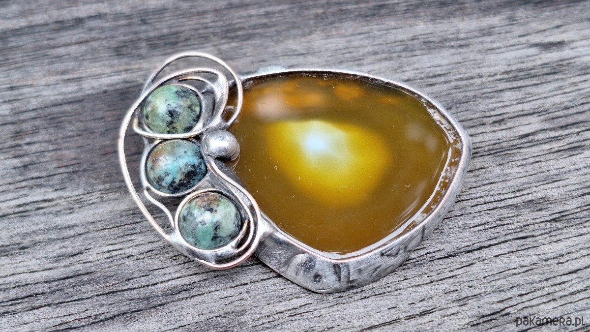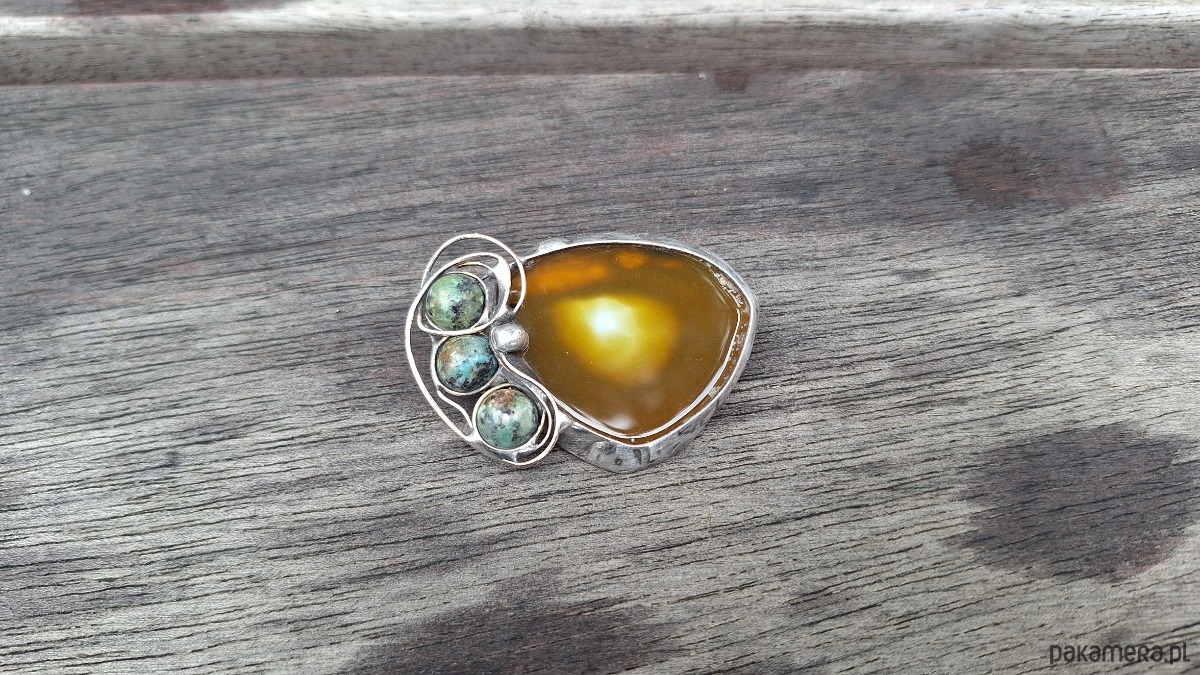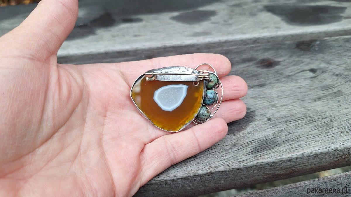Broszka wykonana z miedzi, cyny, turkusu i agatu. Wymiary ok. 5 na 3.5 m. Zapięcie metalowe.