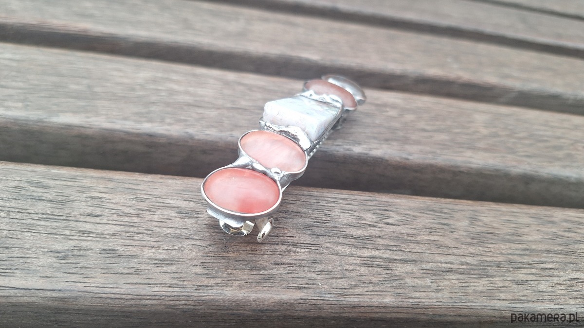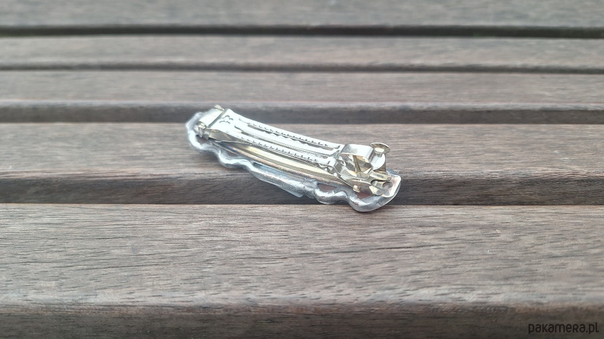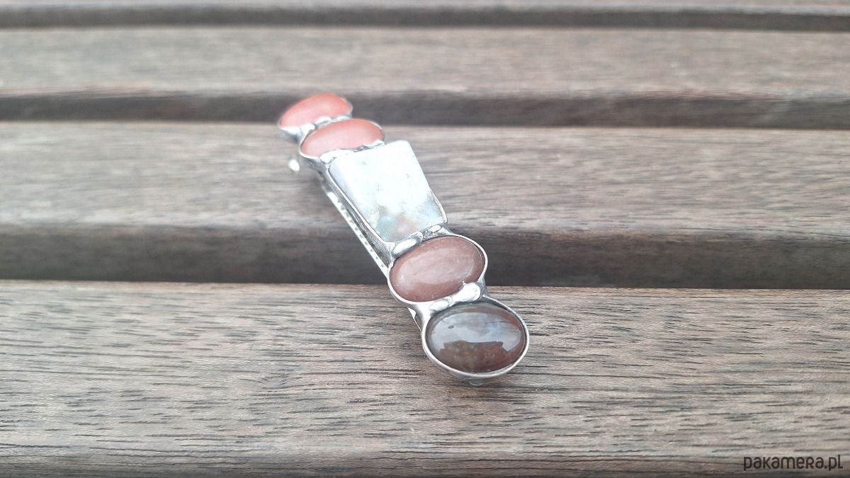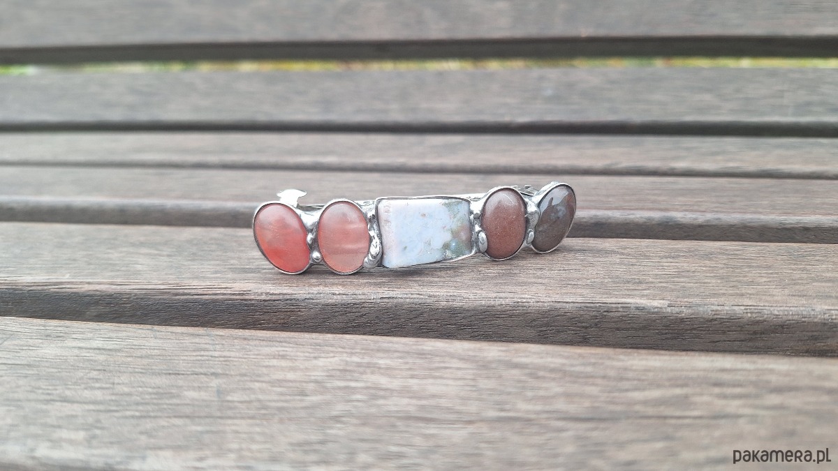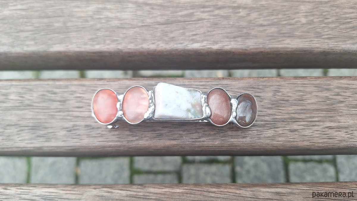 Klamra do włosów, wykonana z miedzi, cyny, kwarców, jaspisu i jadeitów. Wymiary ok. 8 na 1.7 cm. Zapięcie 6 cm, metalowe.