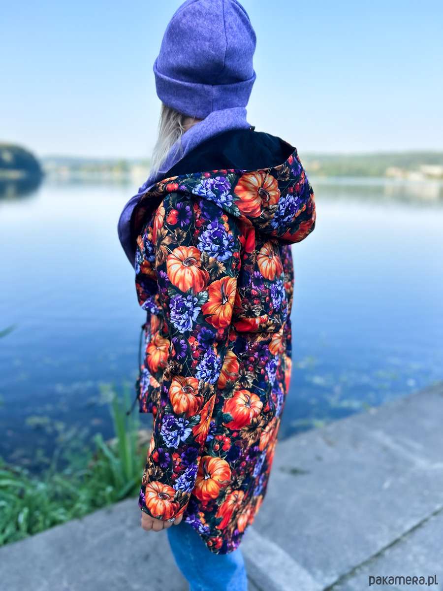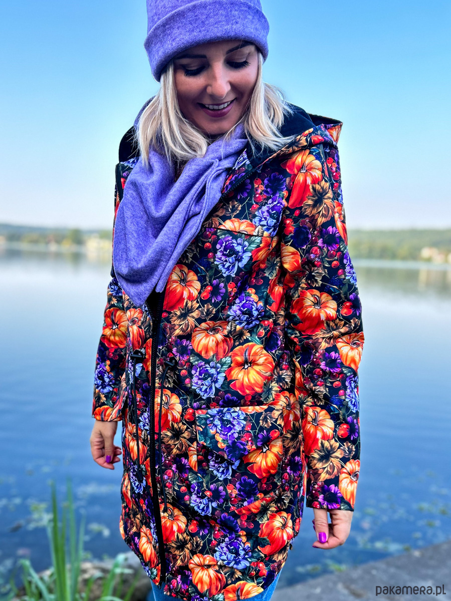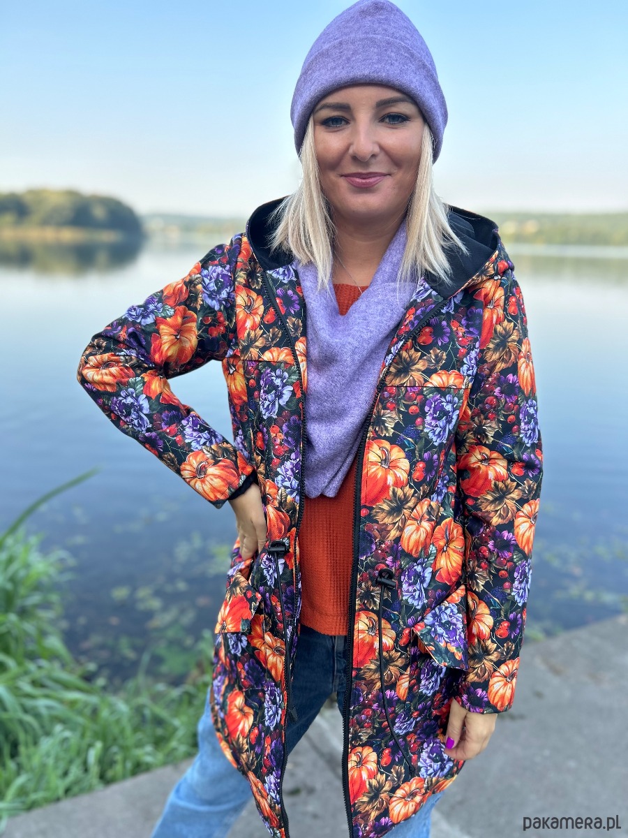 Kurtka damska typu parka wzór dynie, lekko ocieplana. Wyróżnij się z szarości jesiennej! Czas na wzorzystą kurtkę!
