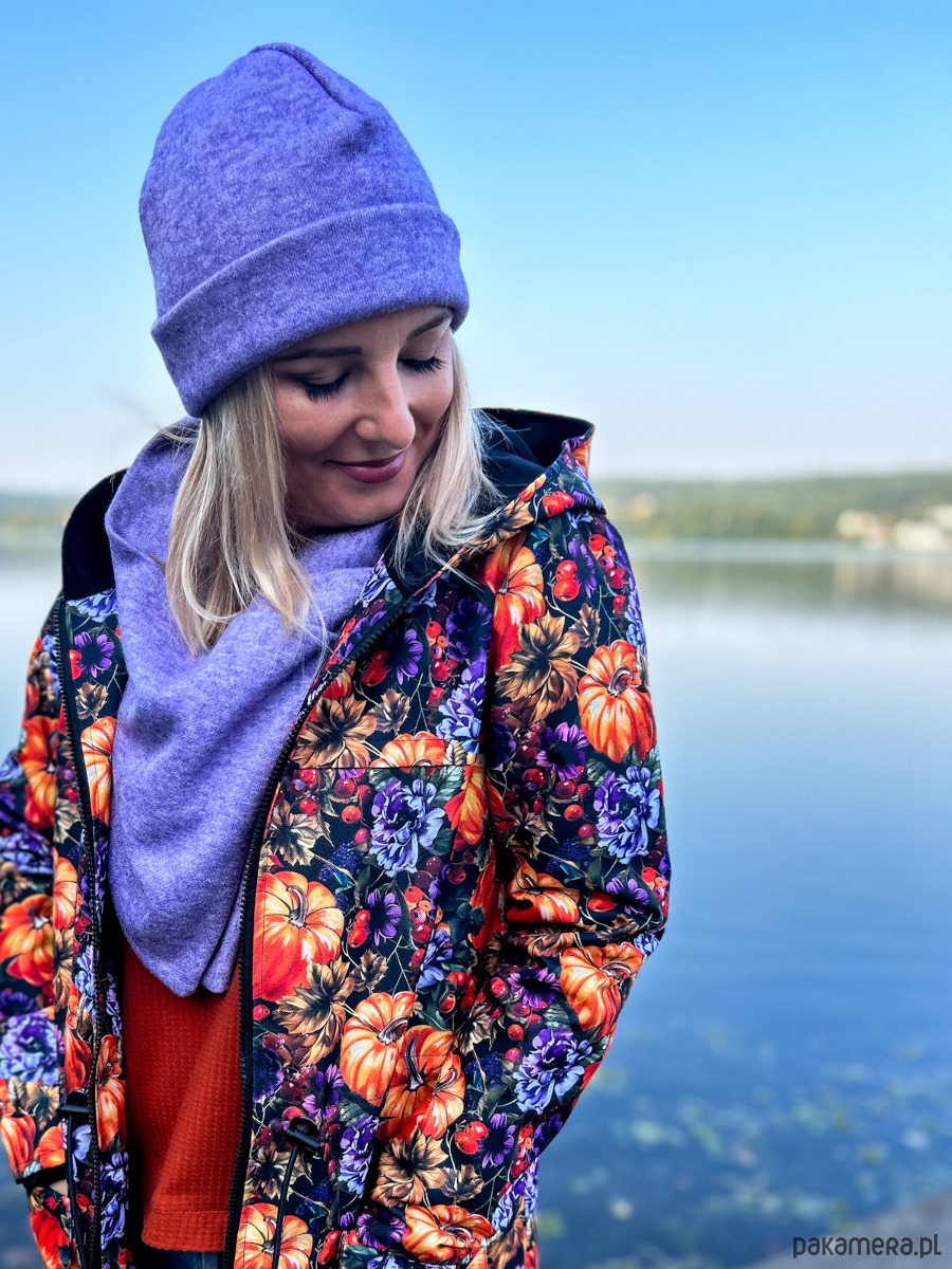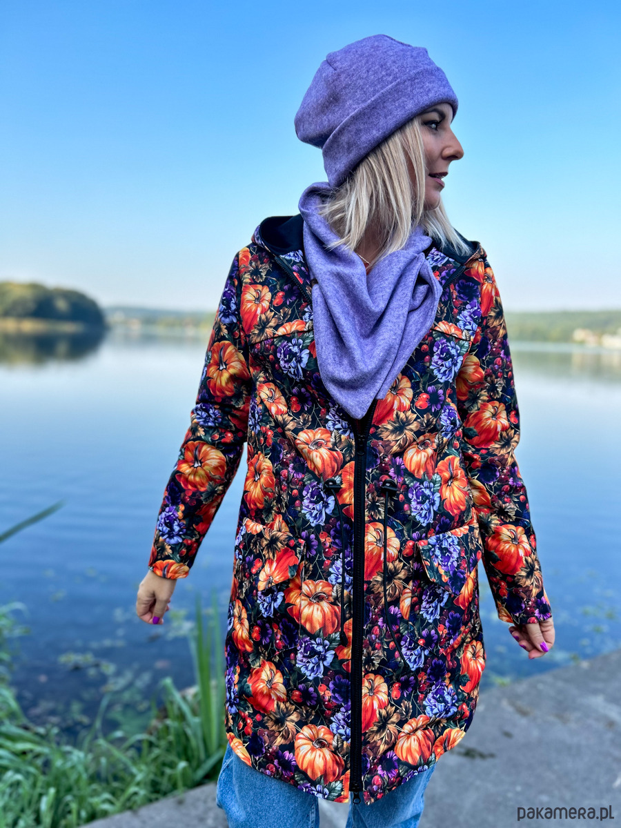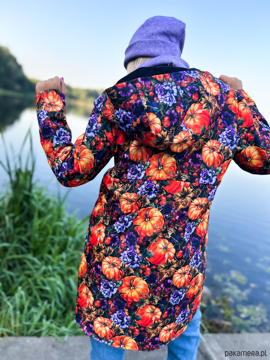 Kurtka damska typu parka wzór dynie, lekko ocieplana. Wyróżnij się z szarości jesiennej! Czas na wzorzystą kurtkę!