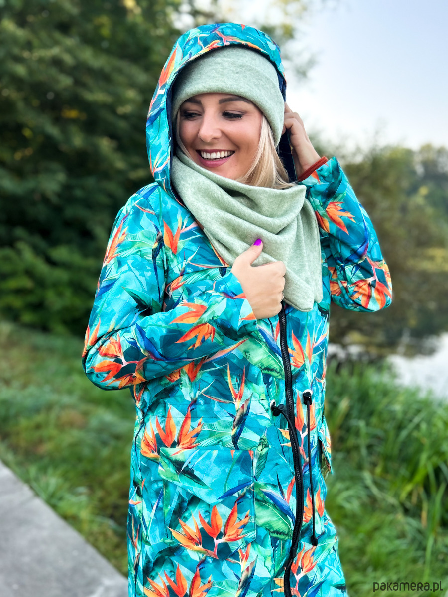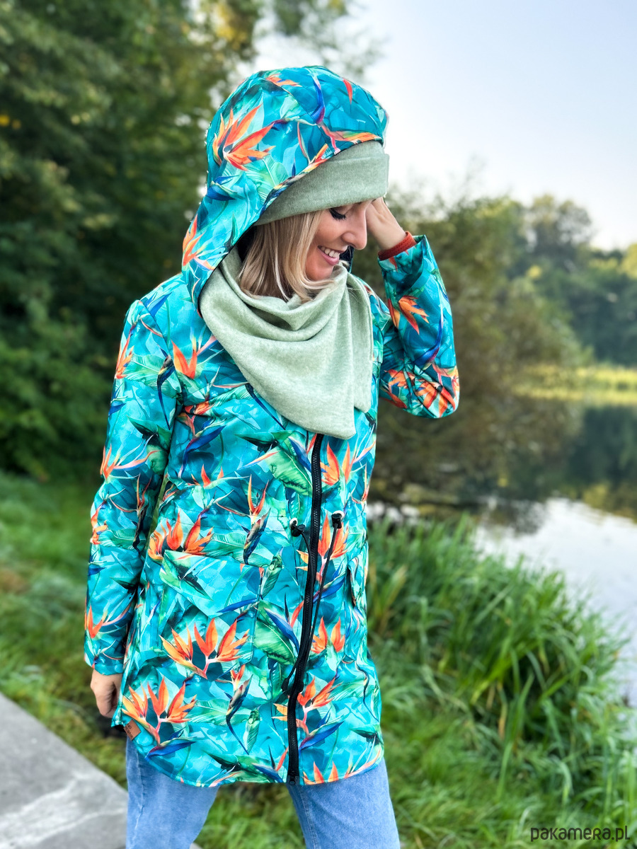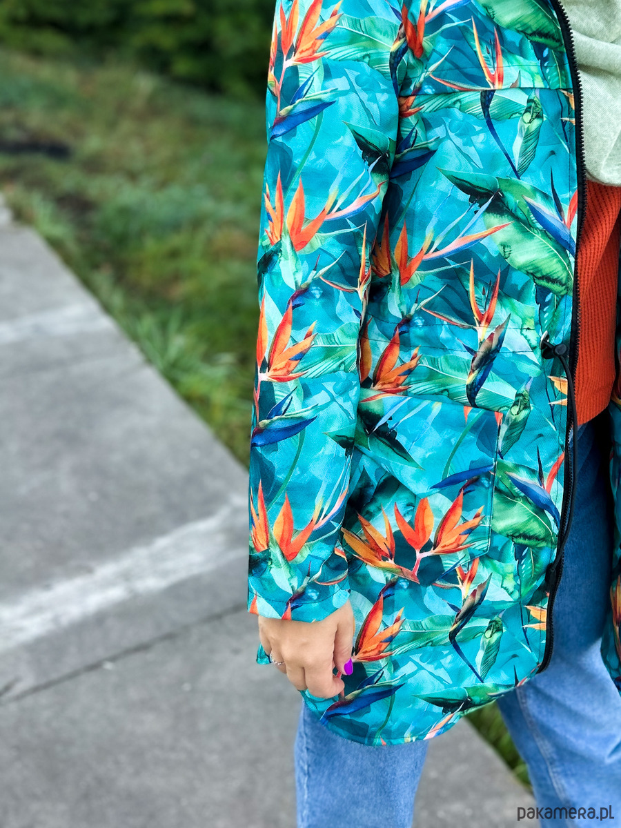Kurtka damska typu parka wzór strelicje turkus, lekko ocieplana. Wyróżnij się z szarości jesiennej! Czas na wzorzystą kurtkę!
