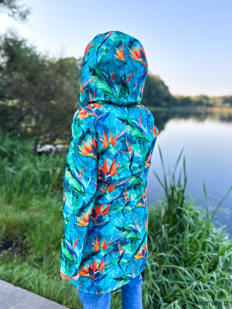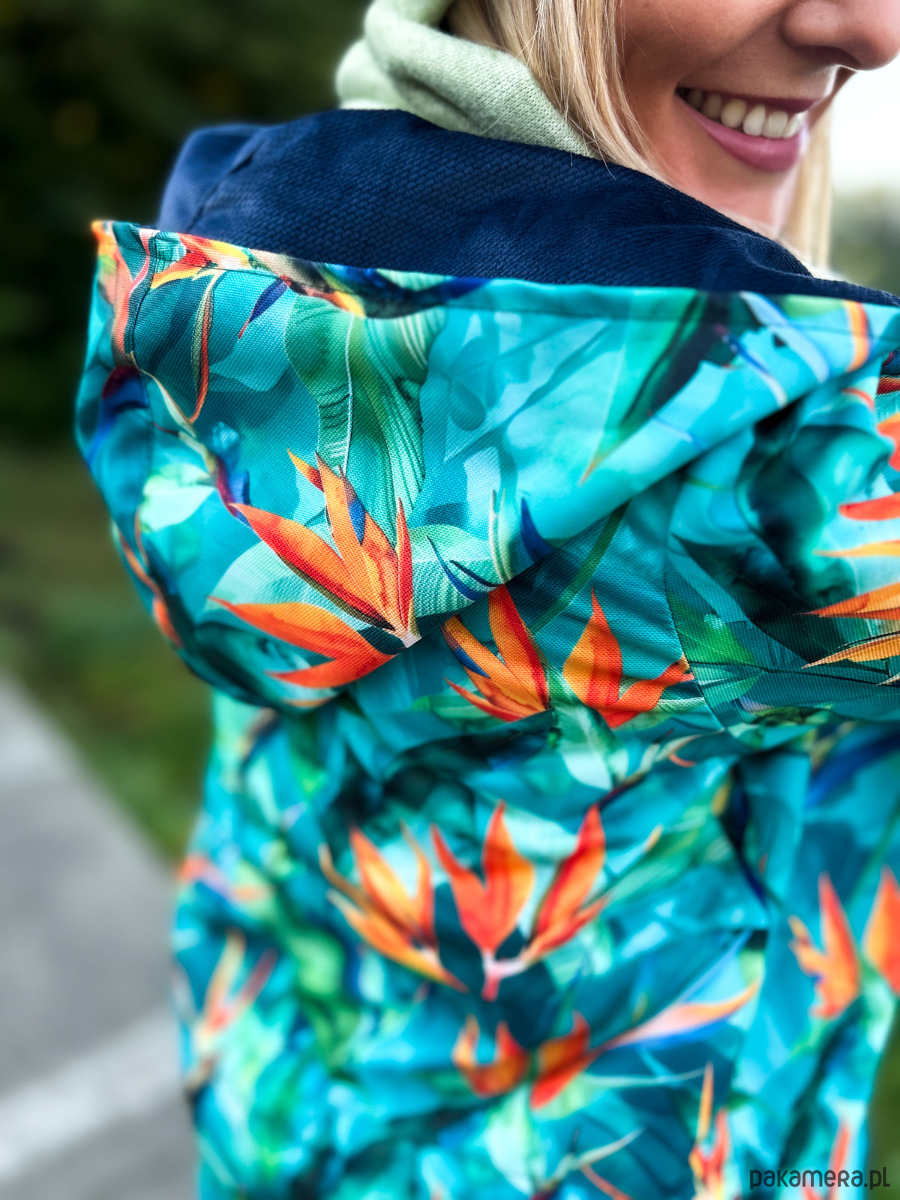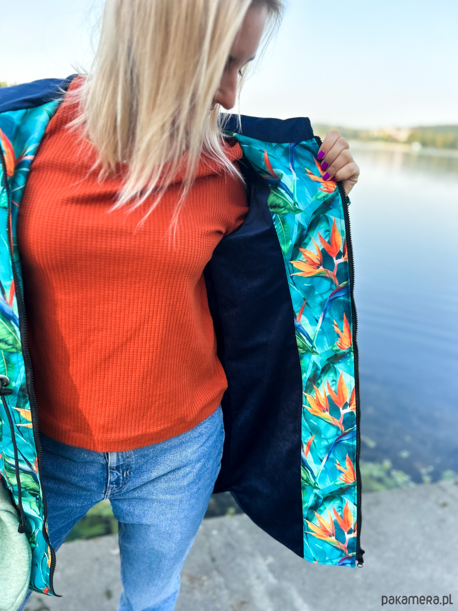Kurtka damska typu parka wzór strelicje turkus, lekko ocieplana. Wyróżnij się z szarości jesiennej! Czas na wzorzystą kurtkę!