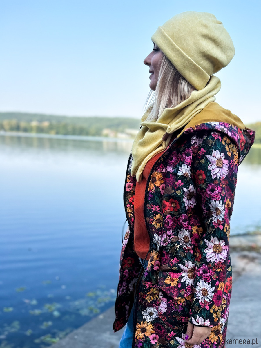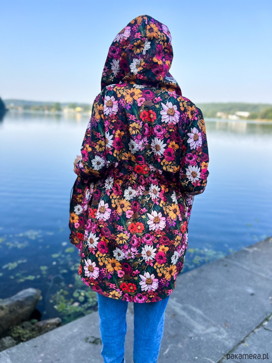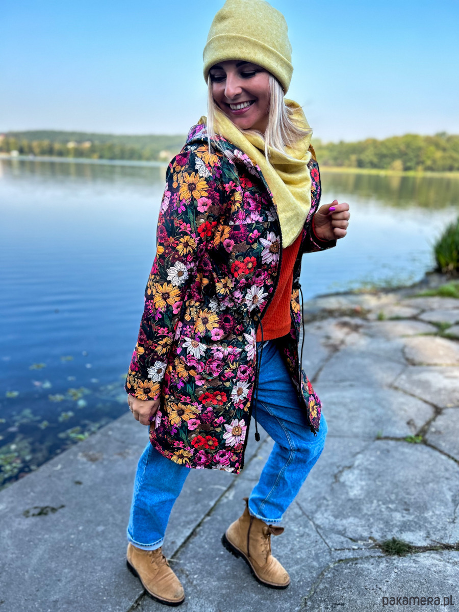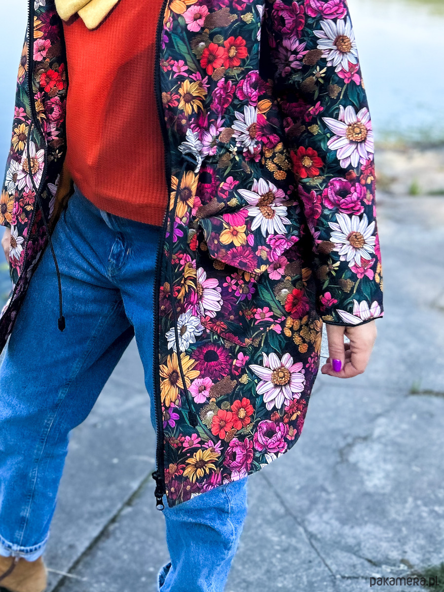 Kurtka damska typu parka wzór wiejski ogród, lekko ocieplana. Wyróżnij się z szarości jesiennej! Czas na wzorzystą kurtkę!