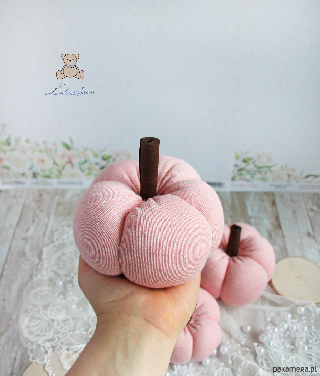 Komplet 3 sztuk pięknych dekoracyjnych dyń uszytych ręcznie, z dbałością o każdy detal. Każda z dyń jest uszyta ze złotej, błyszczącej tkaniny typu lama, oraz sweterkowej dzianiny w kolorze ecru oraz różu.