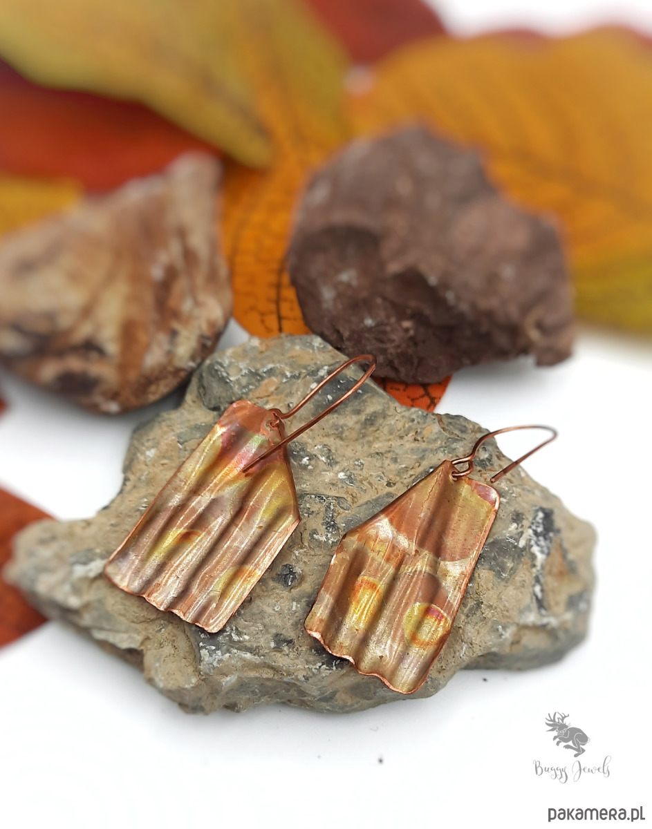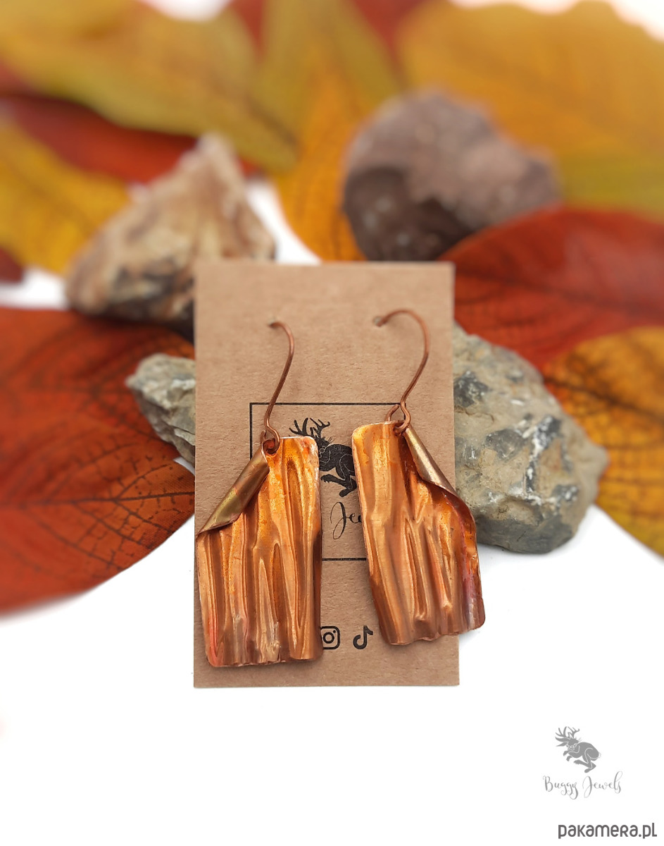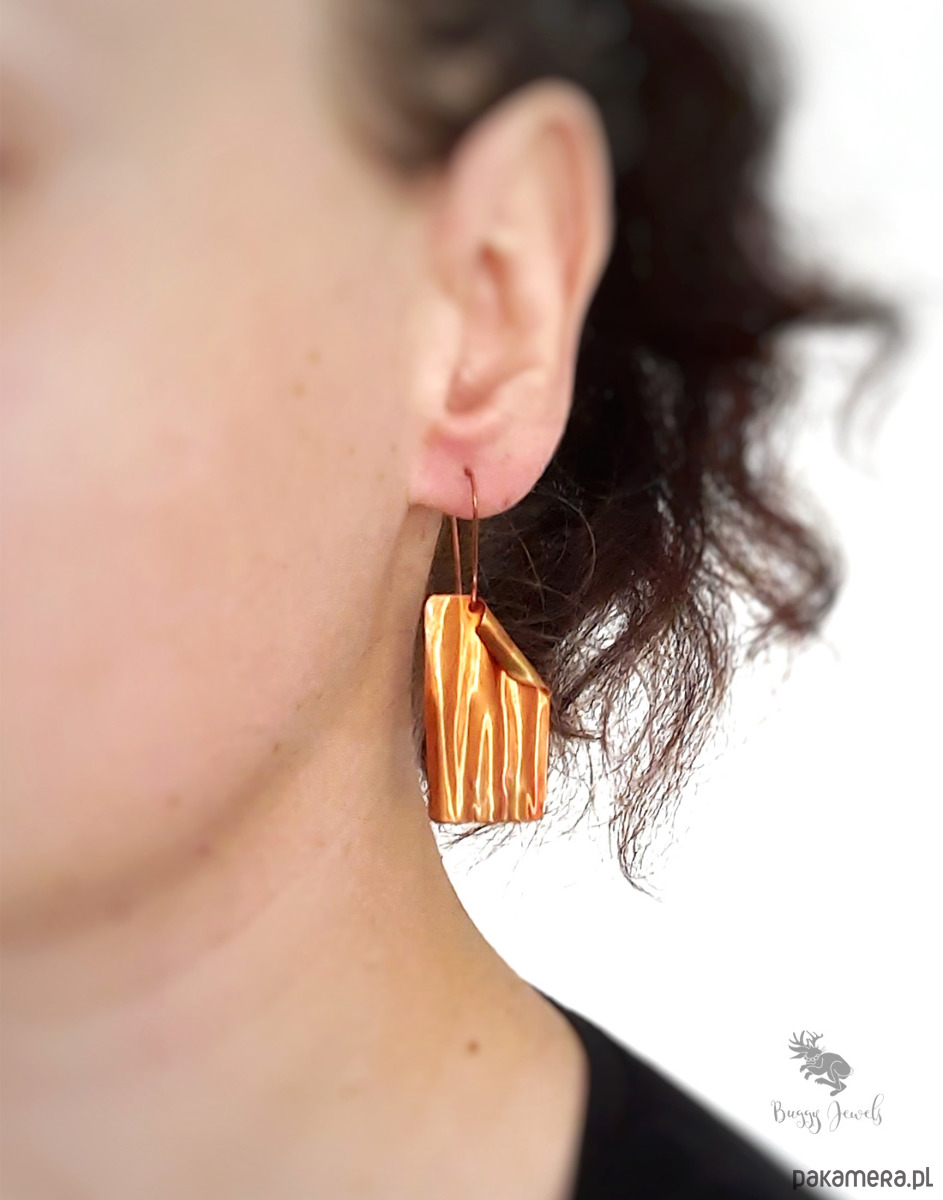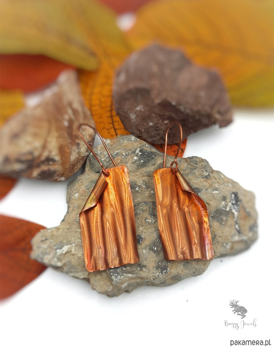 Kolczyki wykonane w całości z miedzi. Delikatna faktura, wykonana techniką wyginania, nadaje prostym kolczykom finezji i oryginalności. Ciepłą, pomarańczową barwę, kolczyki zawdzięczają barwieniu ogniem. Całość została zabezpieczona specjalnym , akrylowym lakierem.