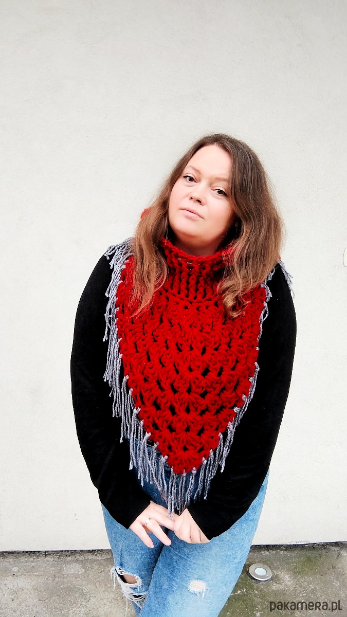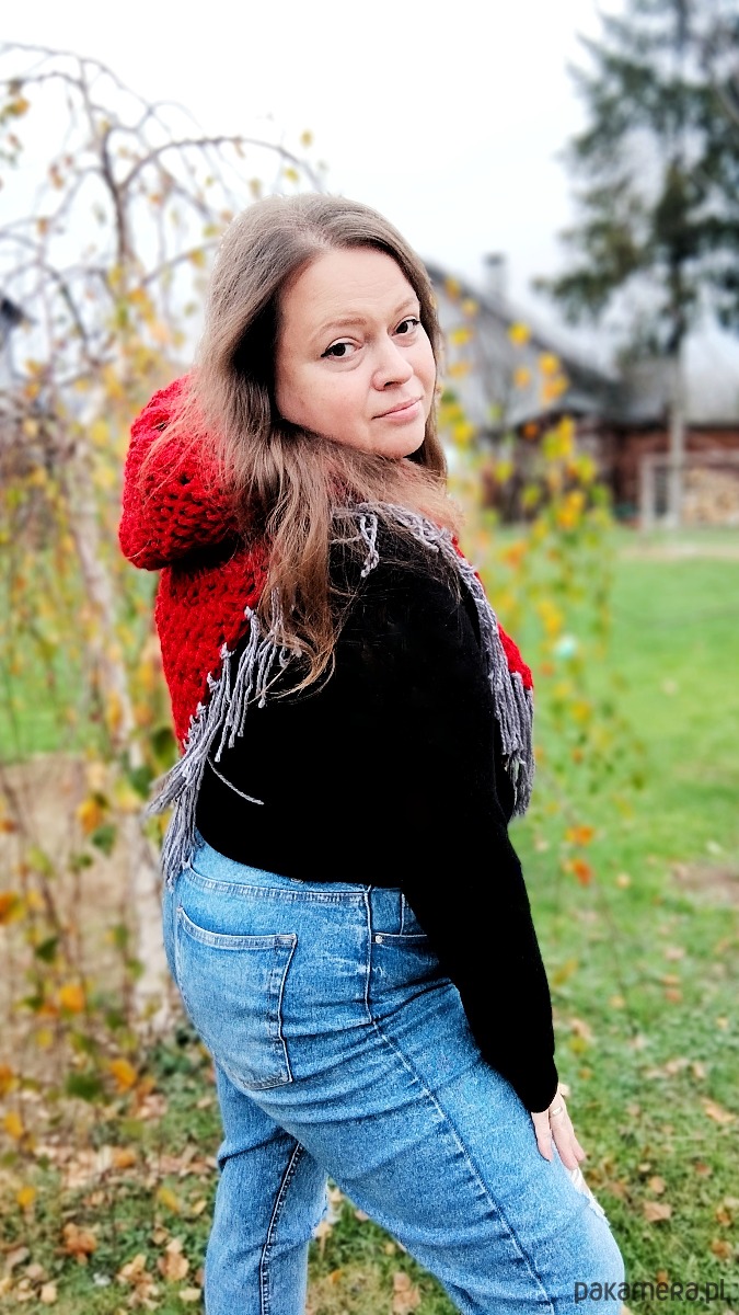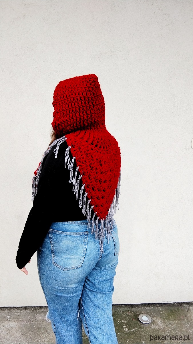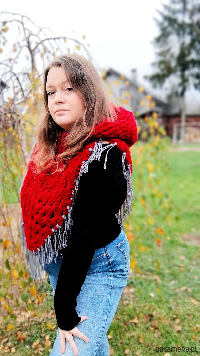 Połączenie głębokiej czerwieni z delikatnymi frędzlami układa się w harmonijną, trójkątną sylwetkę, która porusza się z każdym Twoim krokiem — jak skrzydło, jak cień płomienia, jak jesienny listek wirujący na wietrze. Kaptur dodaje całości tajemniczości, tworząc mały, prywatny kącik ciepła, do którego możesz schować się przed chłodem, światem i myślami, które gonią za szybko.