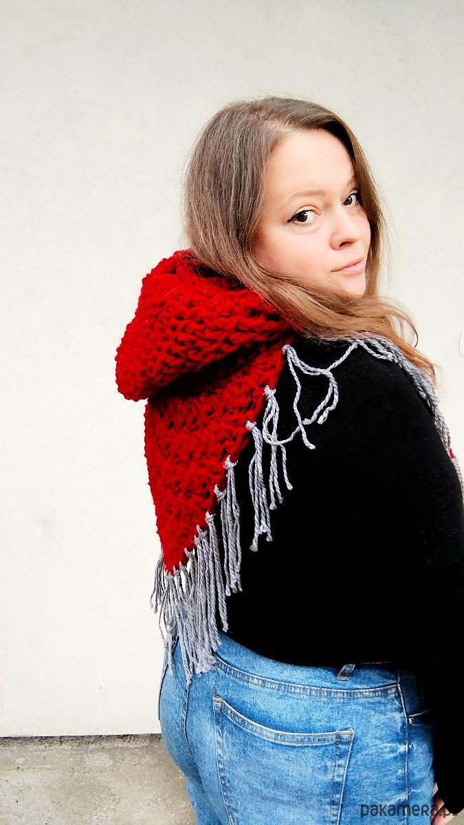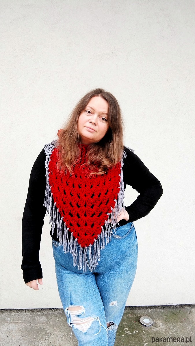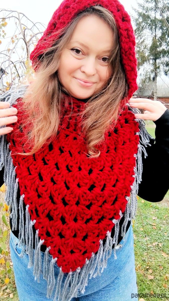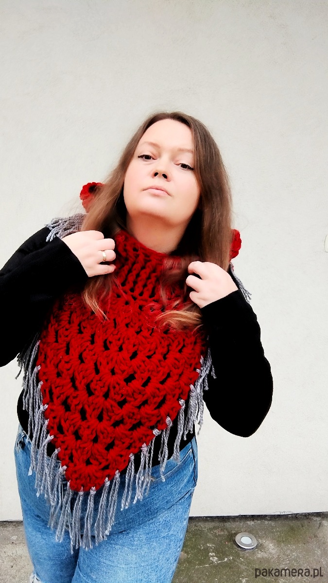 Połączenie głębokiej czerwieni z delikatnymi frędzlami układa się w harmonijną, trójkątną sylwetkę, która porusza się z każdym Twoim krokiem — jak skrzydło, jak cień płomienia, jak jesienny listek wirujący na wietrze. Kaptur dodaje całości tajemniczości, tworząc mały, prywatny kącik ciepła, do którego możesz schować się przed chłodem, światem i myślami, które gonią za szybko.