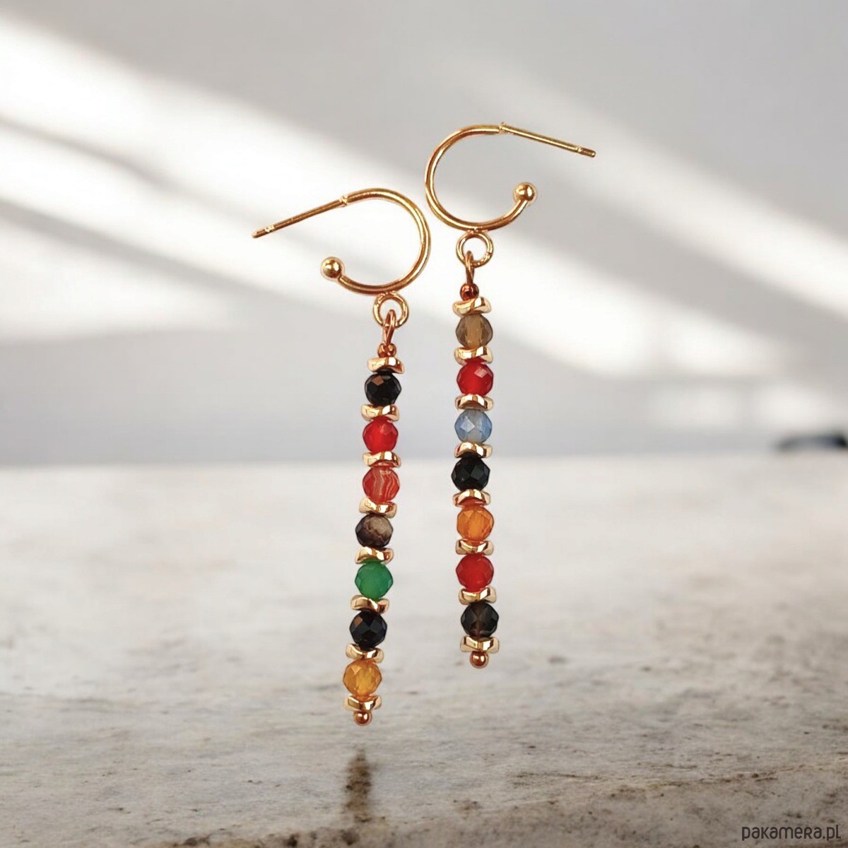 Wykonane z fasetowanych kuleczek wielobarwnego agatu (ok.4mm) oraz falistych przekładek ze złotego hematytu.