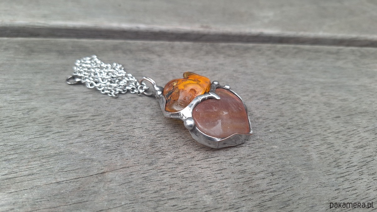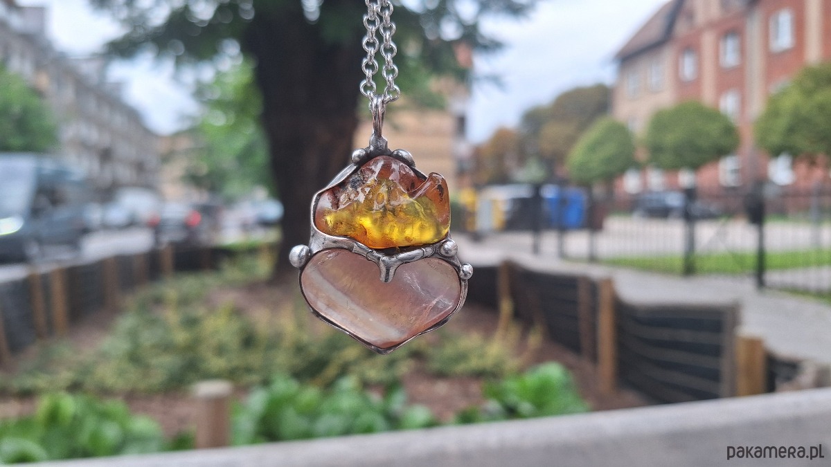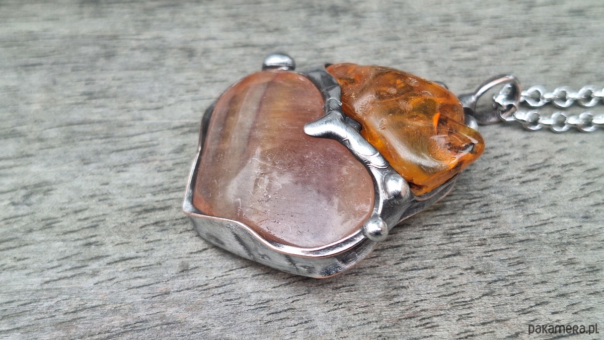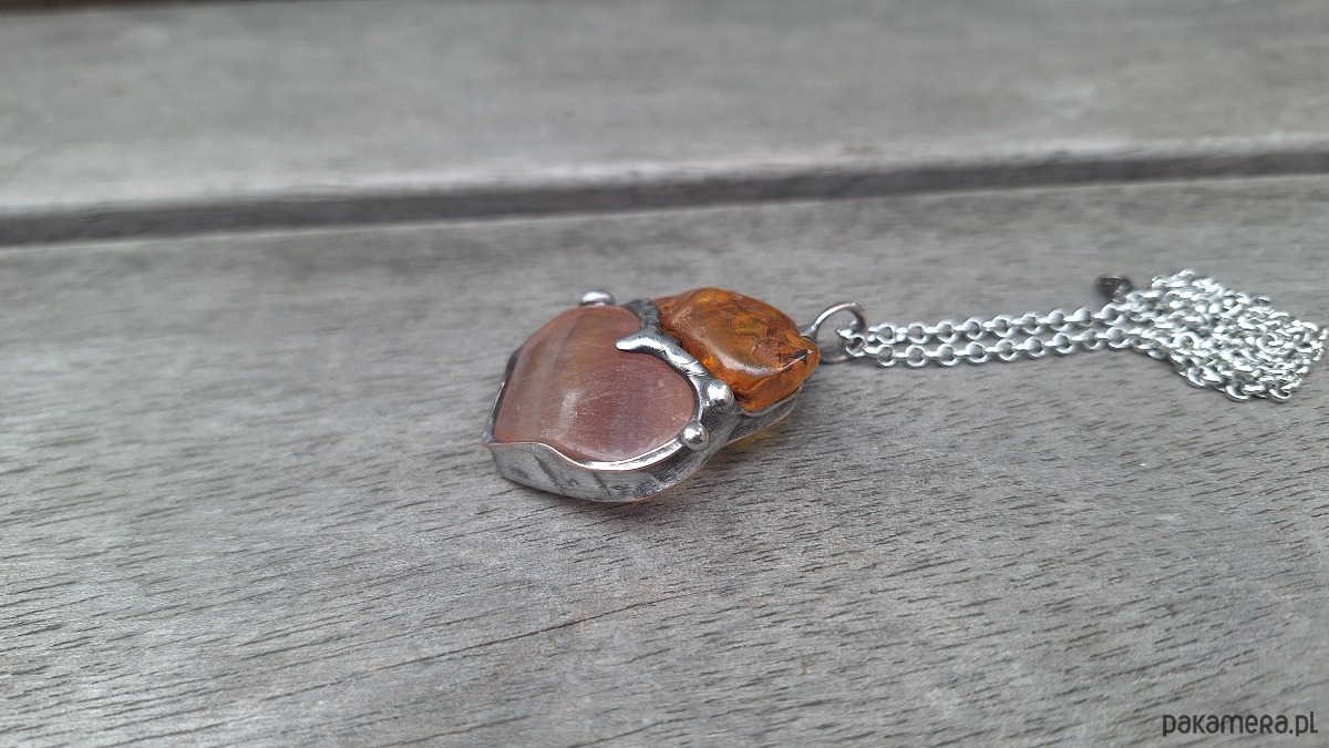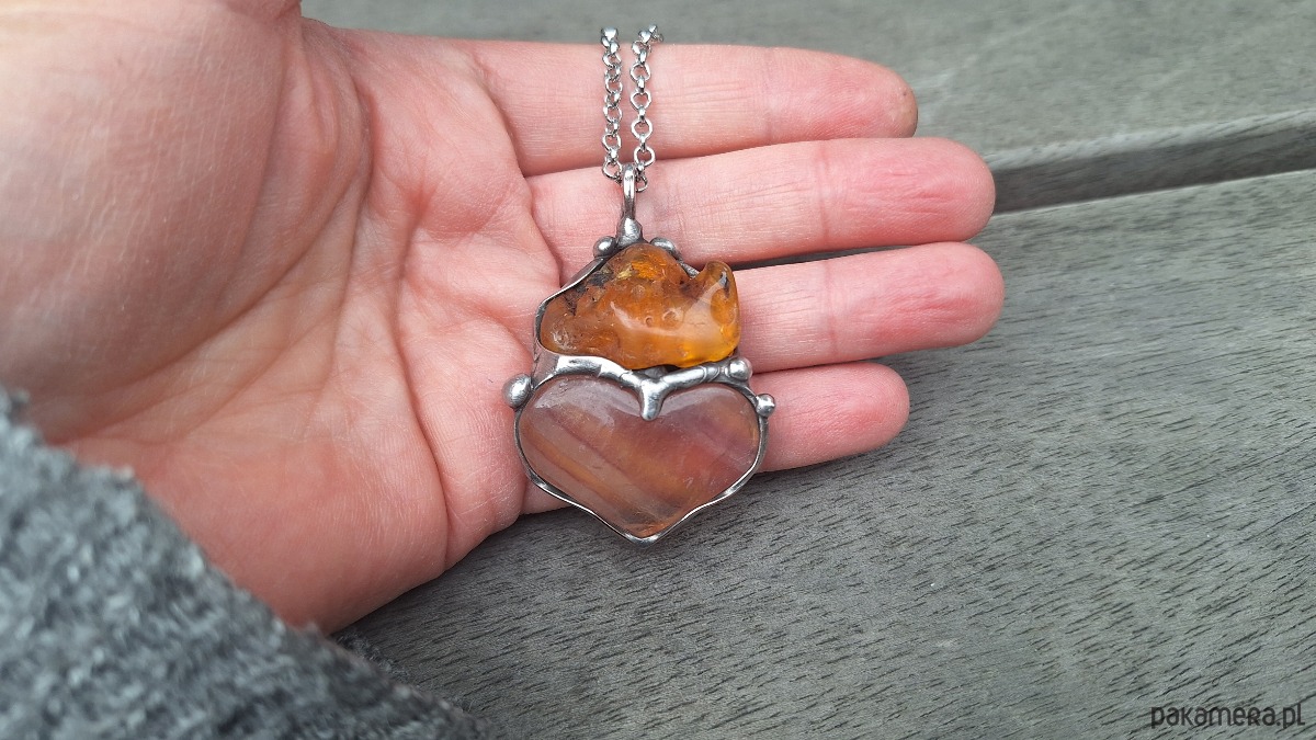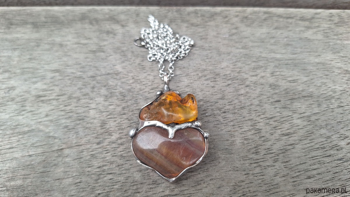 Wisiorek wykonany z miedzi, cyny, bursztynu i fluorytu. Wymiary ok. 4 na 3.5 cm. Zawieszony na łańcuszku o długości ok. 50 cm.