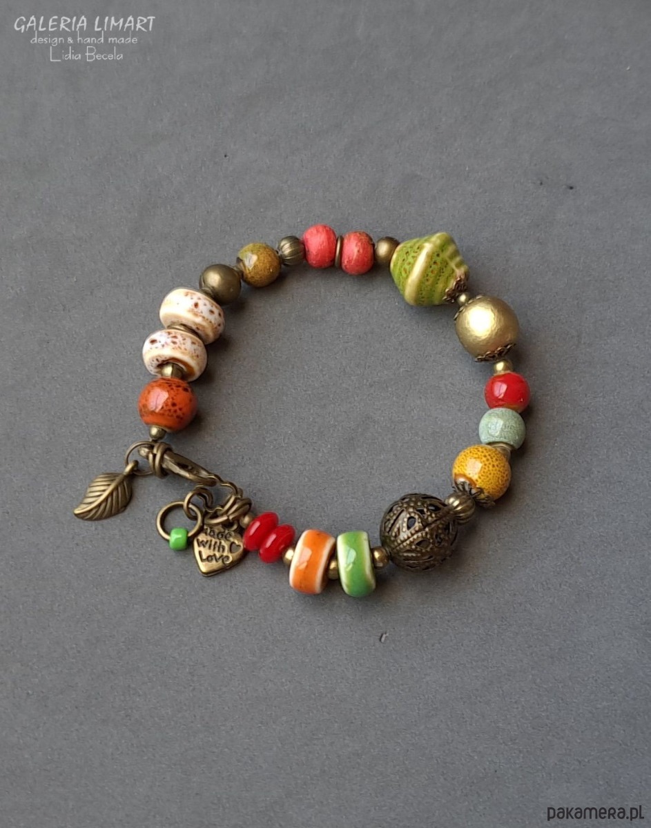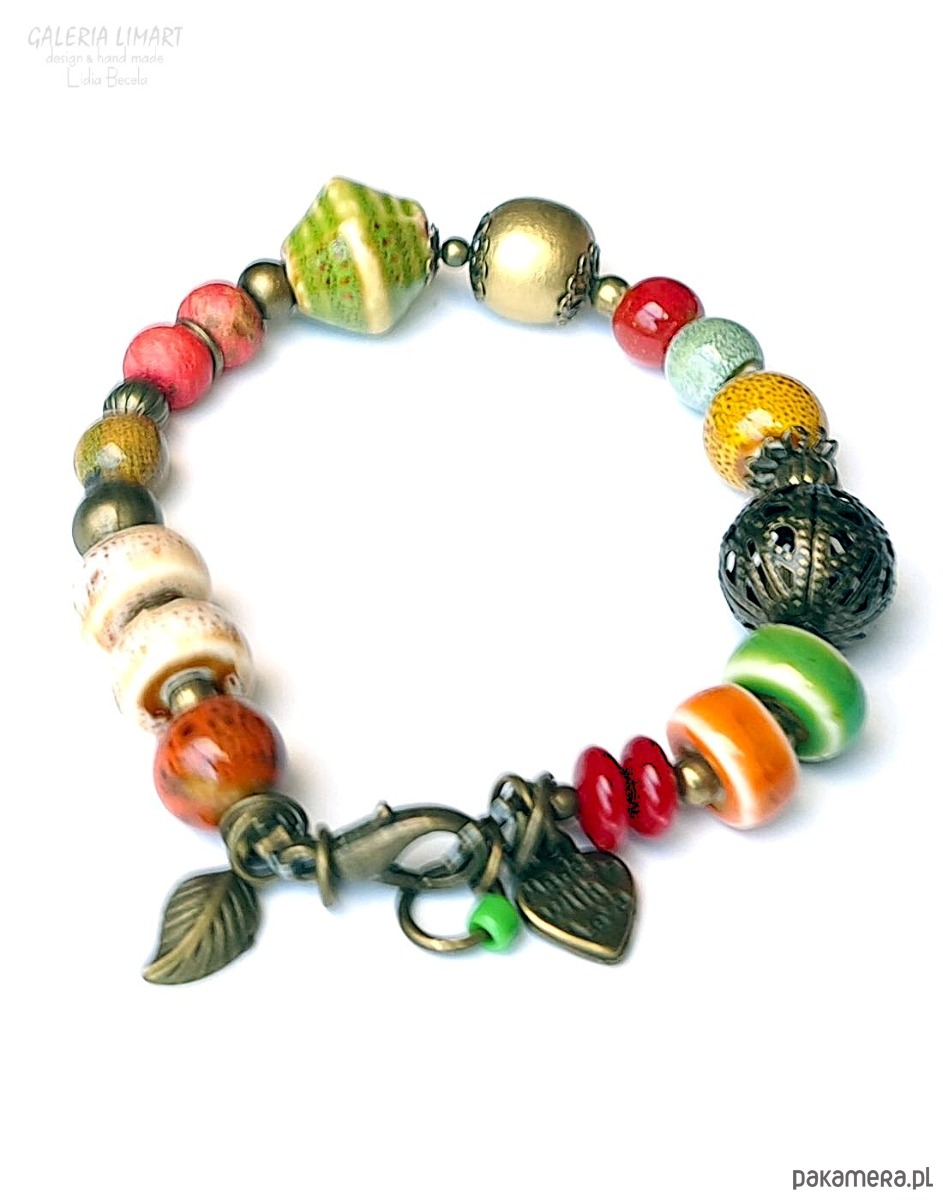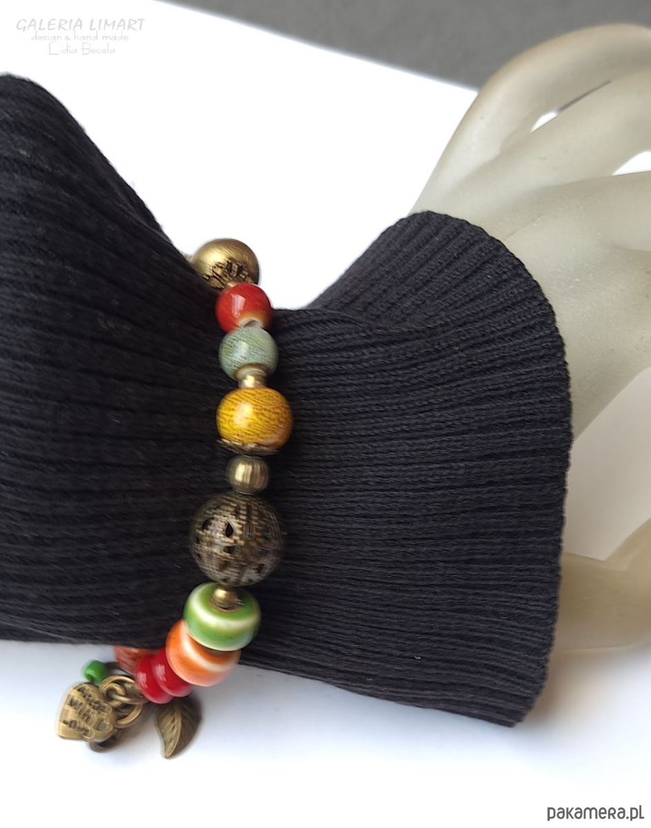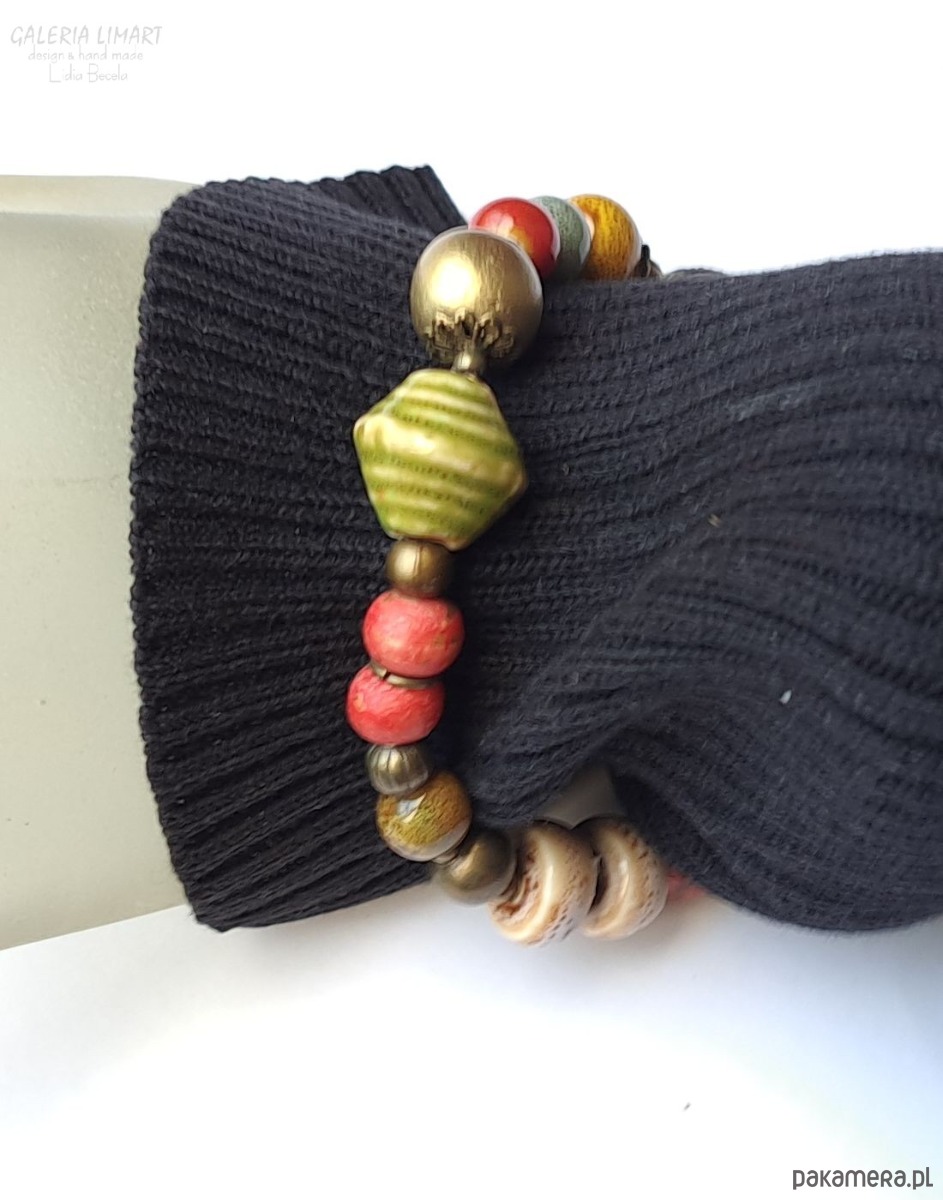 Biżuteria ponadczasowa. Ciekawa i unikatowa, wyrazista i spektakularna bransoleta z unikatowej kompozycji przeróżnych ceramicznych elementów ozdobnych. Korale z ceramiki zostały bardzo starannie dobrane i tak dopasowane w przepięknej kolorystyce jesieni aby powstała czarująca unikatowa bransoletka jedyna w swoim rodzaju. Długość 19-21 cm (regulacja) w sam raz na nadgarstek 15-17 cm. Ten przemyślany melanż została tak stworzony by powstała stylowa bransoletka dla osoby, która doceni jej urodę.
