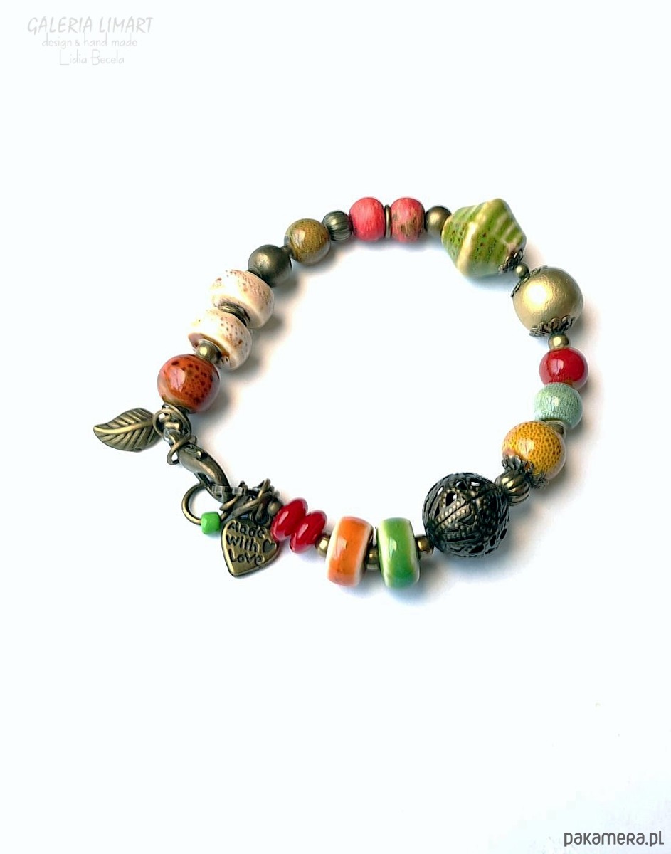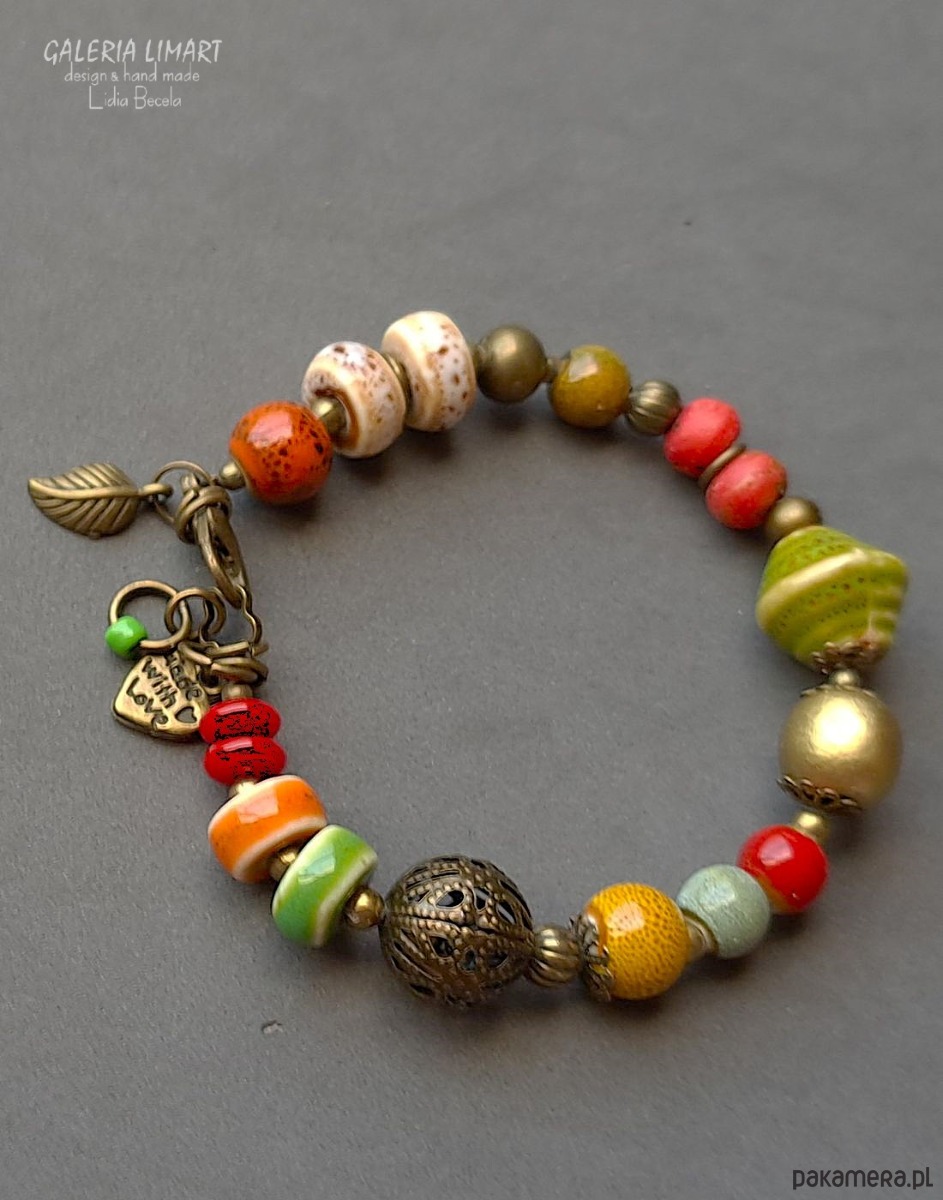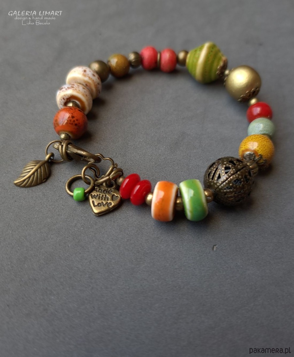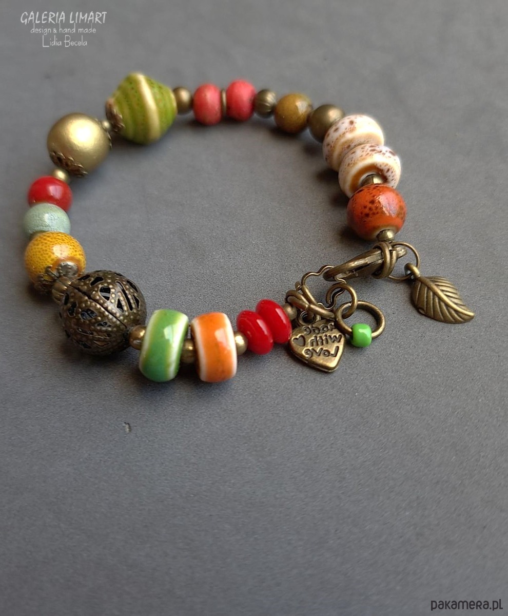 Biżuteria ponadczasowa. Ciekawa i unikatowa, wyrazista i spektakularna bransoleta z unikatowej kompozycji przeróżnych ceramicznych elementów ozdobnych. Korale z ceramiki zostały bardzo starannie dobrane i tak dopasowane w przepięknej kolorystyce jesieni aby powstała czarująca unikatowa bransoletka jedyna w swoim rodzaju. Długość 19-21 cm (regulacja) w sam raz na nadgarstek 15-17 cm. Ten przemyślany melanż została tak stworzony by powstała stylowa bransoletka dla osoby, która doceni jej urodę.