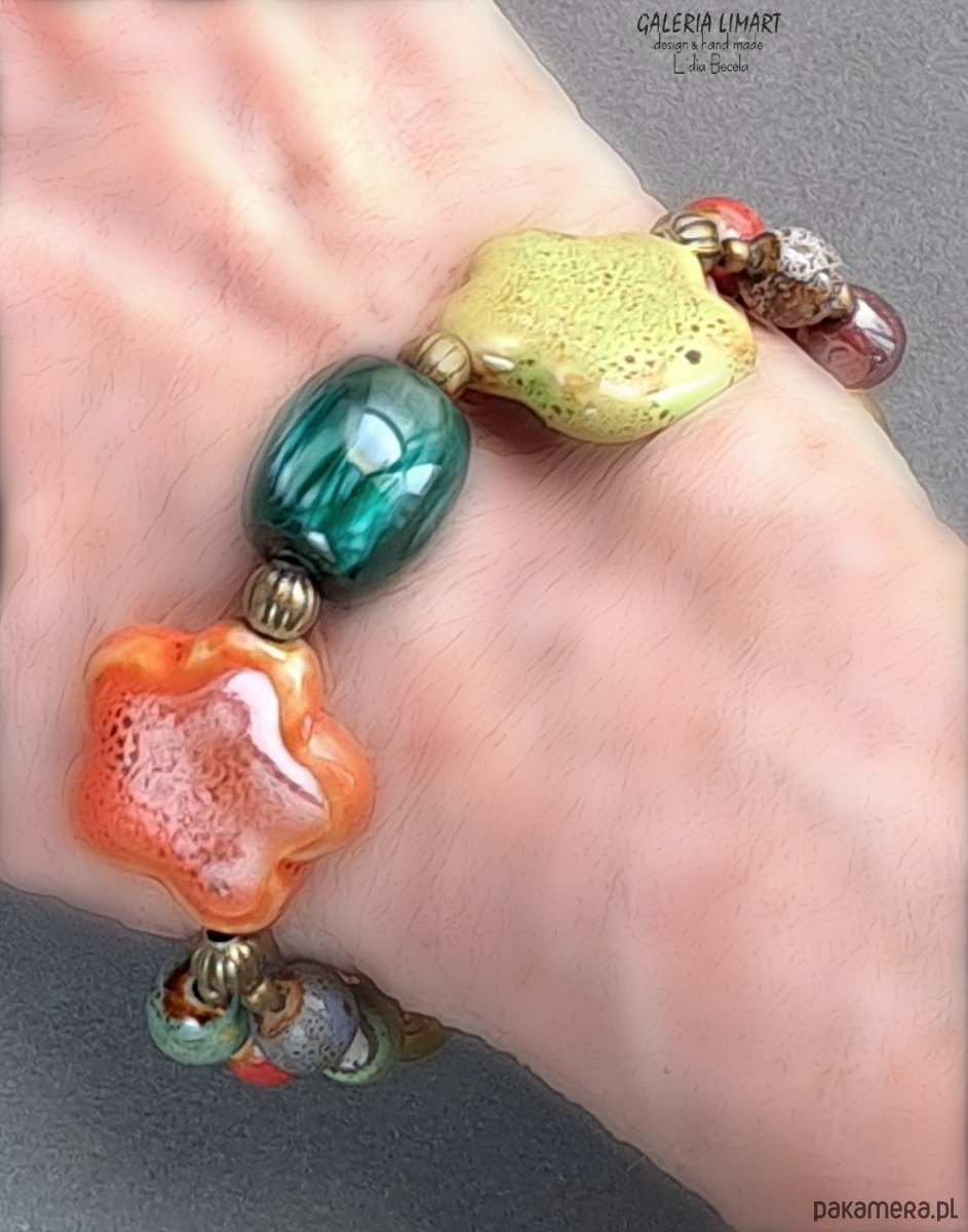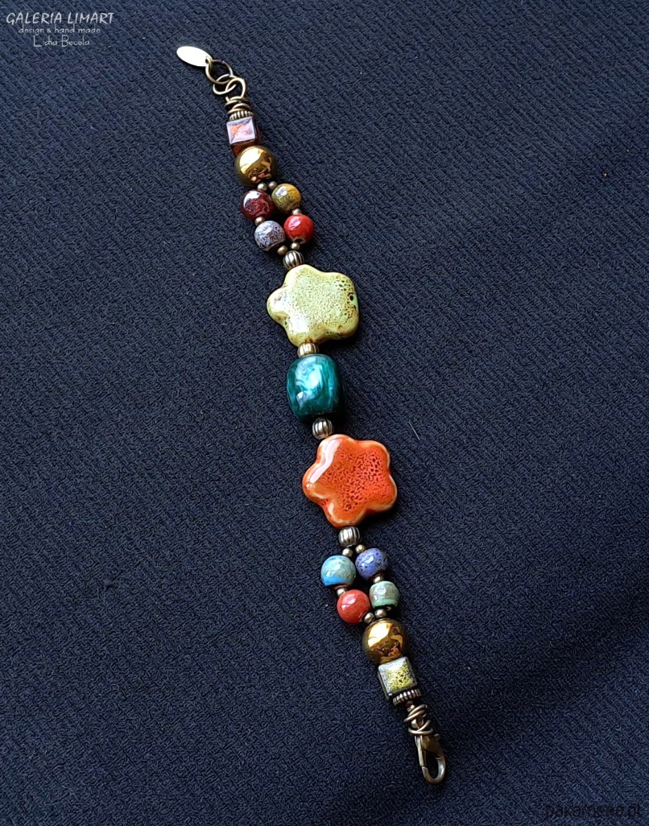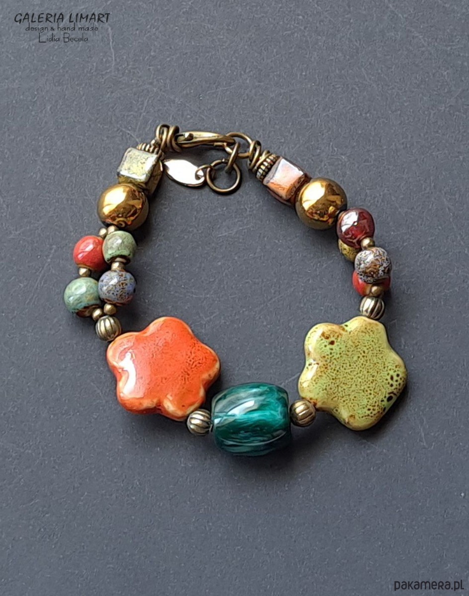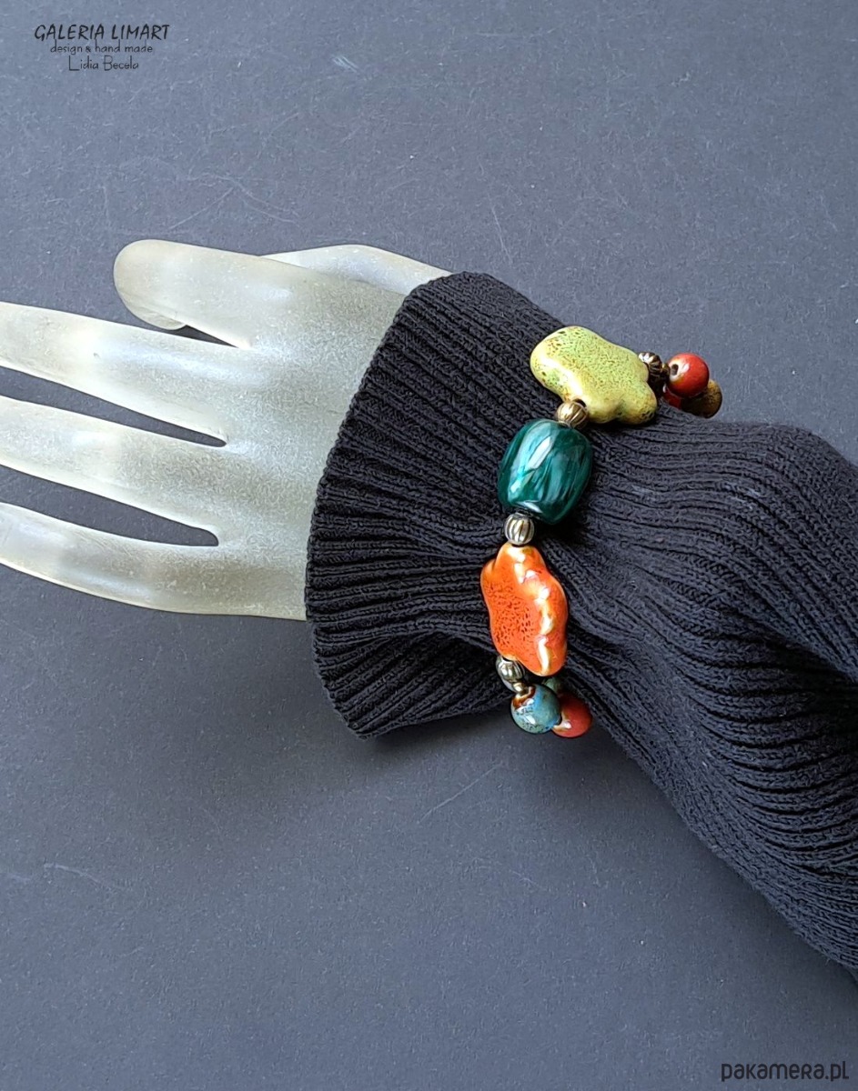 Biżuteria ponadczasowa. Ciekawa i unikatowa, wyrazista i spektakularna bransoleta z unikatowej kompozycji przeróżnych ceramicznych elementów ozdobnych. Korale z ceramiki zostały bardzo starannie dobrane i tak dopasowane w przepięknej kolorystyce jesieni aby powstała czarująca unikatowa bransoletka jedyna w swoim rodzaju. Długość 19-21 cm (regulacja) w sam raz na nadgarstek 15-17 cm. Ten przemyślany melanż została tak stworzony by powstała stylowa bransoletka dla osoby, która doceni jej urodę.