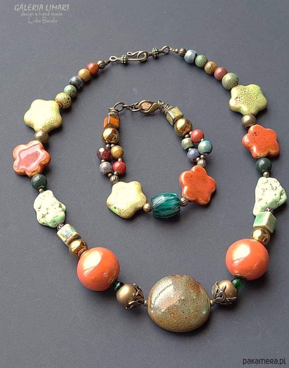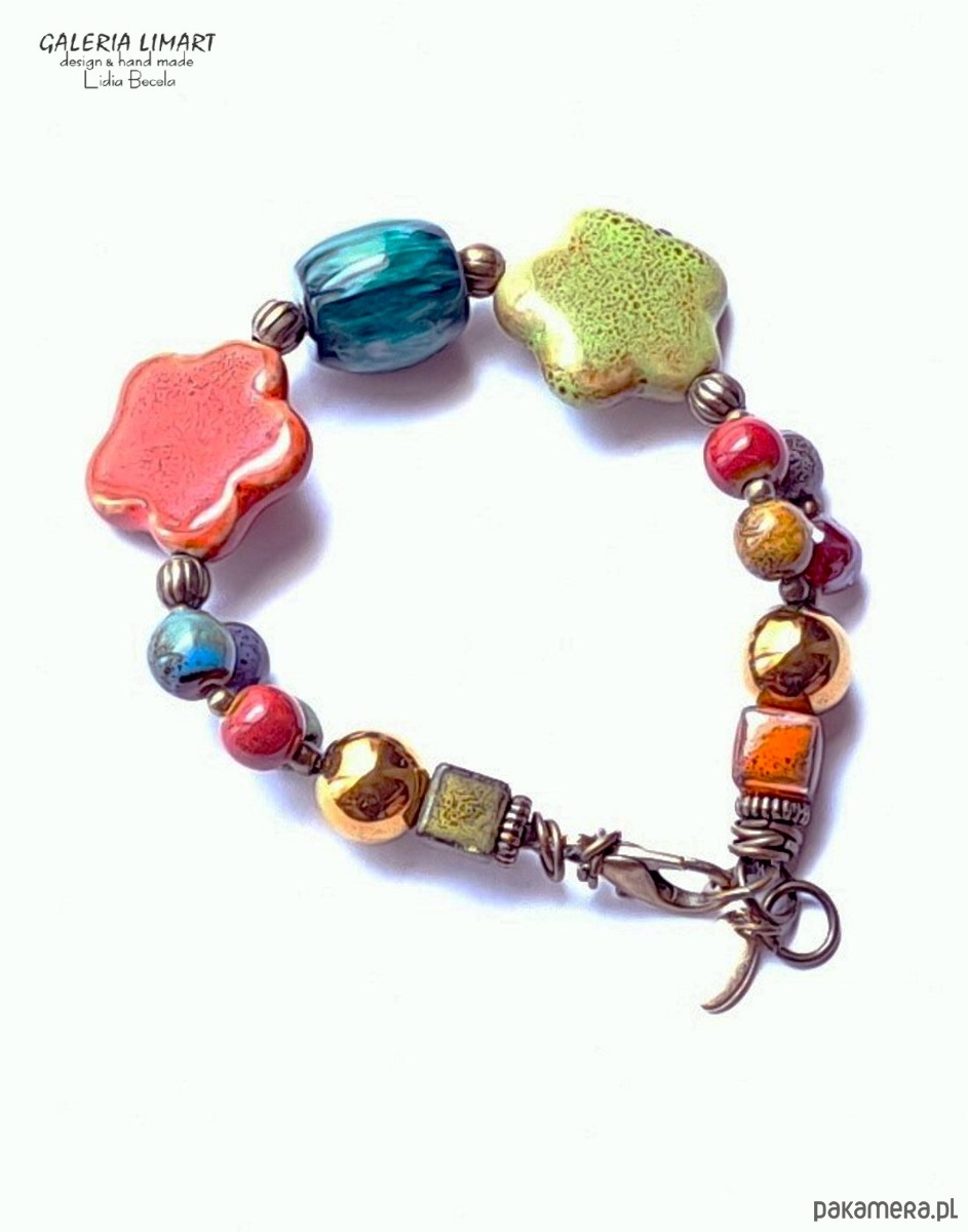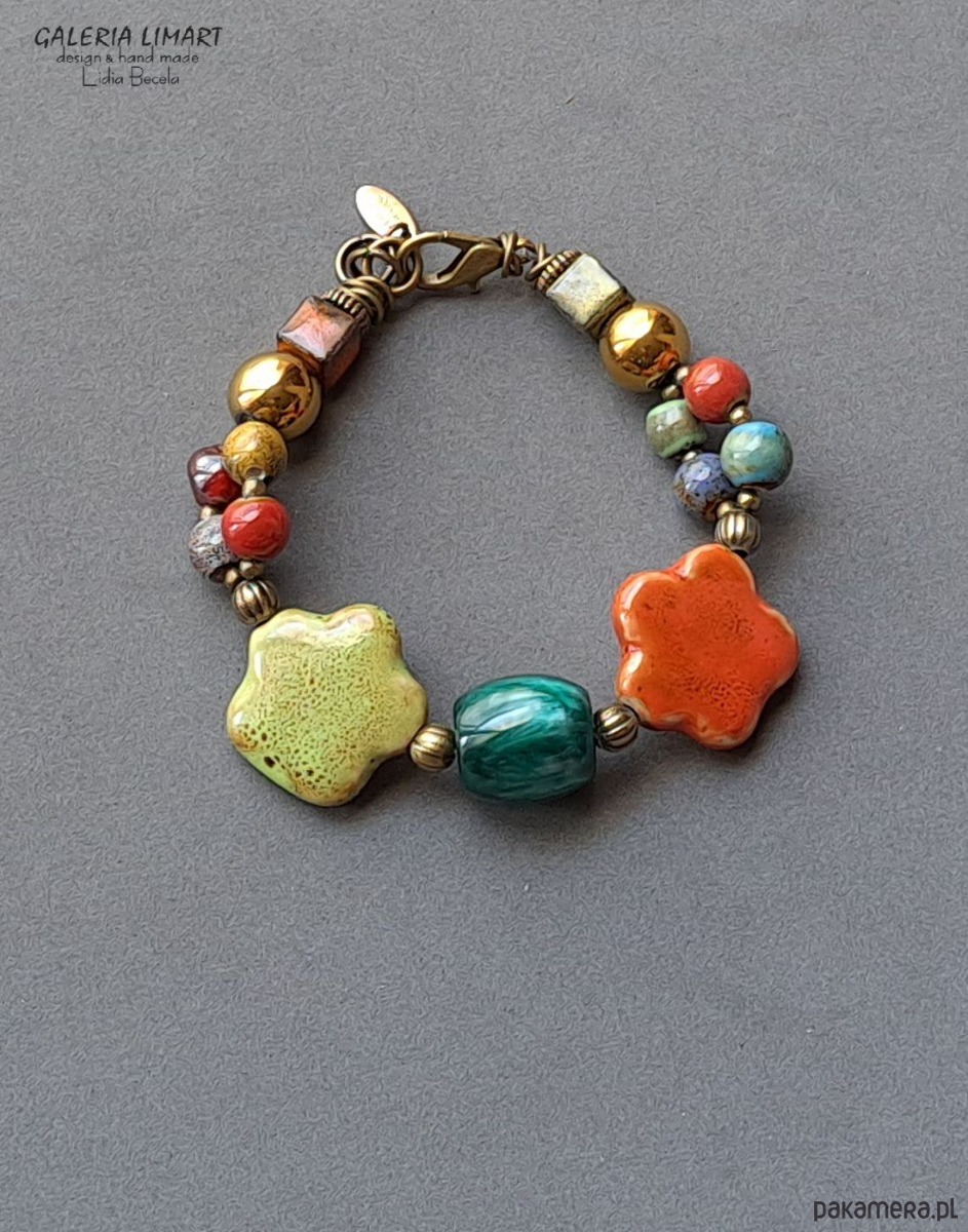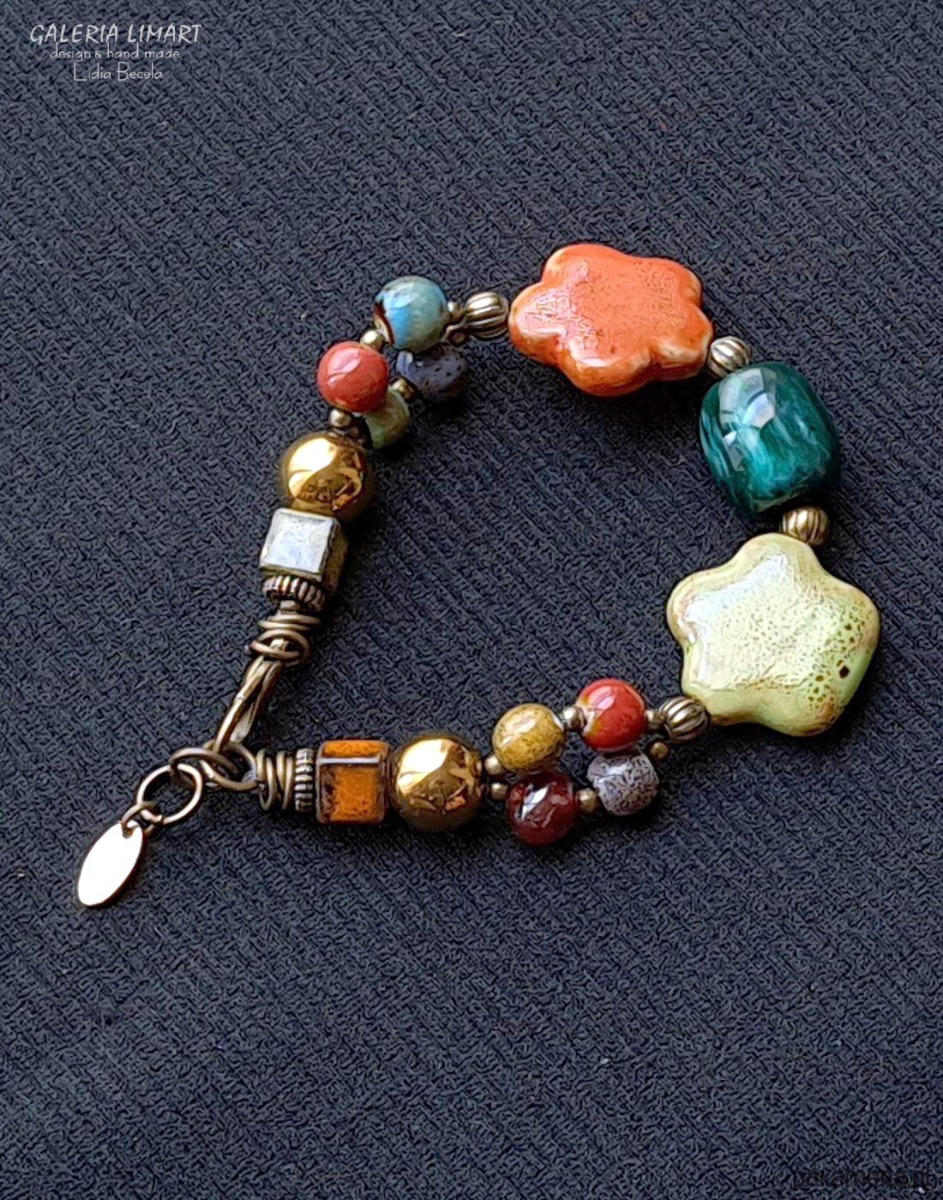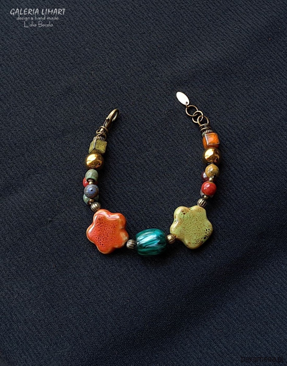 Biżuteria ponadczasowa. Ciekawa i unikatowa, wyrazista i spektakularna bransoleta z unikatowej kompozycji przeróżnych ceramicznych elementów ozdobnych. Korale z ceramiki zostały bardzo starannie dobrane i tak dopasowane w przepięknej kolorystyce jesieni aby powstała czarująca unikatowa bransoletka jedyna w swoim rodzaju. Długość 19-21 cm (regulacja) w sam raz na nadgarstek 15-17 cm. Ten przemyślany melanż została tak stworzony by powstała stylowa bransoletka dla osoby, która doceni jej urodę.