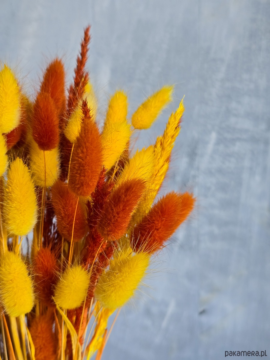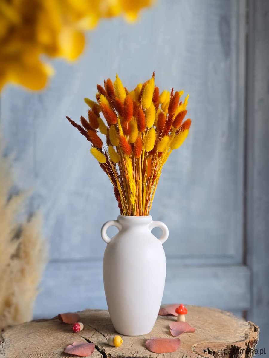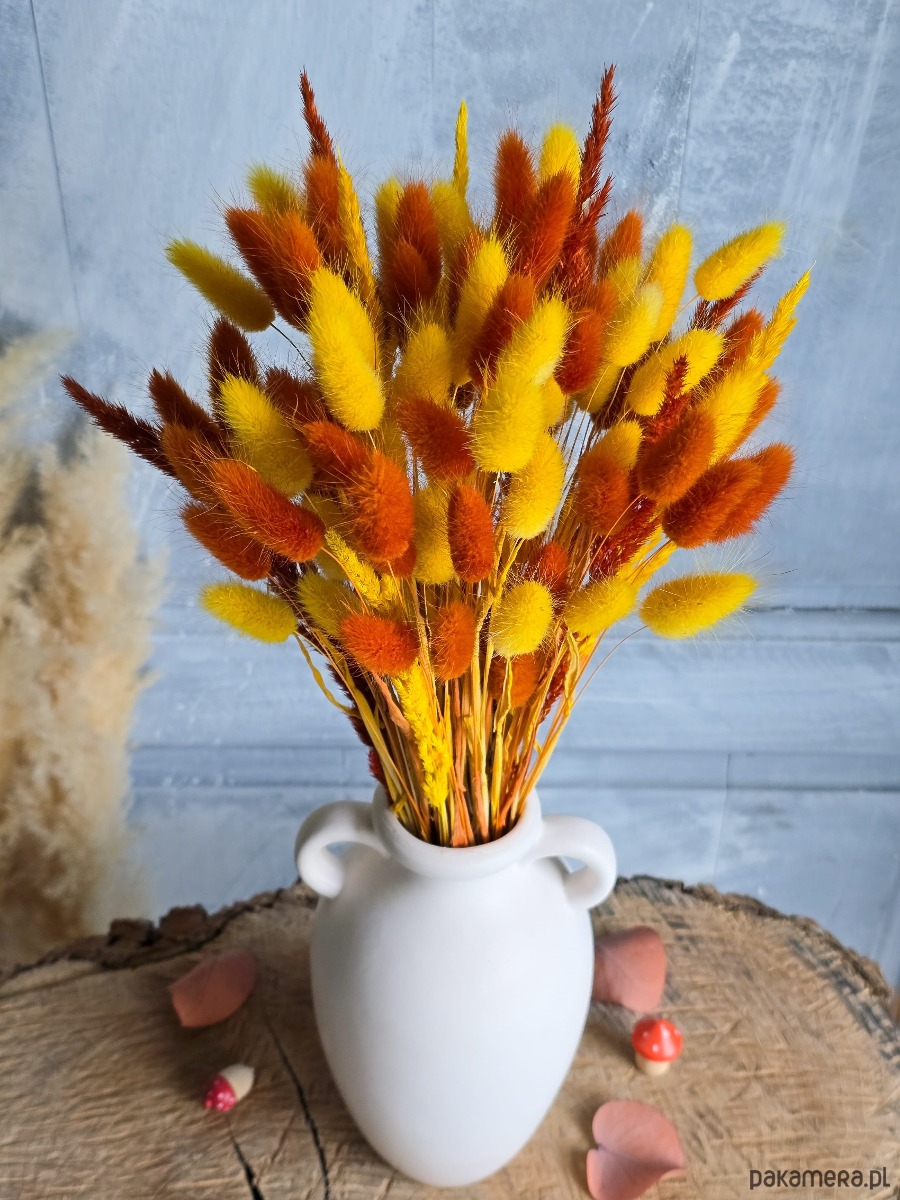 Suszony dmuszek jajowaty (lagurus) i trawki w kolorze żółtym i rudym tworzą przytulną, jesienną atmosferę, idealną do dekoracji ulubionego wazonu w domu, biurze lub jako sezonowy prezent.