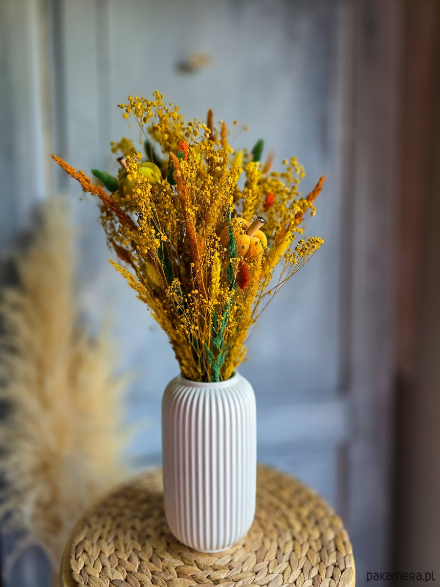 💛 Wprowadź do wnętrza odrobinę jesiennego ciepła dzięki tej wyjątkowej kompozycji z suszonych kwiatów i uroczych materiałowych dyń. Bukiet w odcieniach żółtego, zielonego i pomarańczowego łączy stabilizowaną gipsówkę, dmuszek jajowaty, kanar, suszone trawy oraz małe dynie z materiału – wszystko to tworzy rustykalny, przytulny klimat.