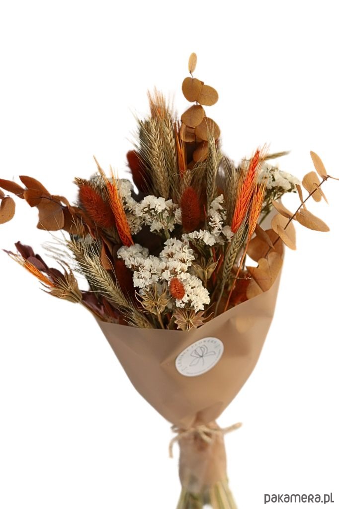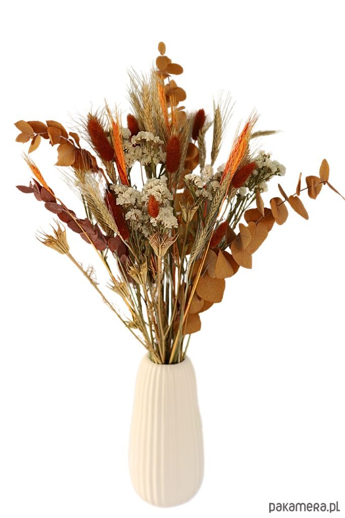 Ten wyjątkowy jesienny bukiet do wazonu, to idealna jesienna dekoracja wnętrza, która wprowadzi ciepły, rustykalny klimat do Twojego domu. Bukiet wykonany z wyselekcjonowanych suszonych i stabilizowanych roślin, takich jak suszona czarnuszka i pszenica, biały zatrwian, brązowy dmuszek oraz stabilizowany eukaliptus w odcieniach czerwieni i pomarańczy.