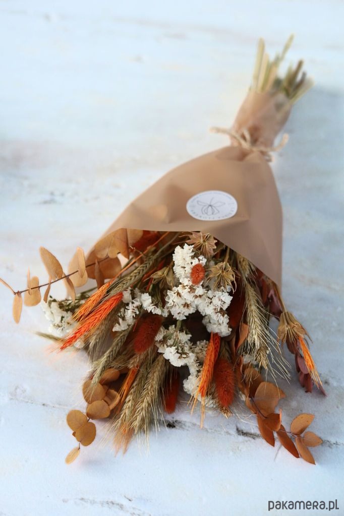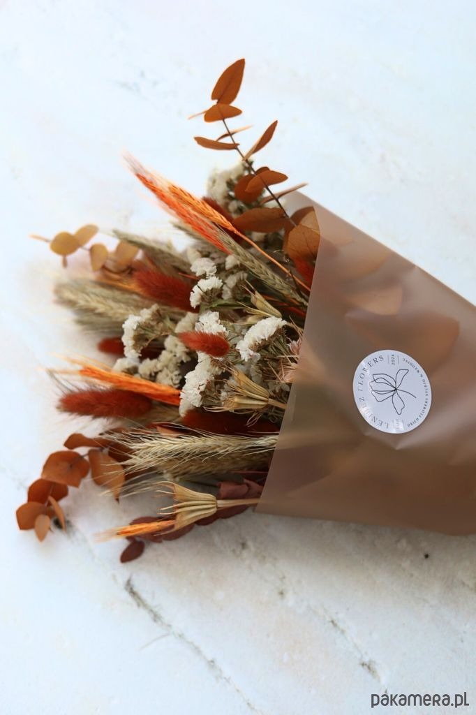 Bukiet jest trwały i nie wymaga wody, co czyni go doskonałym wyborem na długotrwałą jesienną dekorację.