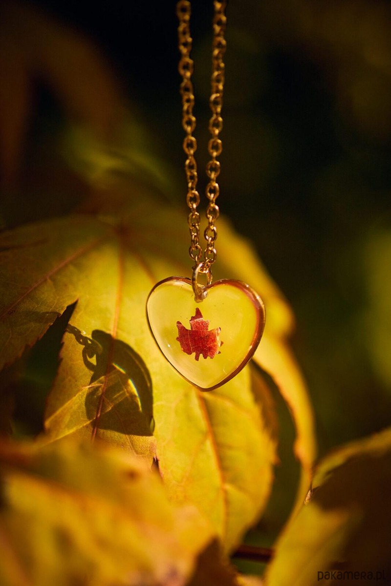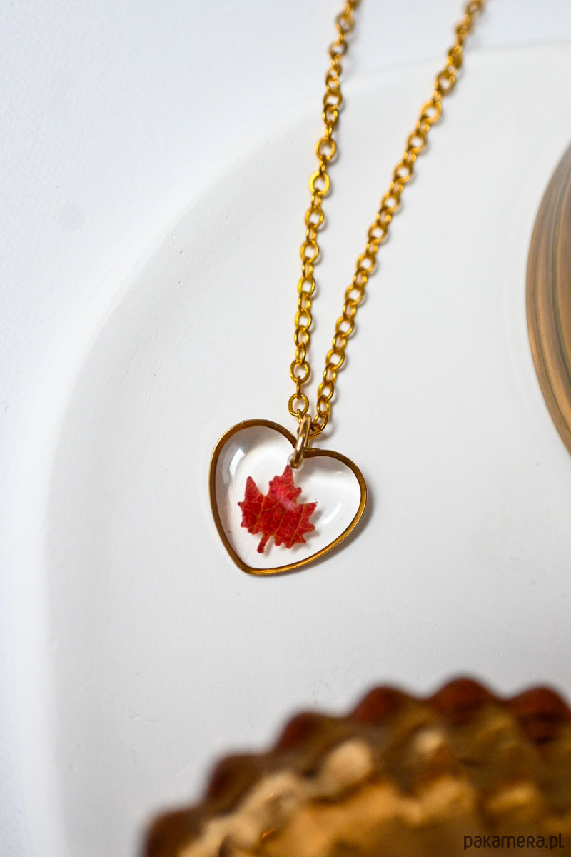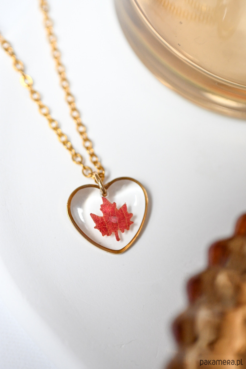 Lekki, jesienny naszyjnik-serduszko to unikatowa biżuteria, która subtelnie dopełni każdą stylizację. W środku zawieszki zatopiony jest zasuszony liść klonu drobnolistnego, zachowany w krystalicznie czystej żywicy epoksydowej odpornej na promieniowanie UV.