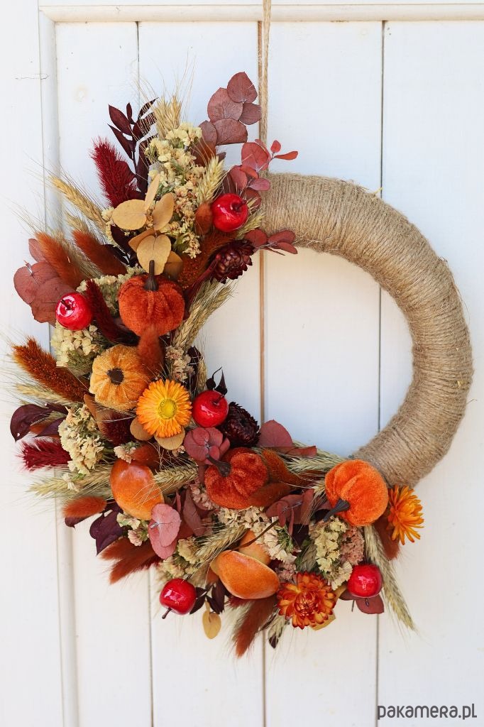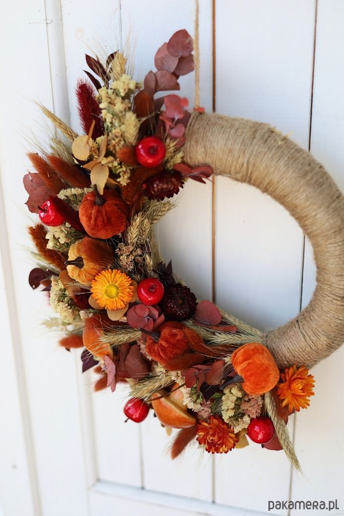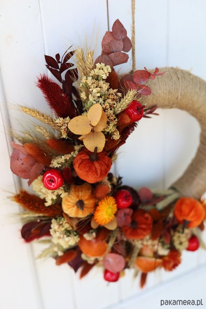 W kompozycji znajdziesz takie rośliny jak eukaliptus, proso, zatrwian, zboża, kocanki, dmuszek i ruskus, które tworzą harmonijną całość. Dodatkowo, wianek na drzwi został ozdobiony dekoracyjnymi welurowymi dyniami, grzybkami oraz czerwonymi jabłuszkami, które podkreślają sezonowy charakter tej ozdoby. Idealny do zawieszenia na drzwiach lub ścianie, ten wianek wniesie jesienną atmosferę do każdego wnętrza.