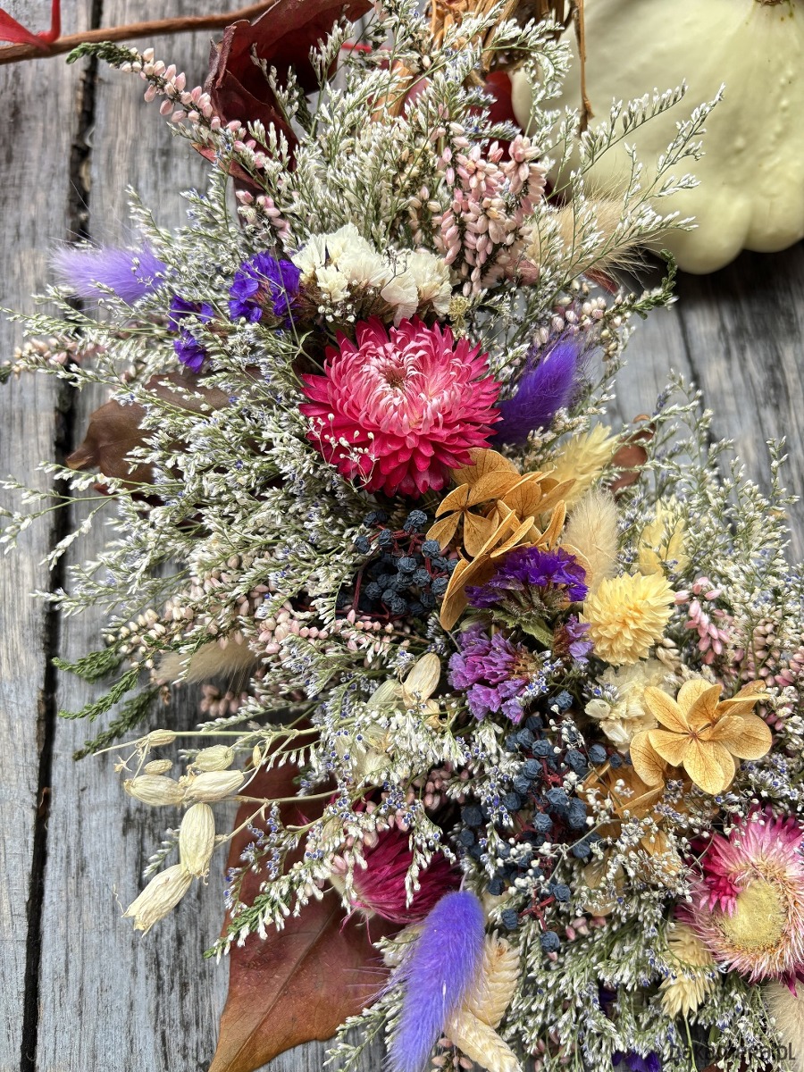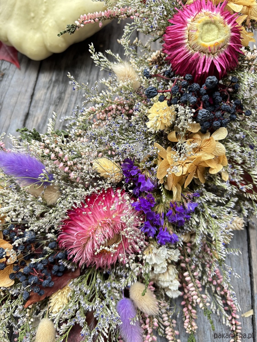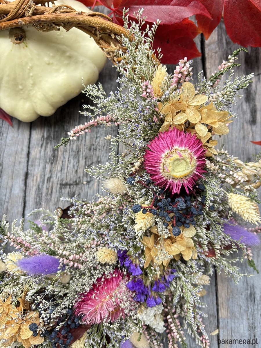 Znajdziecie tu również delikatne dmuszki, jesienny wrzos i stabilizowane hortensje.