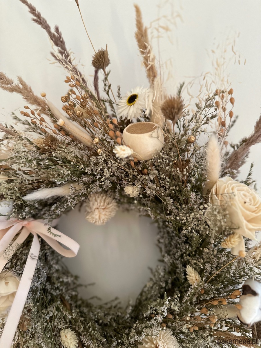 Duży wianek wykonany na słomianym podkładzie z wykorzystaniem roślin: zatrwian, gipsówka, bell cup, bawełna, kwiaty shola, dmuszek, kanar i inne