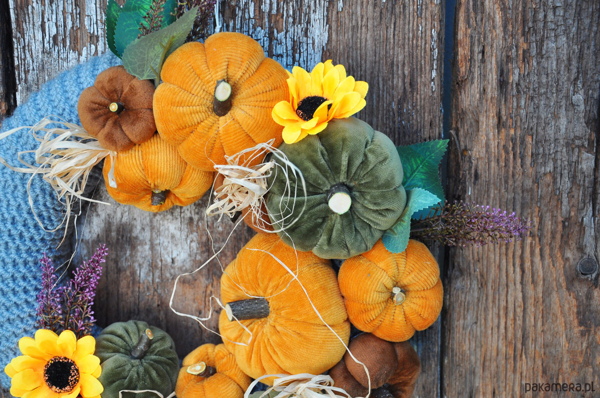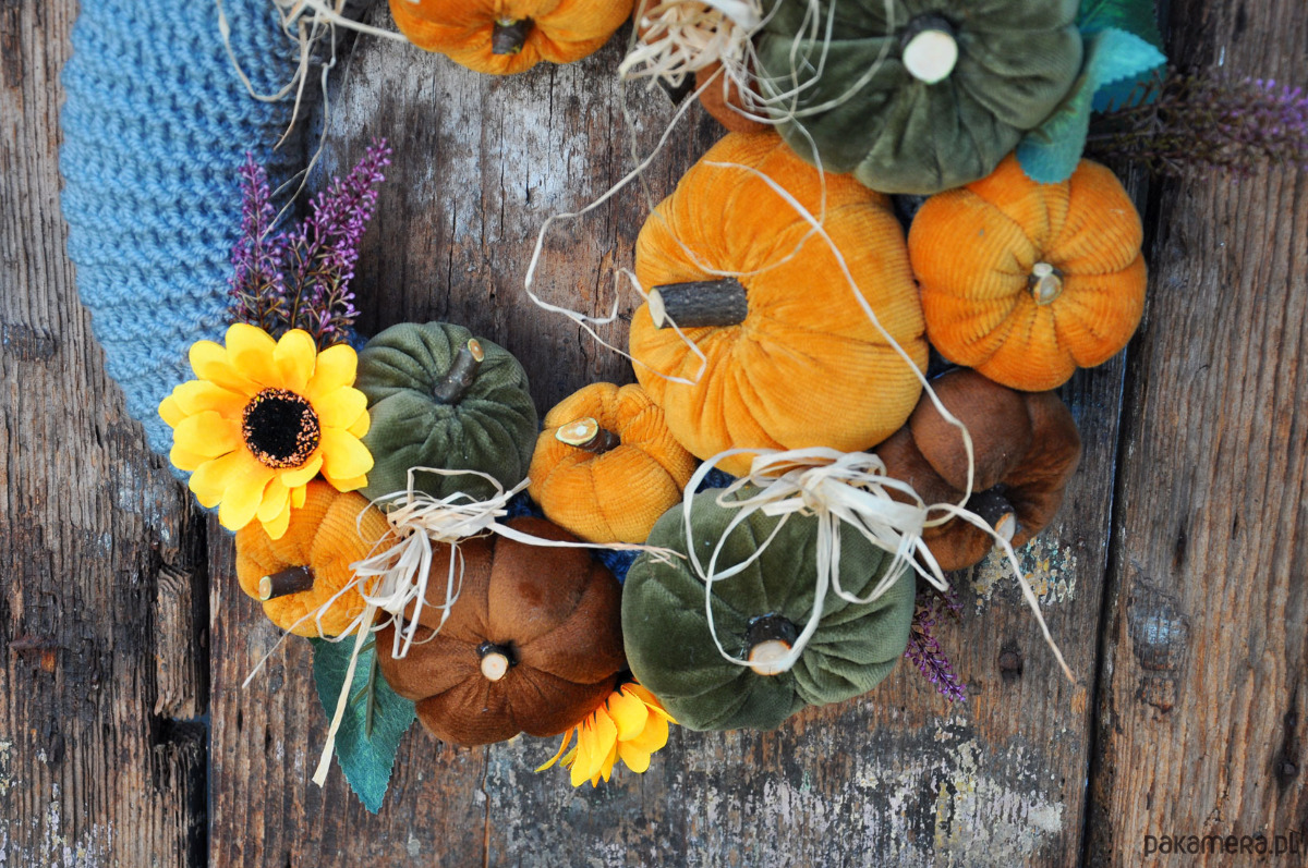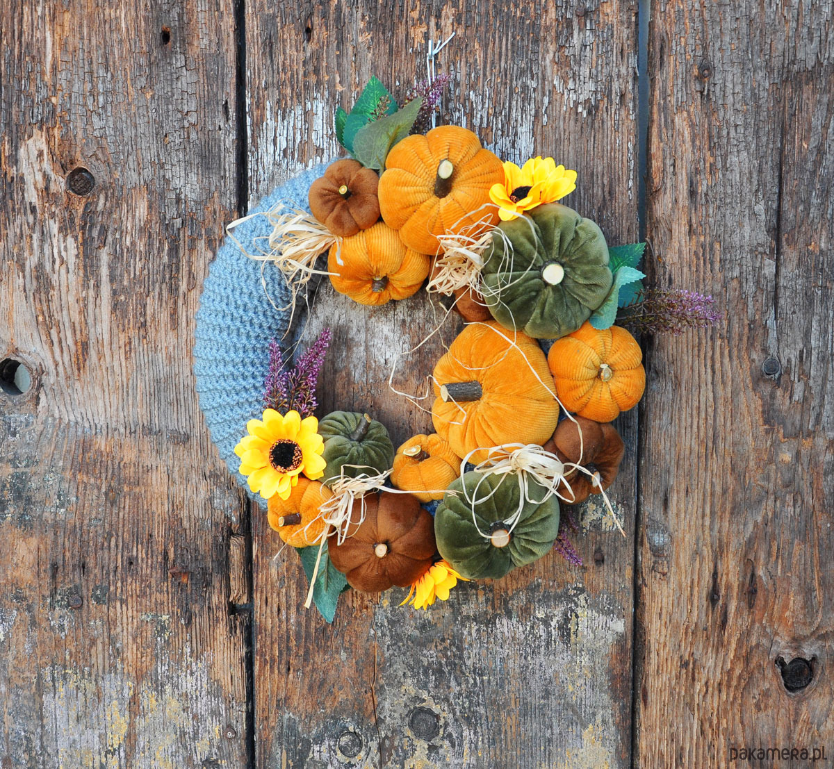 Piękny i wyjątkowy jesienny wianek z ręcznie szytymi dyńkami i słonecznikami, wianek w dzierganym sweterku ; średnica ok.30cm; wianek przystosowany do powieszenia na drzwiach, ścianie lub w oknie; zapraszam serdecznie