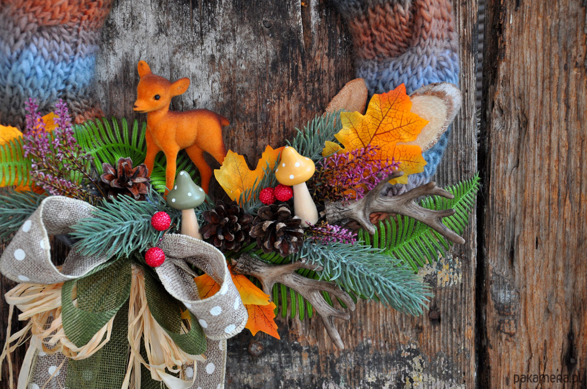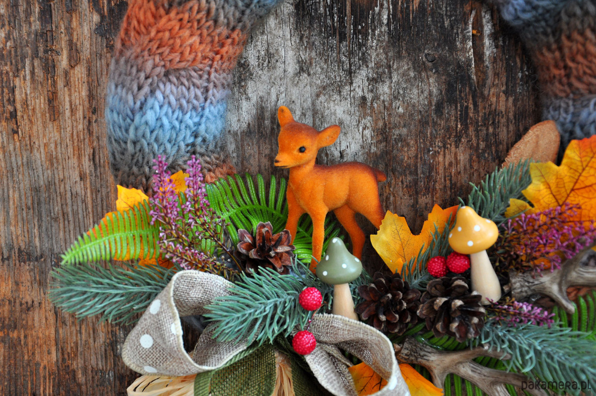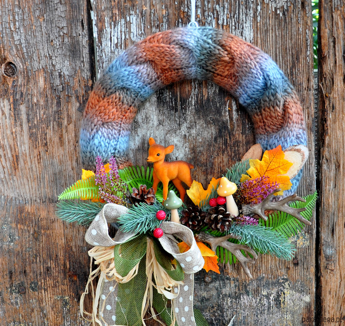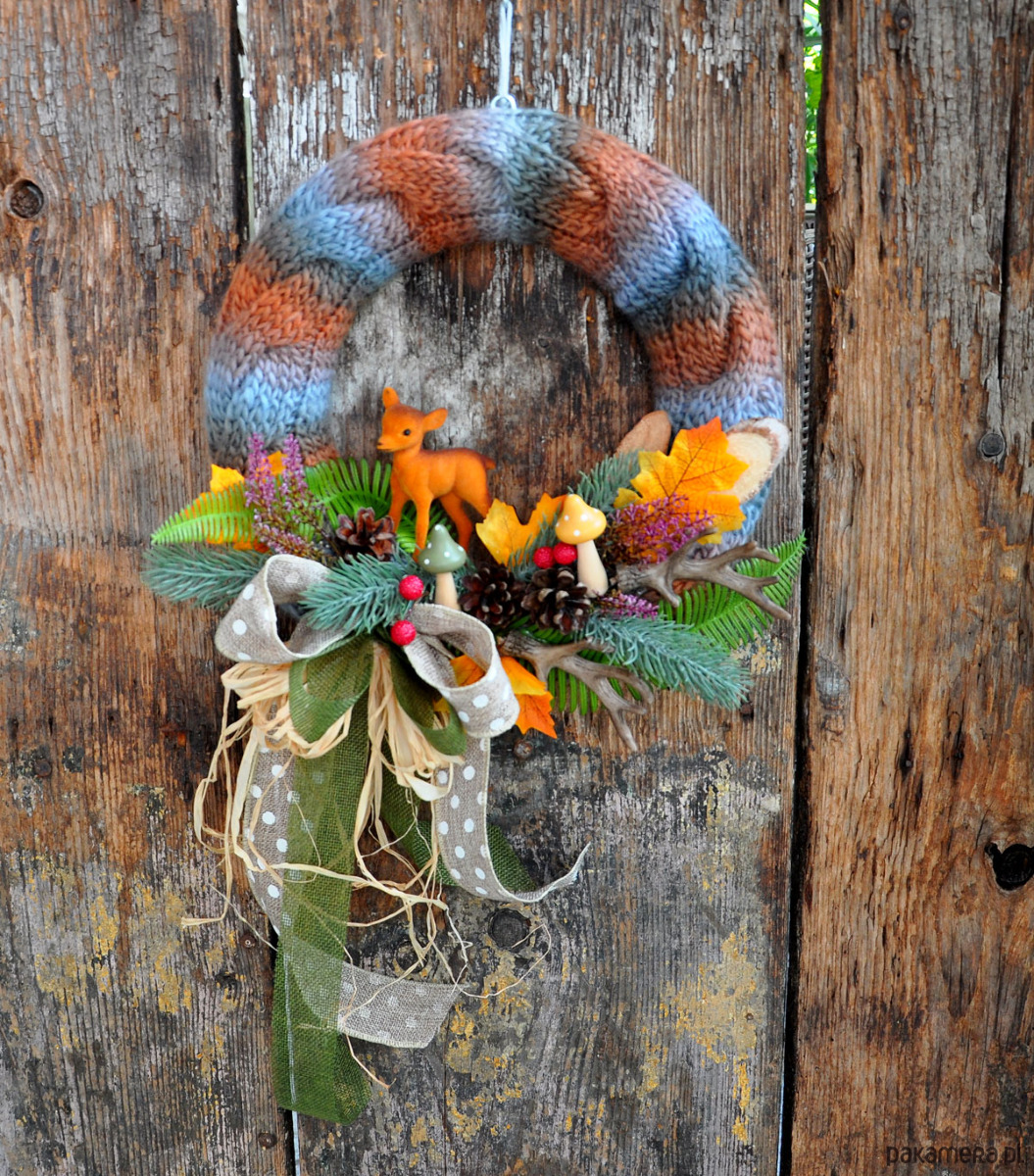 Piękny i wyjątkowy jesienny wianek z lesnymi dodatkami, wianek w dzierganym sweterku ; średnica ok.30cm; wianek przystosowany do powieszenia na drzwiach, ścianie lub w oknie; zapraszam serdecznie