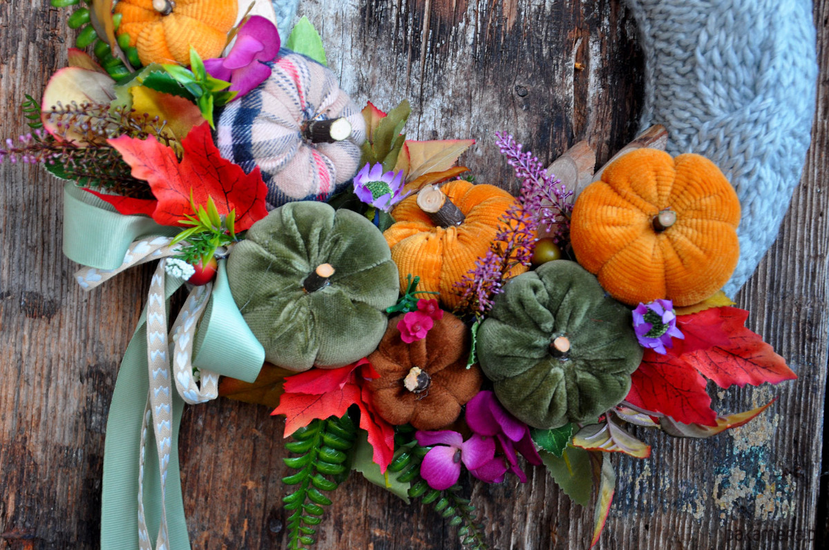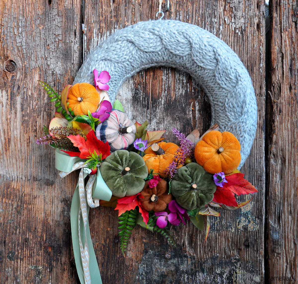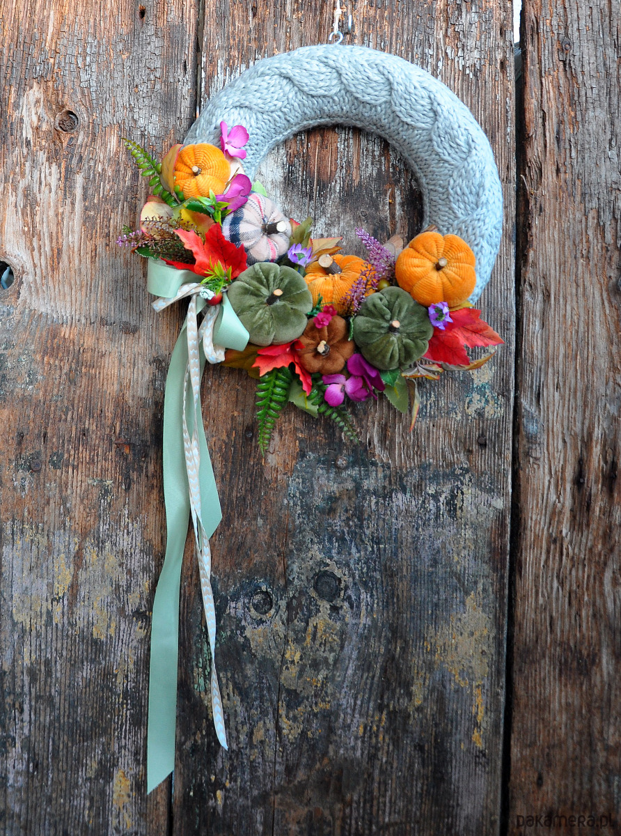 Piękny i wyjątkowy jesienny wianek w dzierganym sweterku z ręcznie szytymi dyńkami; średnica ok.30cm; wianek przystosowany do powieszenia na drzwiach, ścianie lub w oknie;