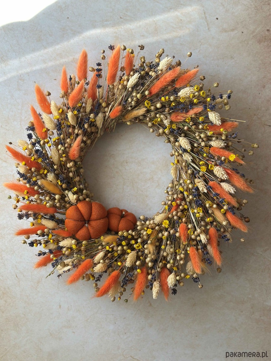Ozdoba wypleciona ręcznie. Ta radosna dekoracja doda uroku każdemu miejscu i będzie wyjątkową ozdobą drzwi lub ściany. Starannie dobrane kolory roślin tworzą harmonijną kompozycję i będą Dodatkową dekoracją są również ręcznie szyte, materiałowe dynie. Wianek będzie cieszyć Cię przez długi czas, dzięki trwałości roślin suszonych.