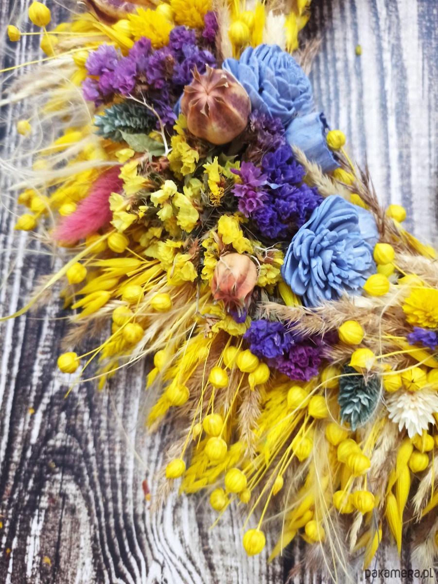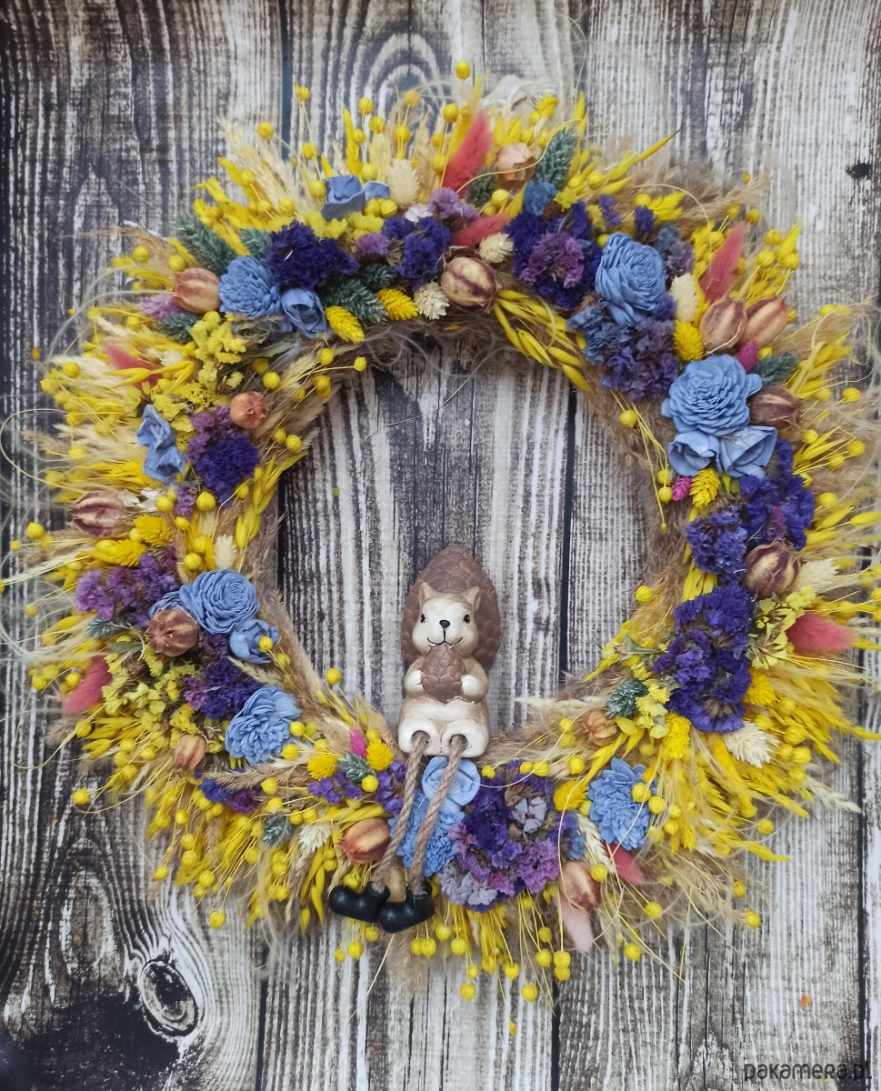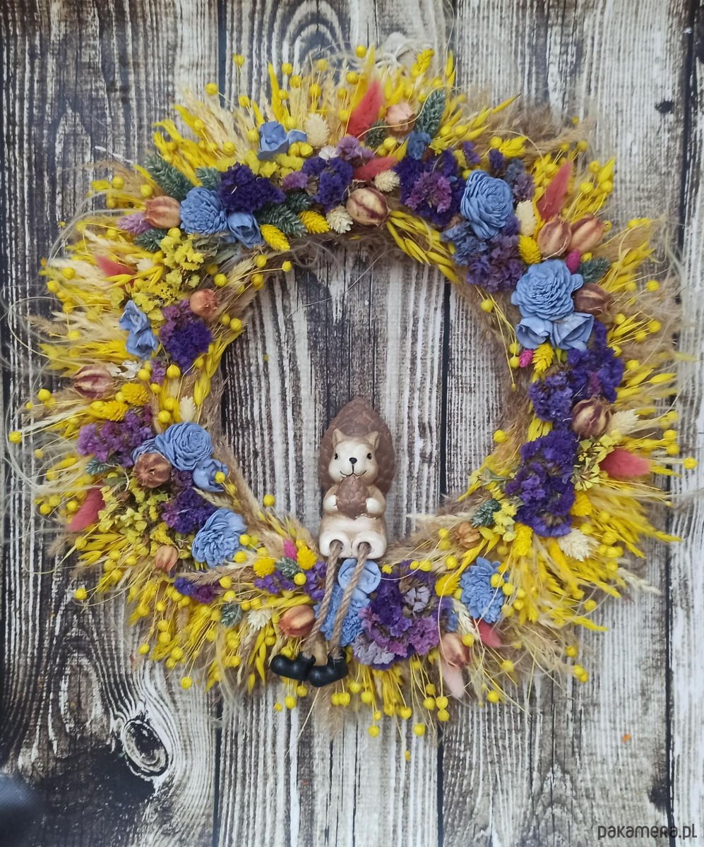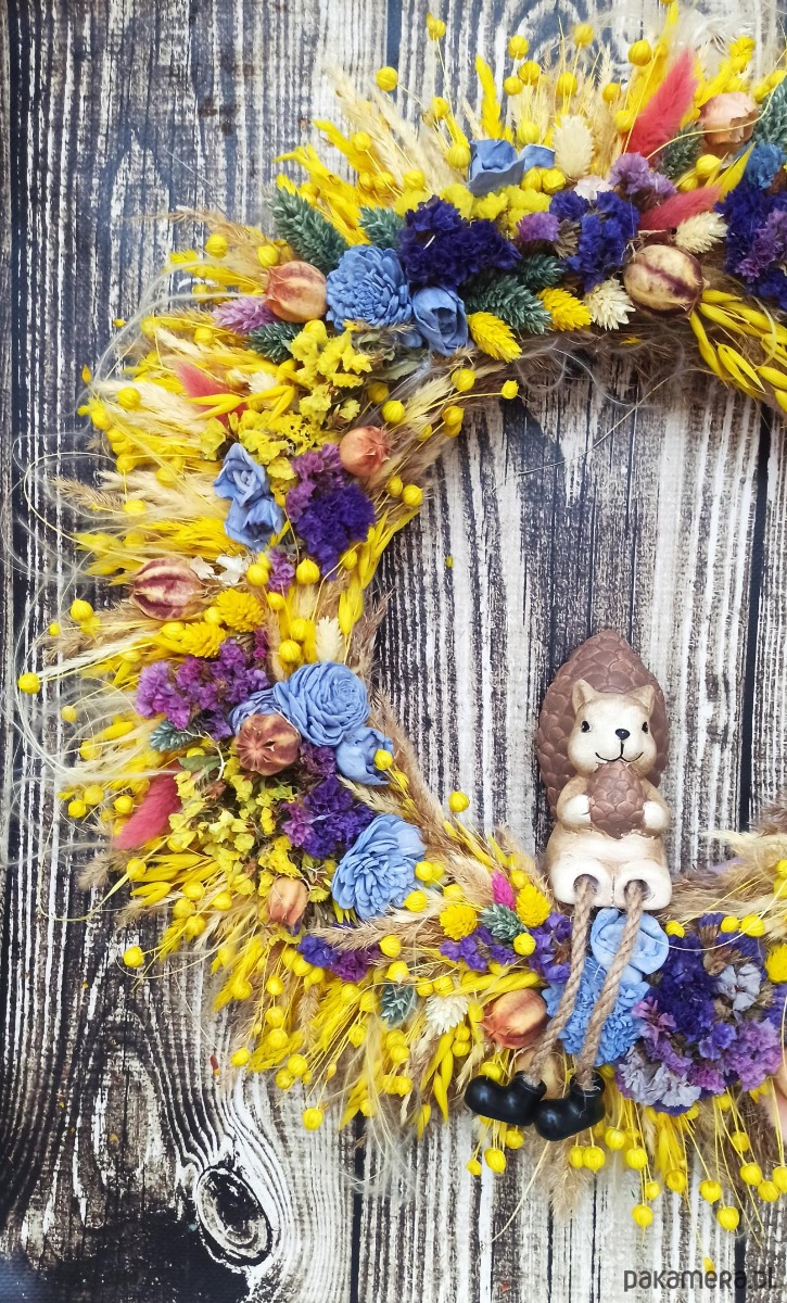 Unikatowy wianek wykonany z suszu, jest wyjątkową i ekologiczną dekoracją drzwi wejściowych, symbolem powitania gości oraz zapowiedzią radosnej, uroczystej lub świątecznej atmosfery.