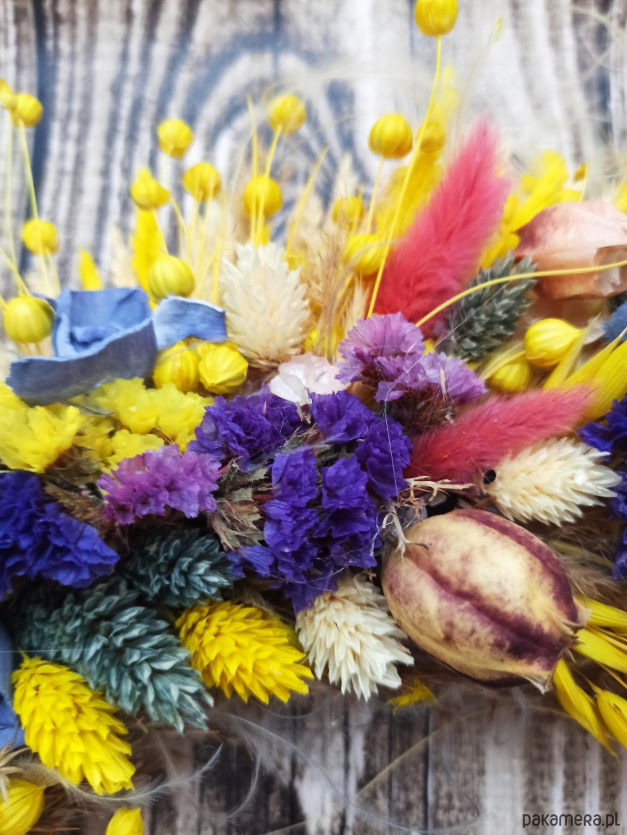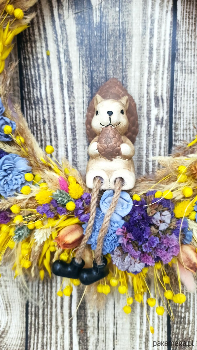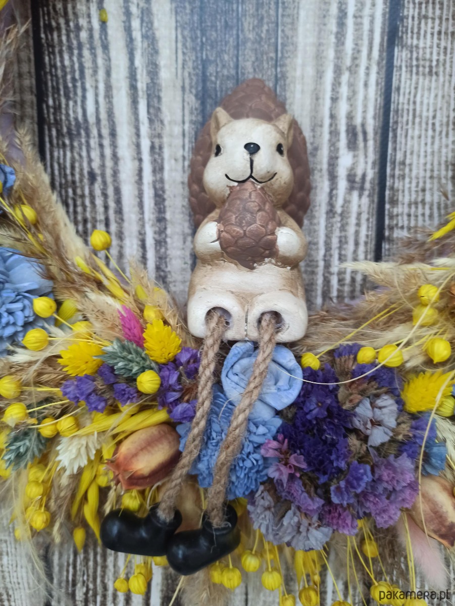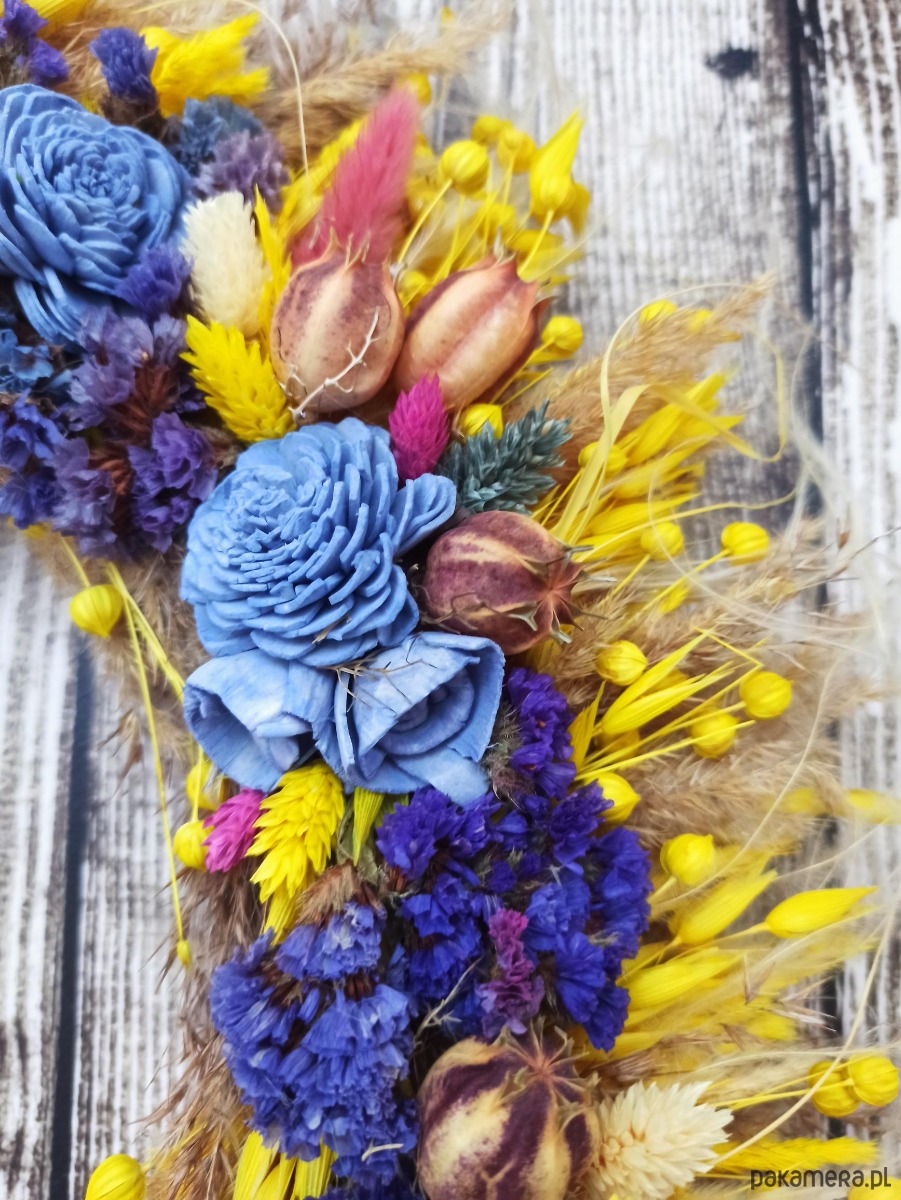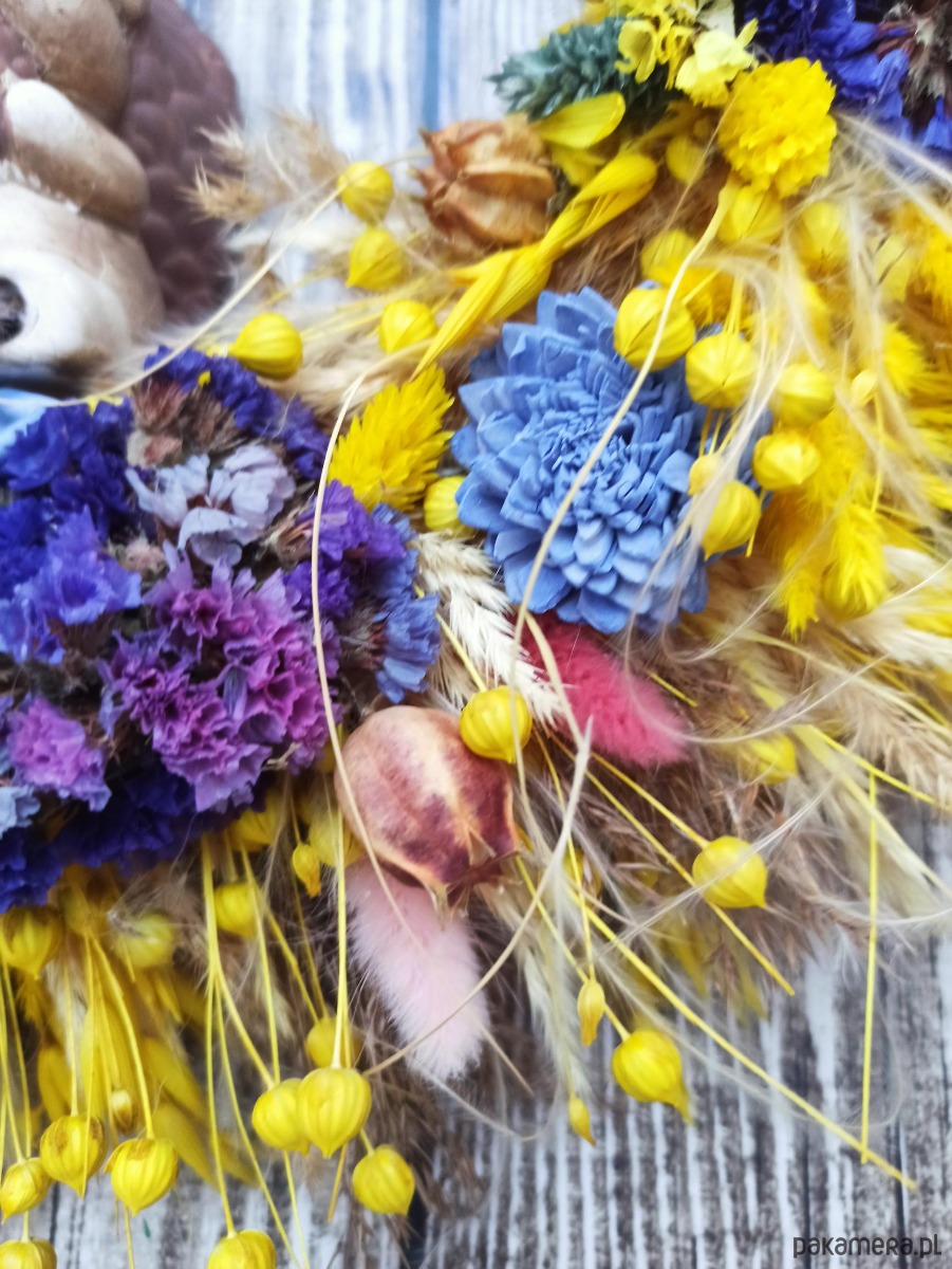 Unikatowy wianek wykonany z suszu, jest wyjątkową i ekologiczną dekoracją drzwi wejściowych, symbolem powitania gości oraz zapowiedzią radosnej, uroczystej lub świątecznej atmosfery.