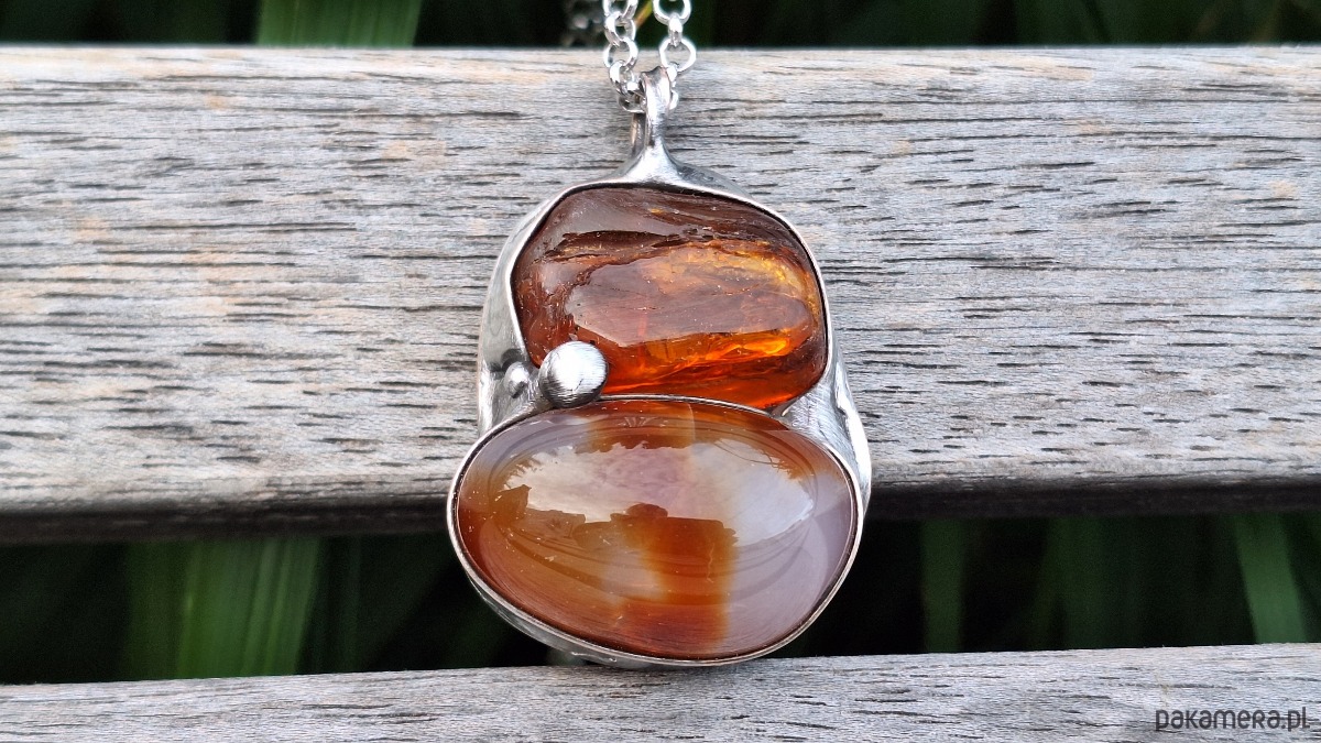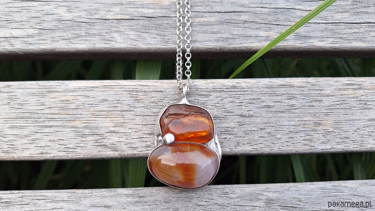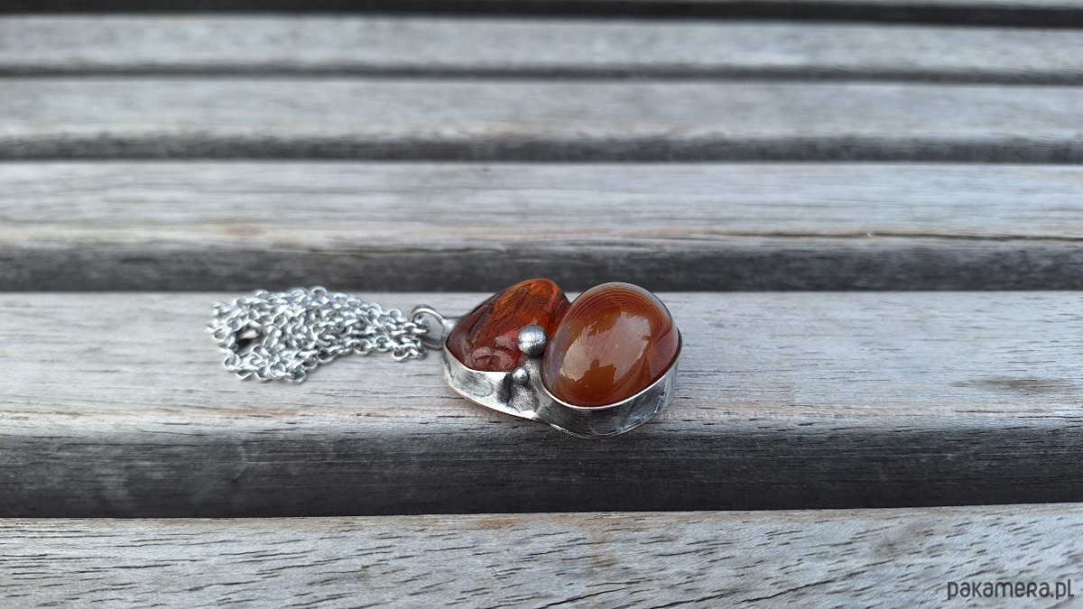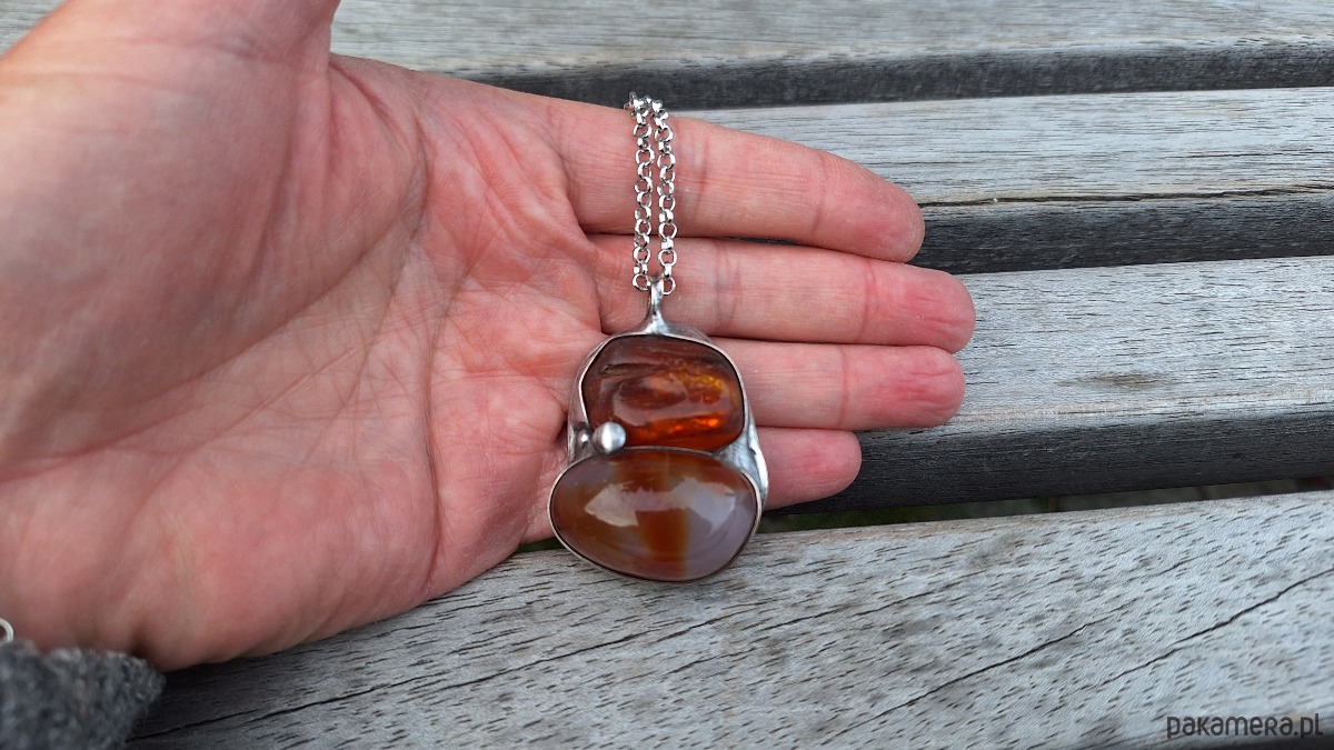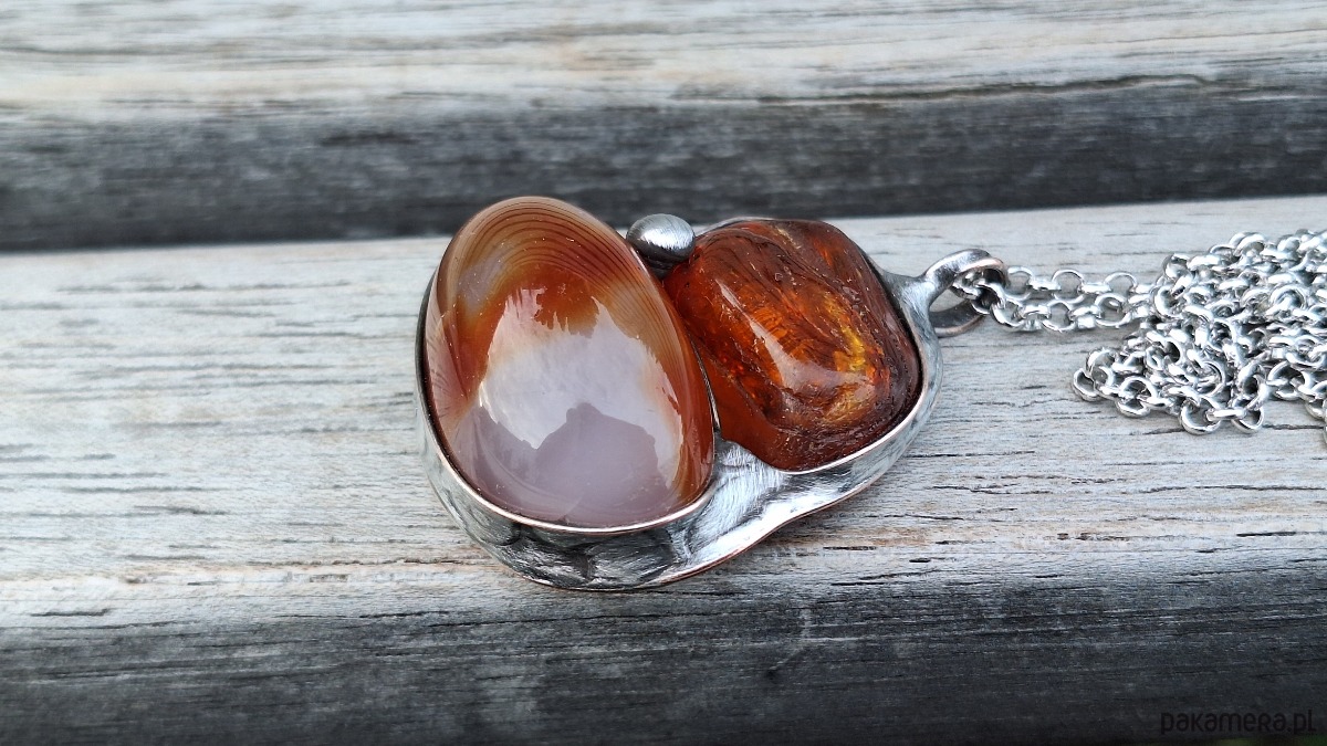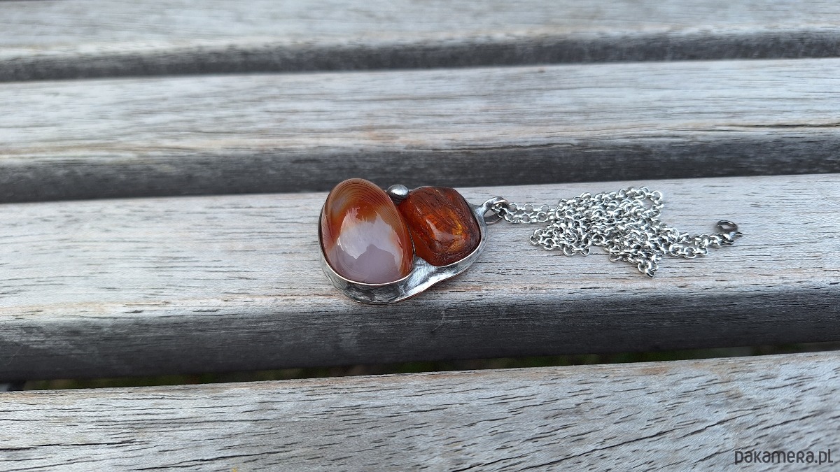 Wisiorek wykonany z miedzi, cyny, bursztynu i agatu. Wymiary ok. 4 na 3 cm. Zawieszony na łańcuszku o długości ok. 50 cm.
