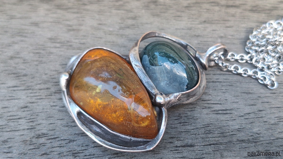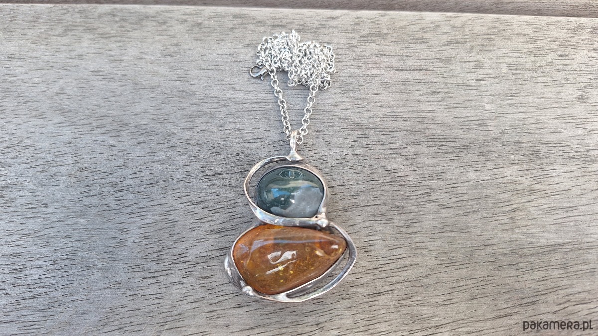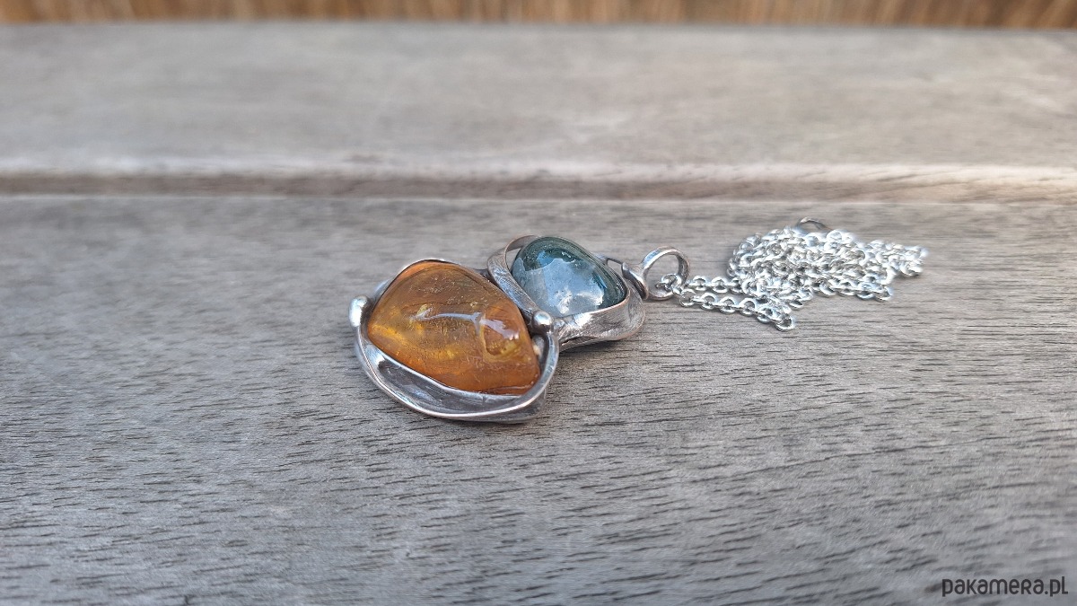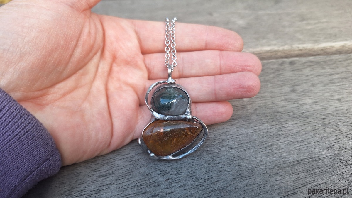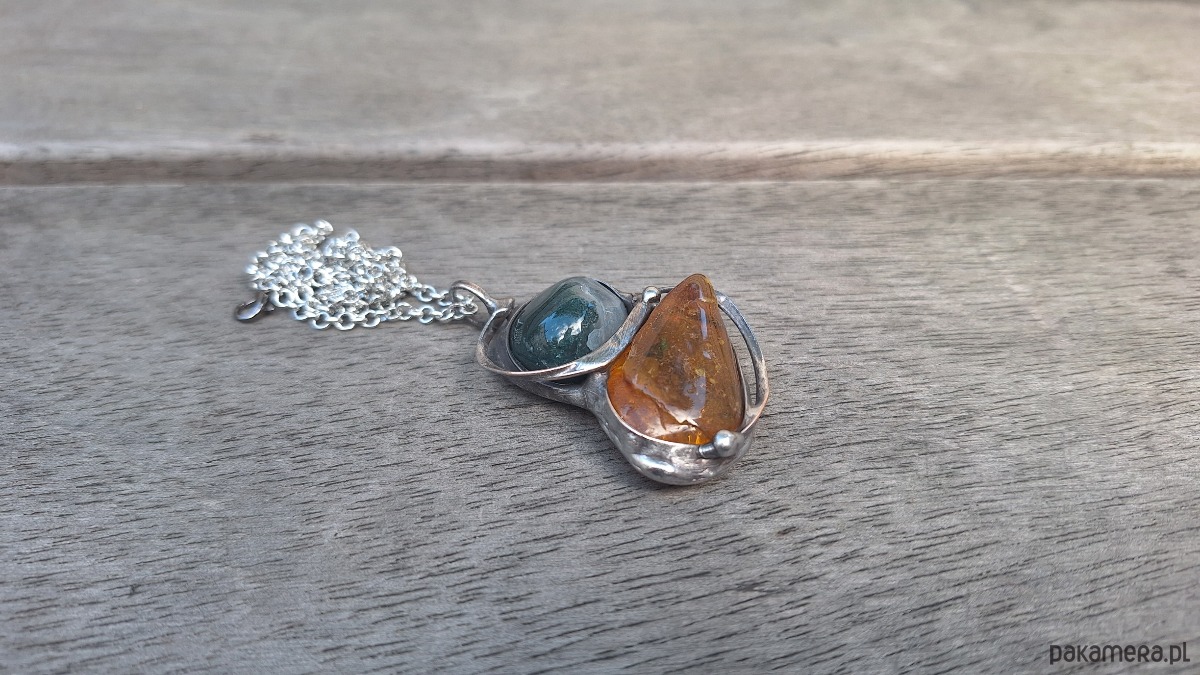 Wisiorek wykonany z miedzi, cyny, bursztynu i agatu. Wymiary ok. 4.5 na 3.5 cm. Zawieszony na łańcuszku o długości ok. 50 cm.