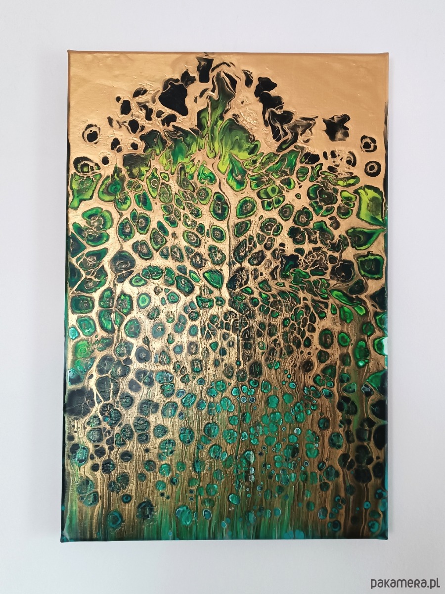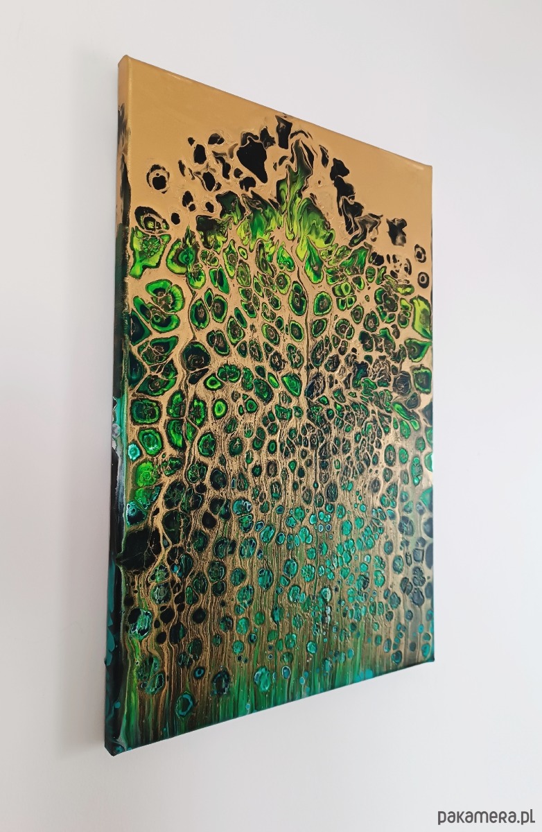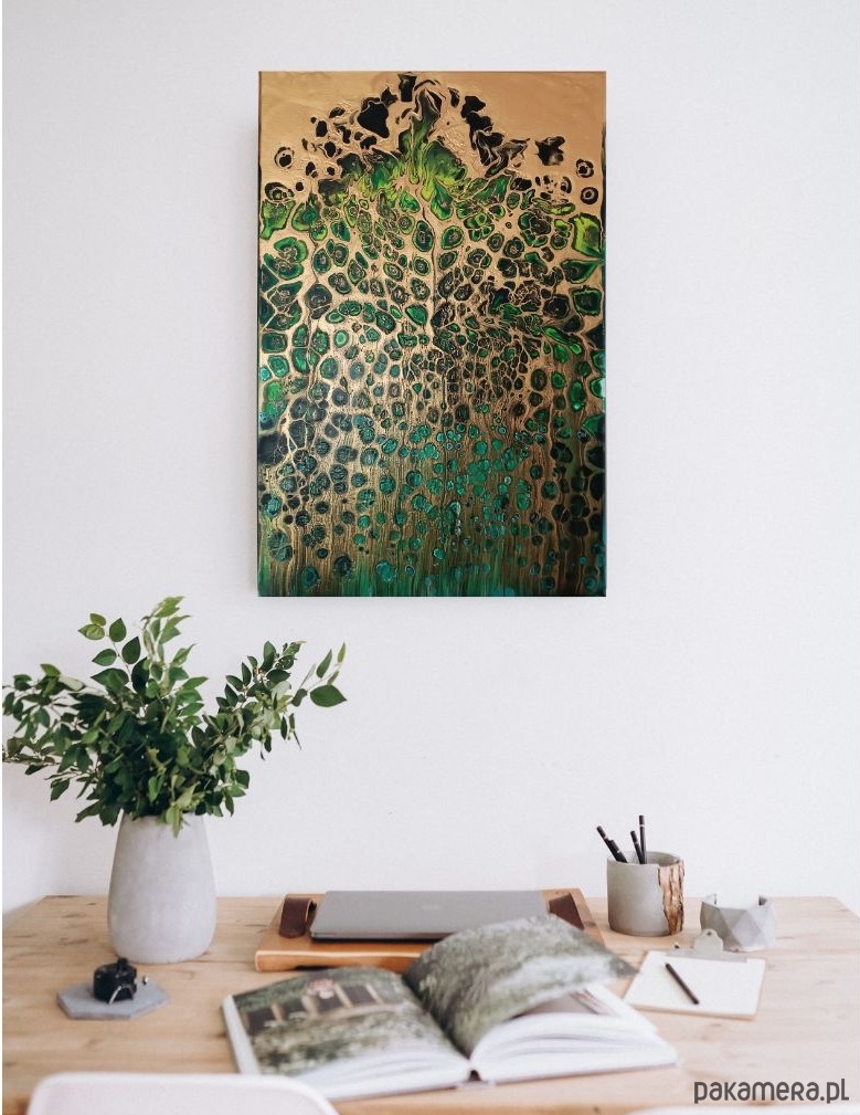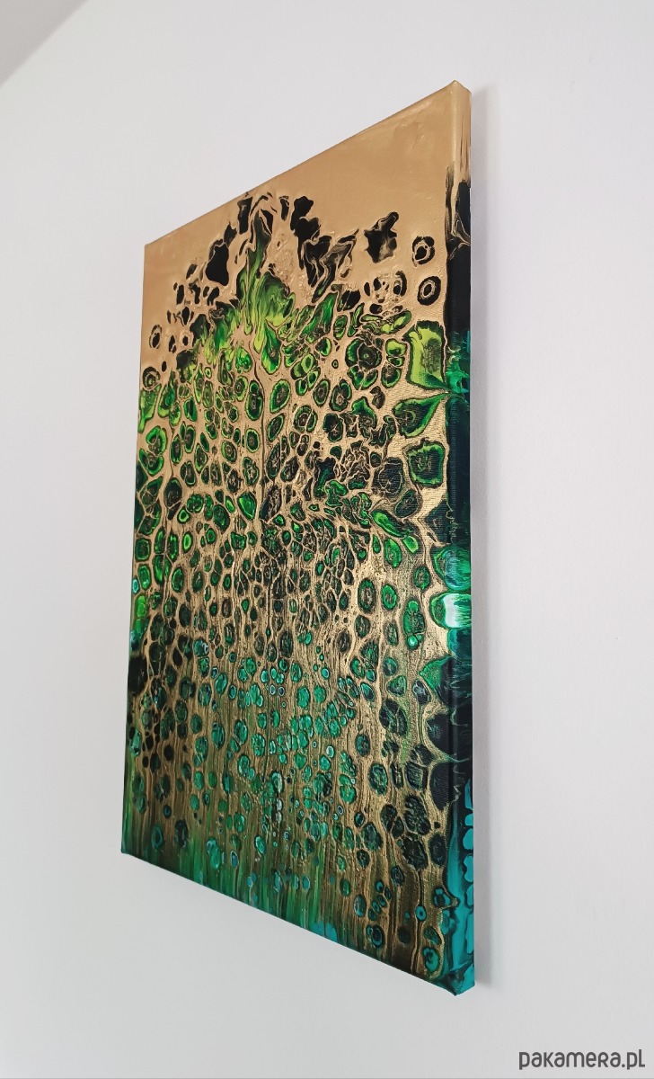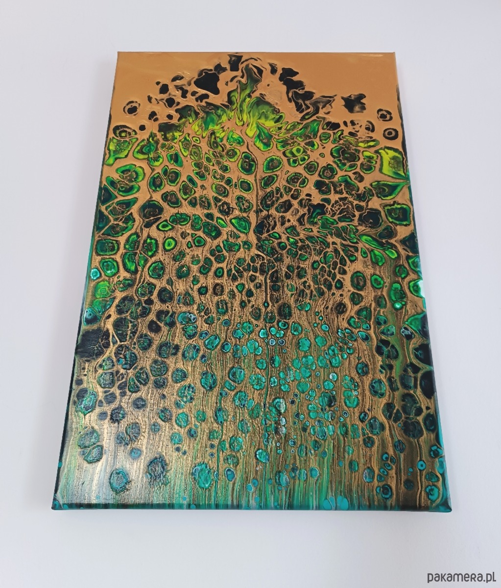 Obraz wykonałam techniką pouringu (swipe pour), farbami akrylowymi, na dobrej jakości podobraziu bawełnianym. Zabezpieczony werniksem satynowym. Sygnowany z boku podobrazia i z tyłu. Boki są przedłużeniem obrazu, gotowy do powieszenia bez ramy.
