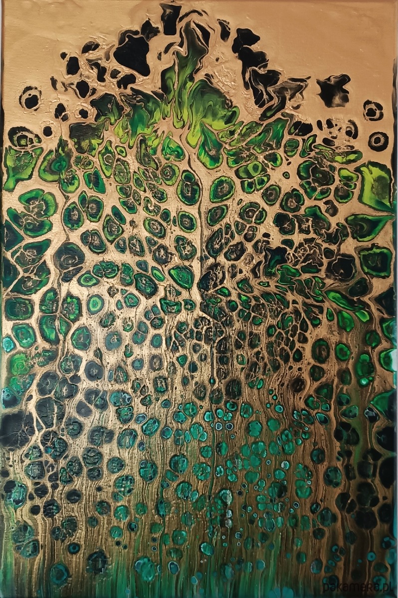 JESION. Seria "Duch Lasu". Obrazy z tej serii przenoszą patrzącego na łono Natury. Utrzymane w kolorach leśnych - odcienie zieleni, czerń i biel, z elementami odbijającego światło, metalicznego złotego.