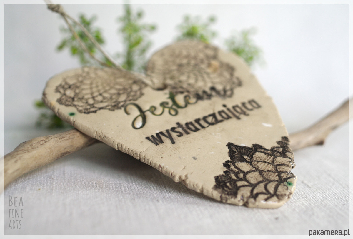 Śliczna zawieszka ceramiczna w kształcie serca, z odbiciem koronek i tekstem - afirmacją "Jestem wystarczająca". Ozdobi Twój dom lub będzie oryginalnym prezentem dla bliskiej sercu osoby.